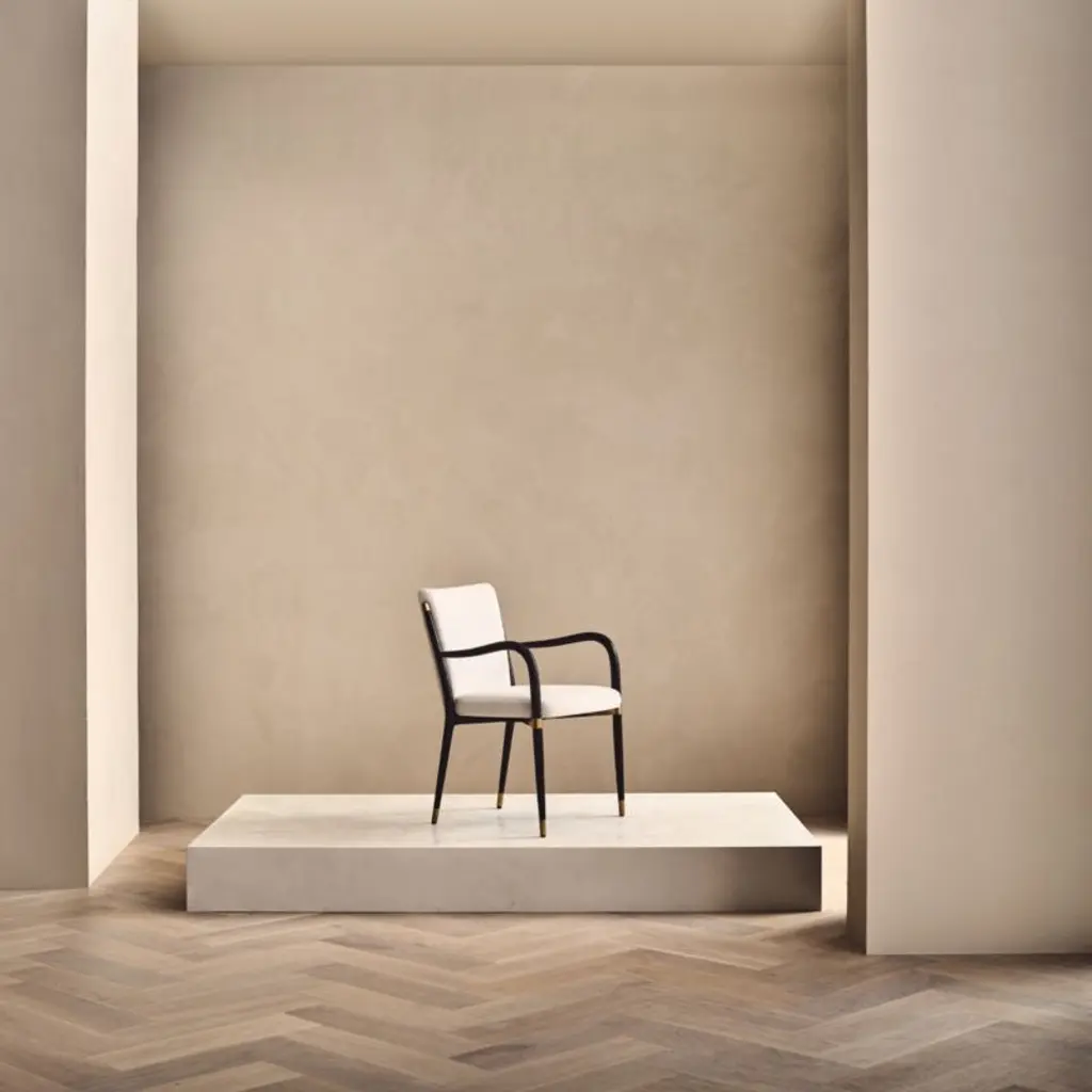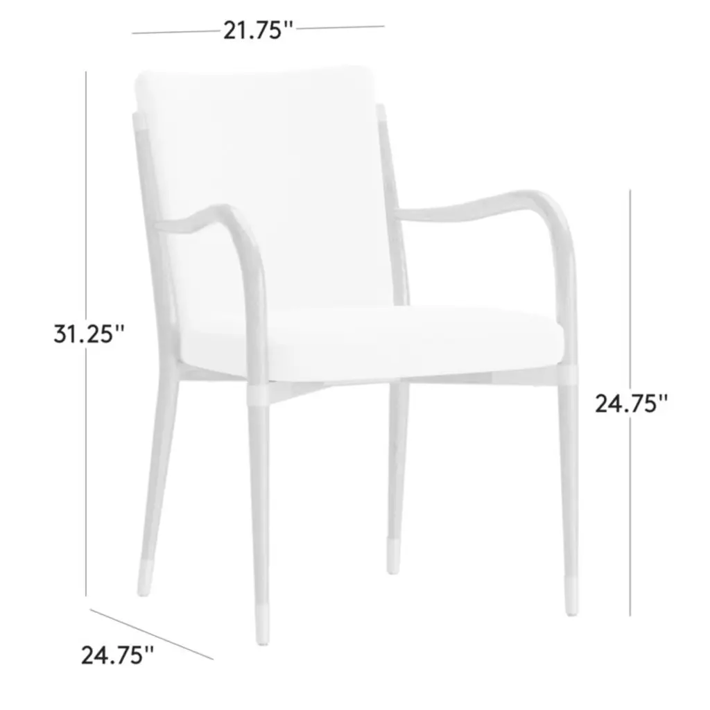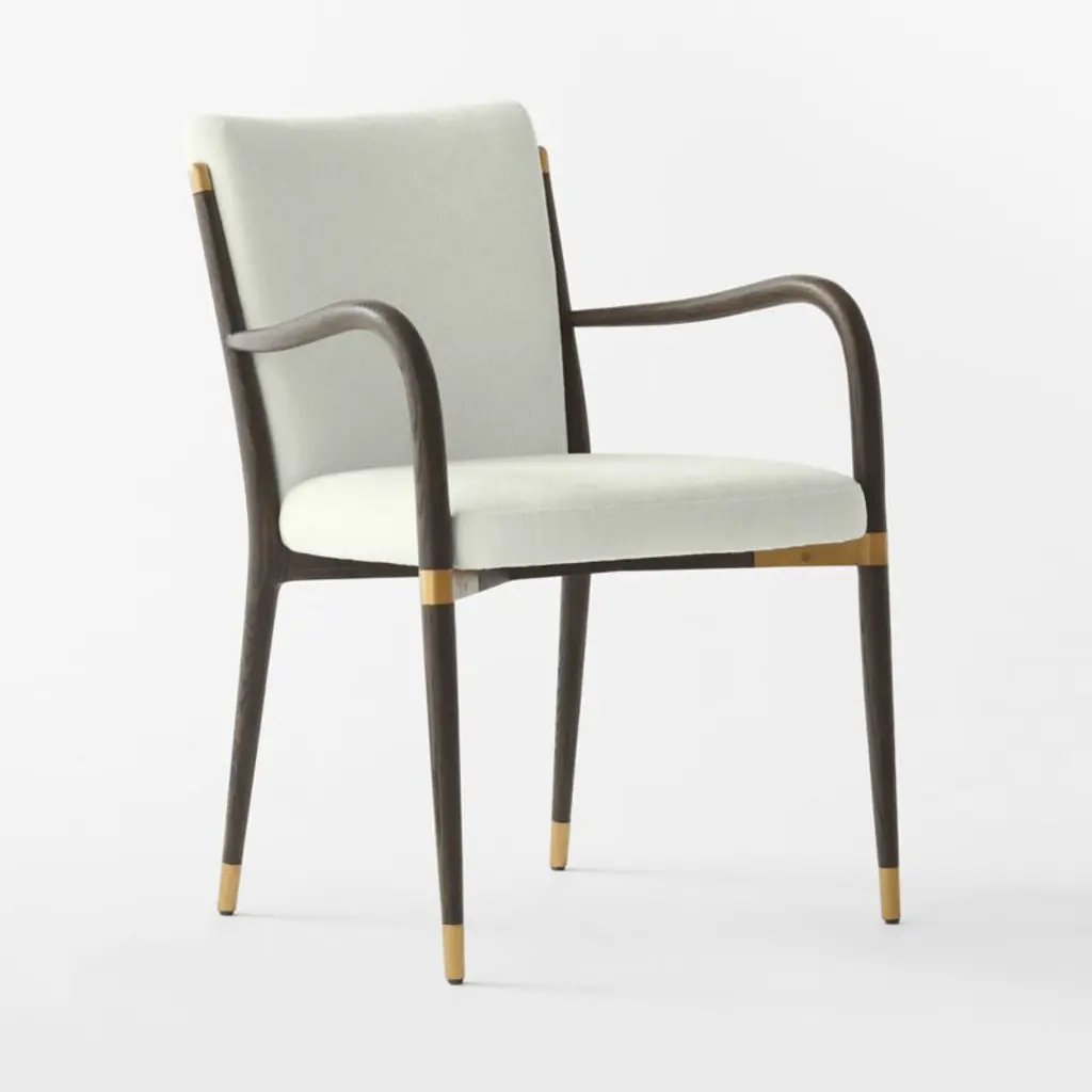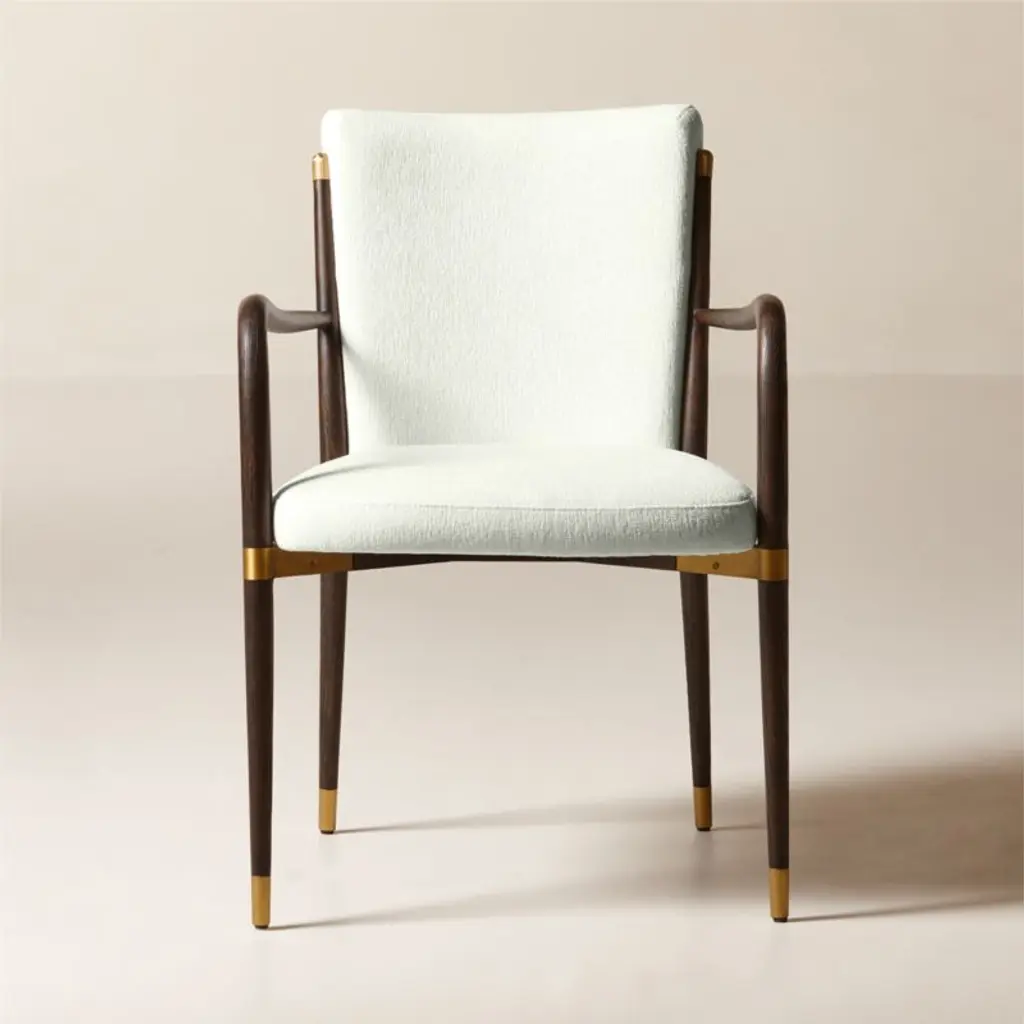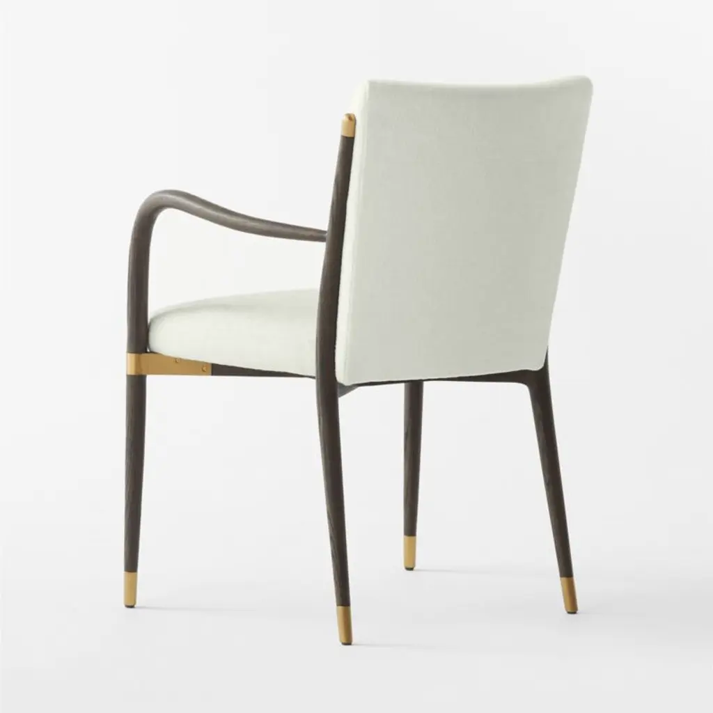 Refined white dining chair designed by Caleb Zipperer is crafted from solid red oak certified sustainable by the Forest Stewardship Council (FSC). The wood is turned on a special lathe to create a remarkably thin frame rarely seen outside of bespoke designs. To master the complex process, a team of skilled craftspeople make a small number of stools each day in three stages, finishing the look with warm brass accents to dress it up. White upholstery is full of soft, touchable texture with a performance finish that resists stains and spills with ease. CB2 exclusive.