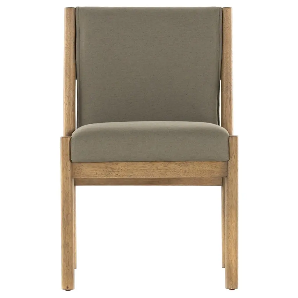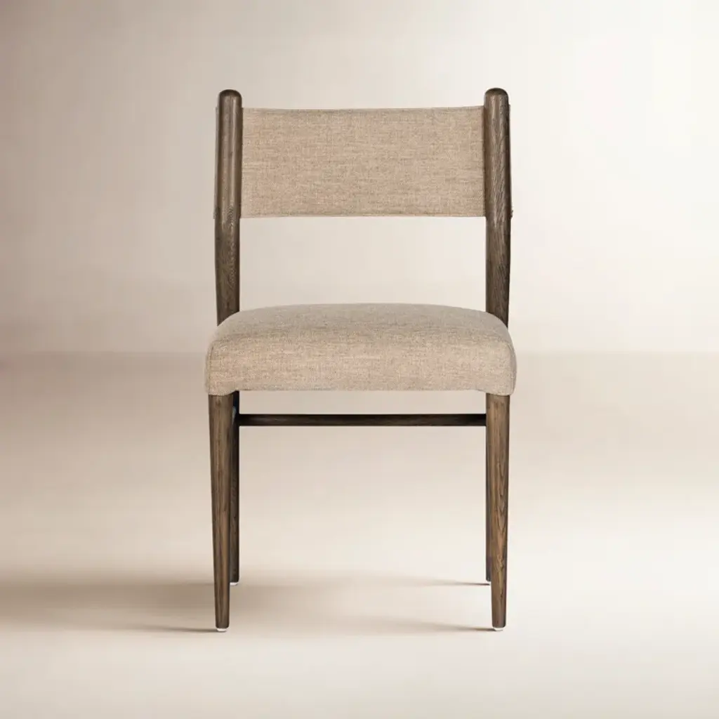 Seen in our Dusk finish, this endearing oak veneered upholstered side chair displays a charmingly upholstered backrest and seat for added comfort on tapered oak legs joined by supportive stretchers.