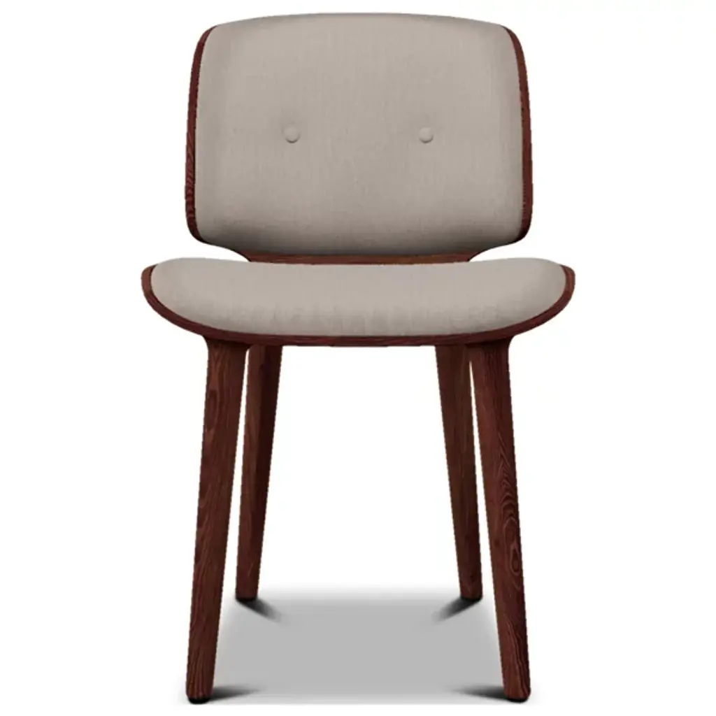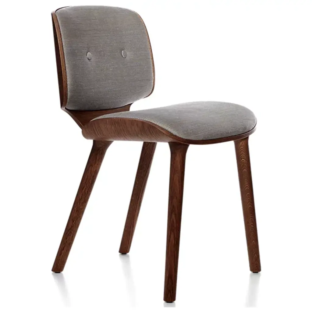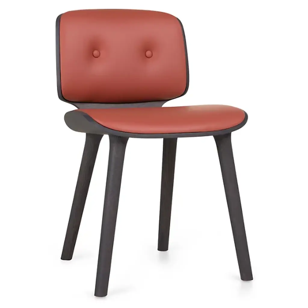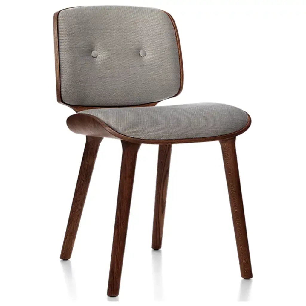 A kernel of comfort. The Nut Dining Chair from Moooi sits at the core of one's dining experiences as a balanced, embracing design. Creator Marcel Wanders Studio seeks to bring the human touch back to design in a new age approach reuniting designer, craftsperson, and user. The craftsperson's impact is felt with a group of sculpted legs that creates a relaxed tone. A bent plywood seat shell on top beautifully outlines the upholstery with a contrasting color. Charming in its button tufts, the upholstered cushioning hugs the body with a minimal profile.