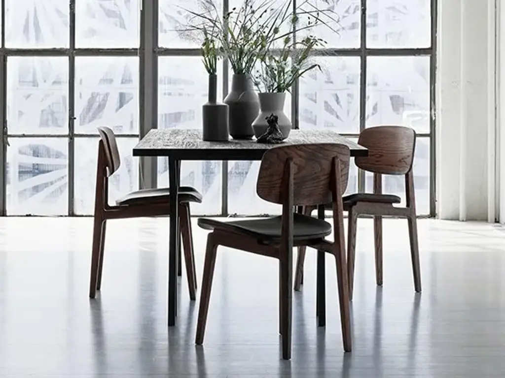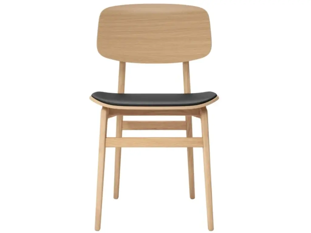 NY11 is an oak chair with integrated cushion.Inspired by traditional Danish elementary school chairs, the NY11 Dining Chair has a frame hand-crafted from solid oak and a seat of laminated oak veneer. The Chair came to life when designers Rune Krøjgaard and Knut Bendik Humlevik went on a mission to create a modern take on the Scandinavian dining chair. Just like a school chair it had to be both comfortable and very durable. The result is a simple and honest chair with a timeless expression.The visible grains in the chair’s structure emphasise the quality of the materials and give it a natural appearance.The NY11 Chair has a frame of hand-crafted solid oak and seat and back of laminated oak veneer. The seat is available with and without leather upholstery for increased comfort. Frame: Natural, Dark Stained, Black, Smoked
