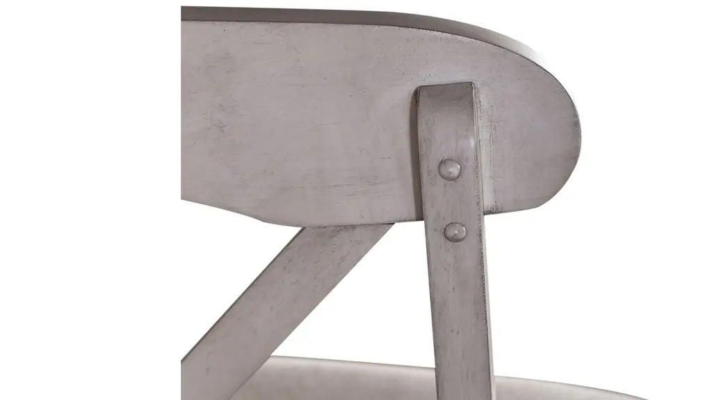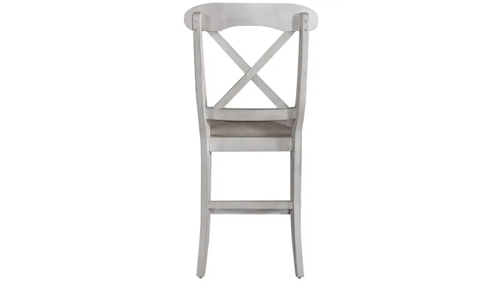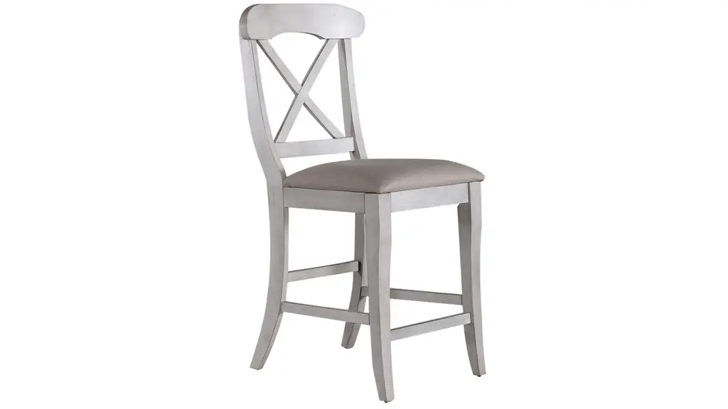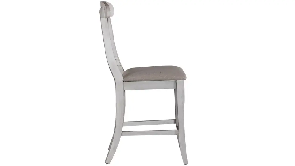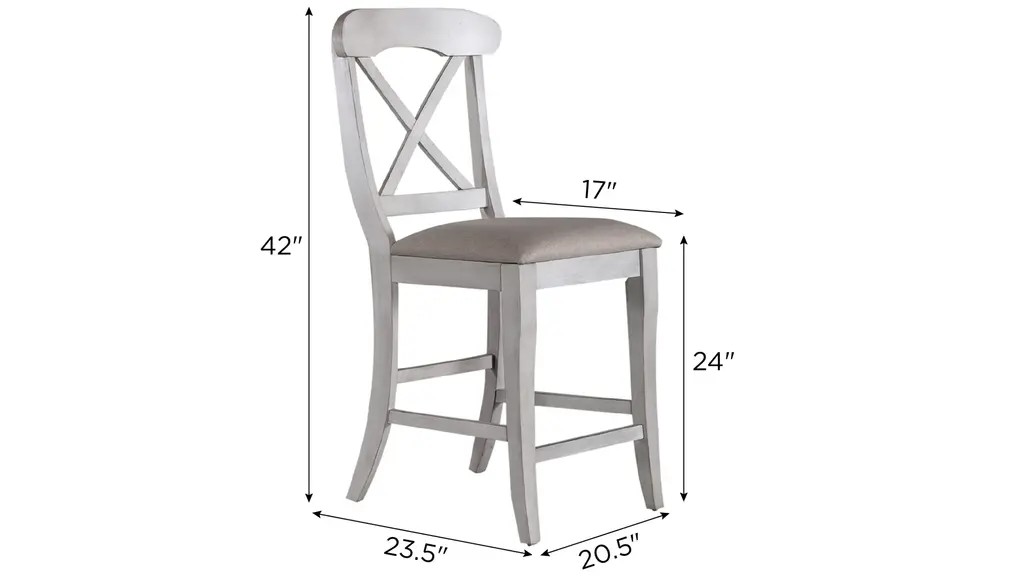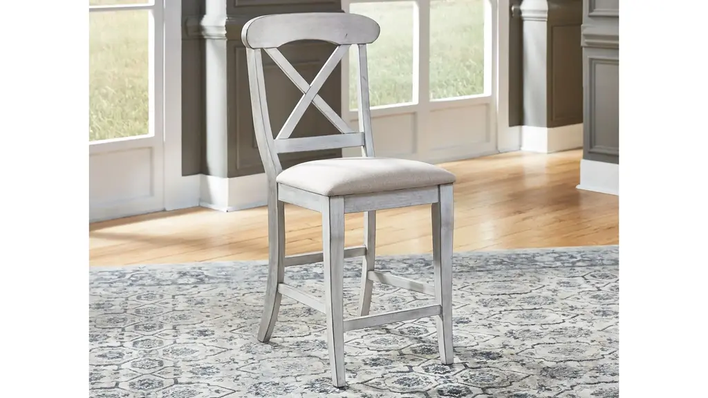 Sit in comfort and style with the Ocean Isle Counter Chair Set of 2. Crafted of rubberwood solids, this piece features an antique white finish, upholstery in grey linen, timeless napoleon styling, and is anchored by saber legs and nylon chair glides. This item is sure to be a great addition to any home. Elegantly styled and casually proportioned, this chair works in a dining room or kitchen dining combination effortlessly.