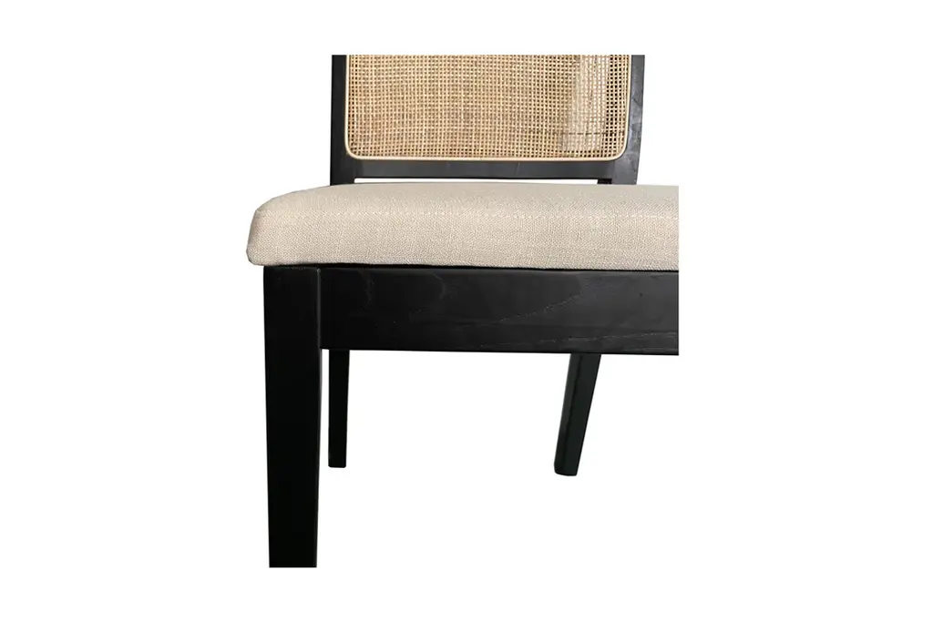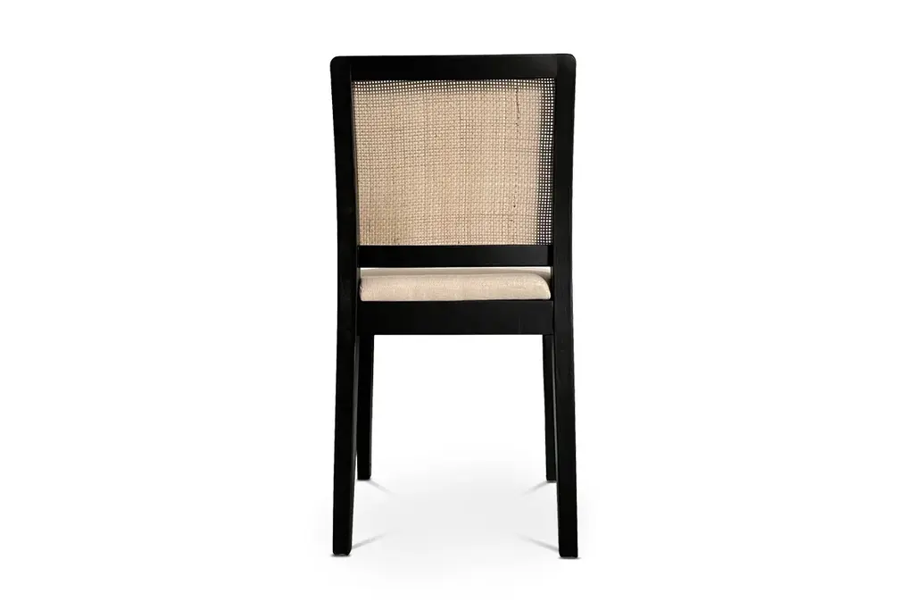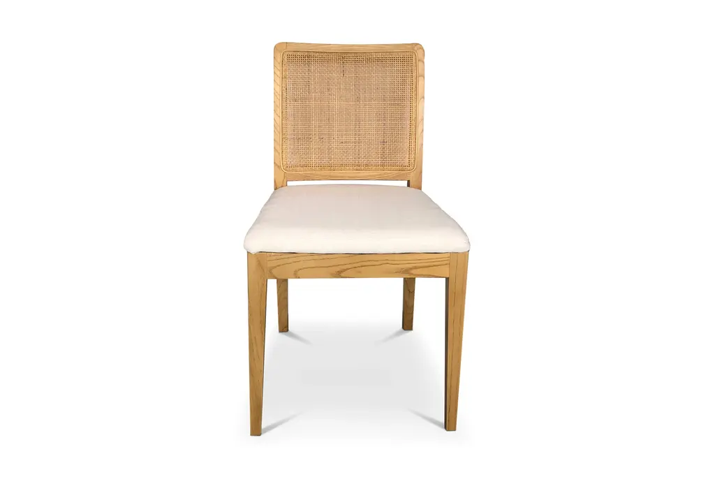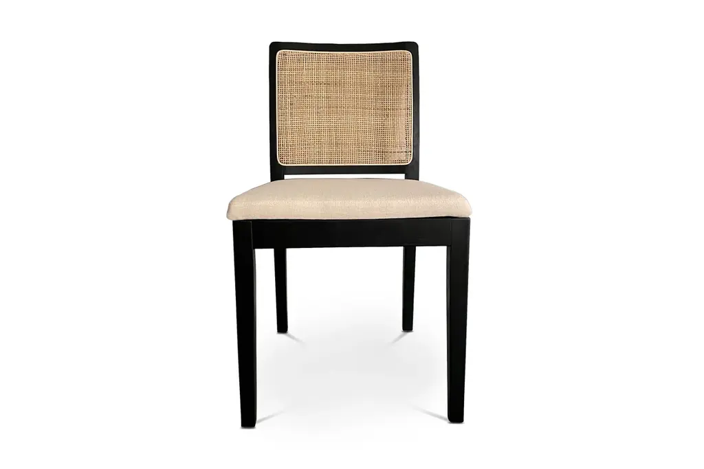 With its timeless natural rattan backrest, the Odette Dining Chair blends well into a wide range of motifs. Choose from natural or black solid elm wood with 100% cotton white upholstery over foam. Perfect for the dining room or breakfast nook, or place Odette Chairs in a living space for ample seating when guests arrive.