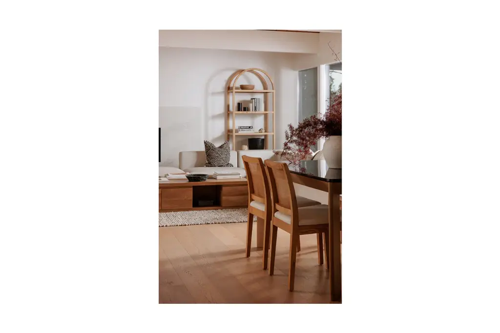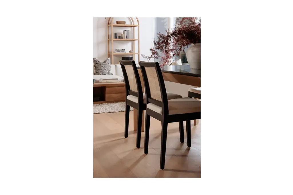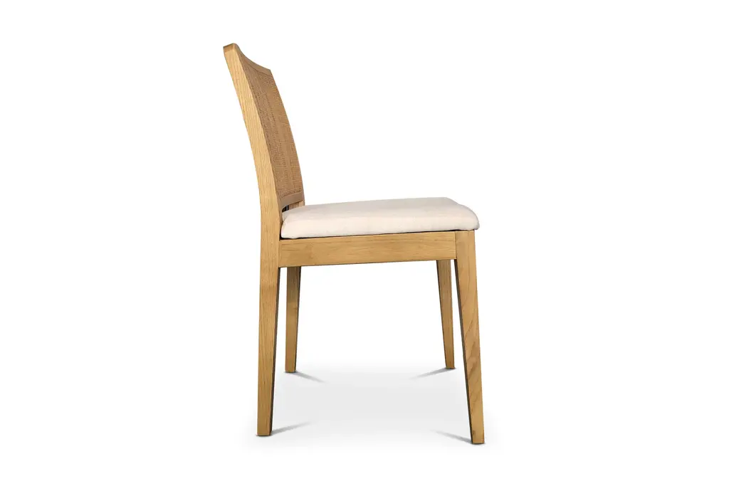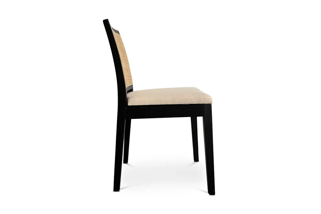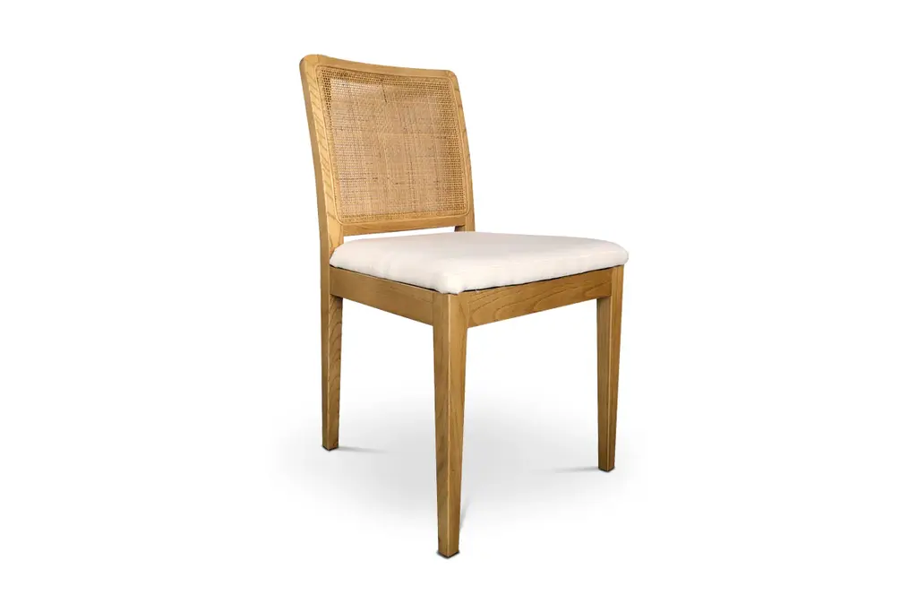 With its timeless natural rattan backrest, the Odette Dining Chair blends well into a wide range of motifs. Choose from natural or black solid elm wood with 100% cotton white upholstery over foam. Perfect for the dining room or breakfast nook, or place Odette Chairs in a living space for ample seating when guests arrive.