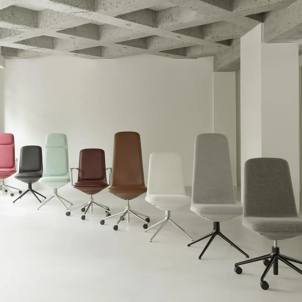 A versatile lower-back version joins Normann Copenhagen’s refined task seating range Off, with its smoothly contoured silhouette masking its inner mechanics. Combining functionality and comfort, the chair is constructed from steel-reinforced rigid PU foam and completely upholstered, with a 4-star base in durable aluminum.