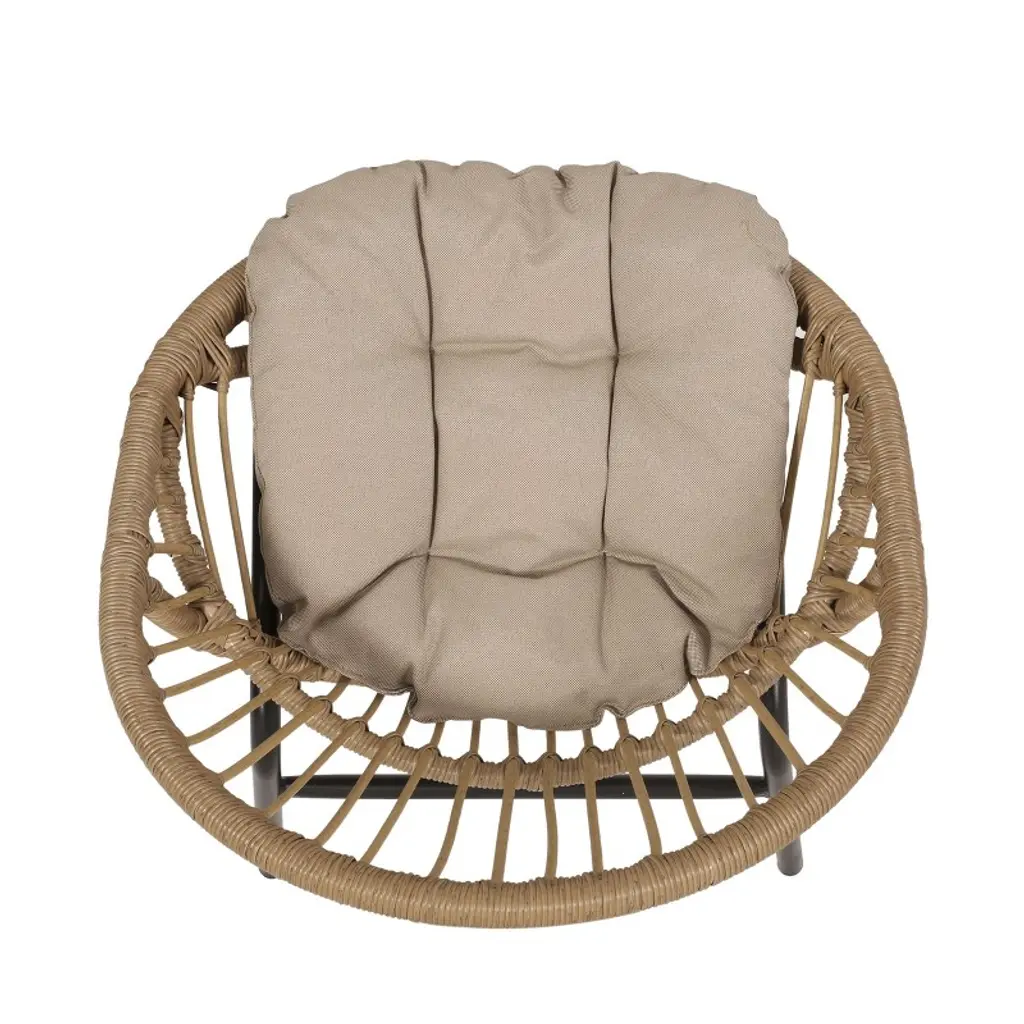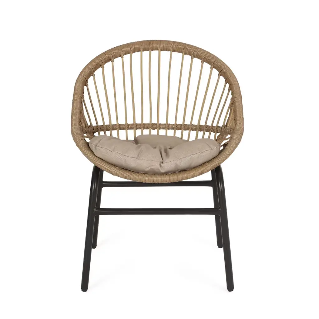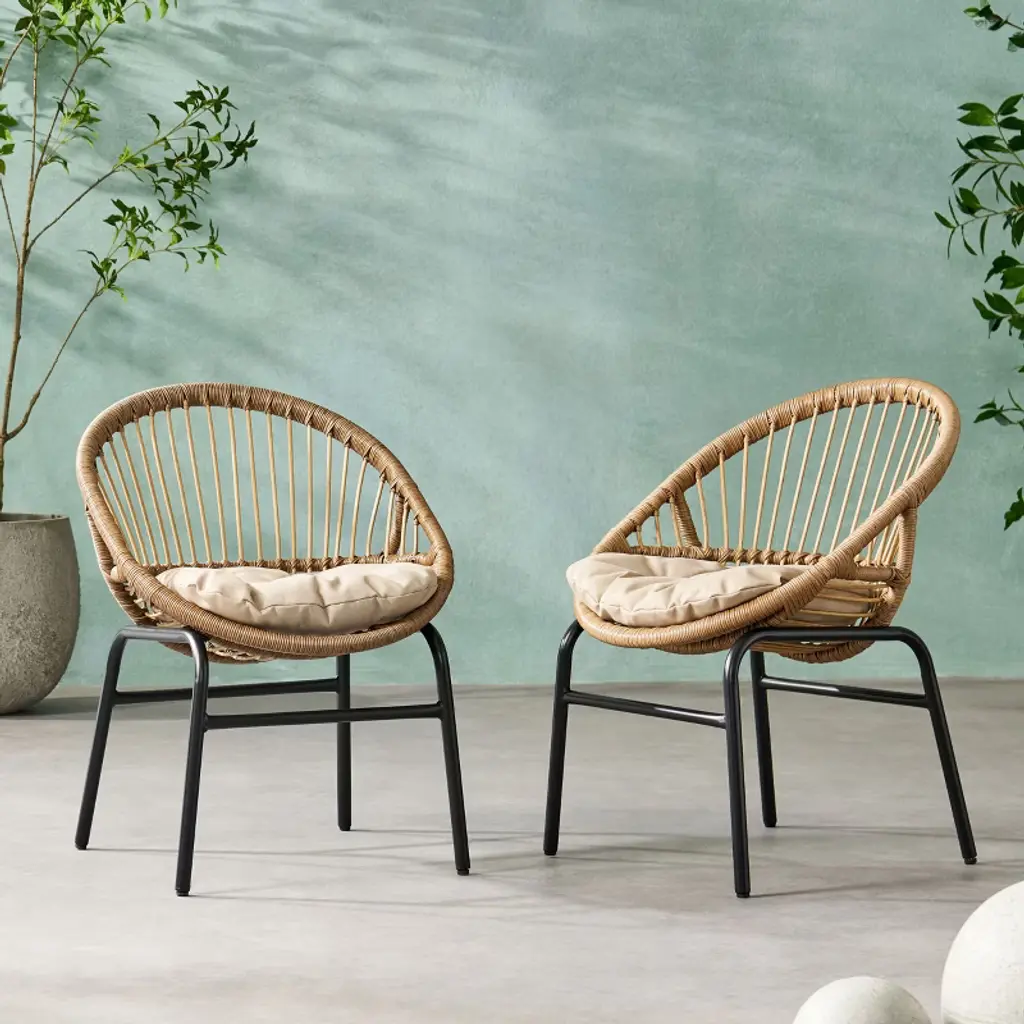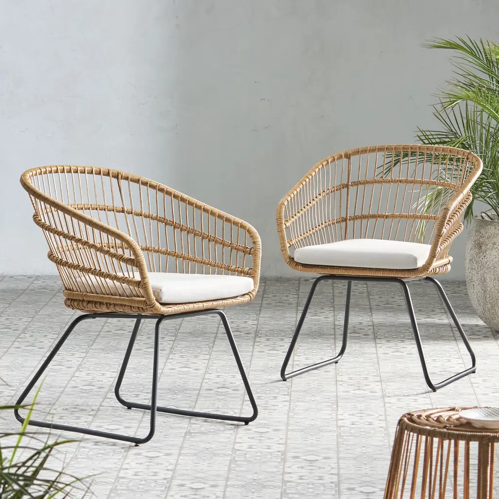 Elevate your patio dining area with this elegant set of dining chairs that combine streamlined style with lasting durability. Featuring sturdy basket frames wrapped in beautiful wicker and supported by sleek metal bases, these chairs offer both comfort and sophistication. Their gently curved backrests and textured design bring a touch of boho charm that seamlessly complements any outdoor décor.Finished with tufted, water-resistant cushions, this set ensures effortless relaxation all summer long. Perfect for creating a stylish and inviting dining space, these chairs blend function and fashion with ease.