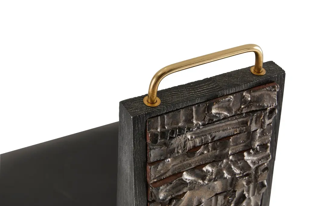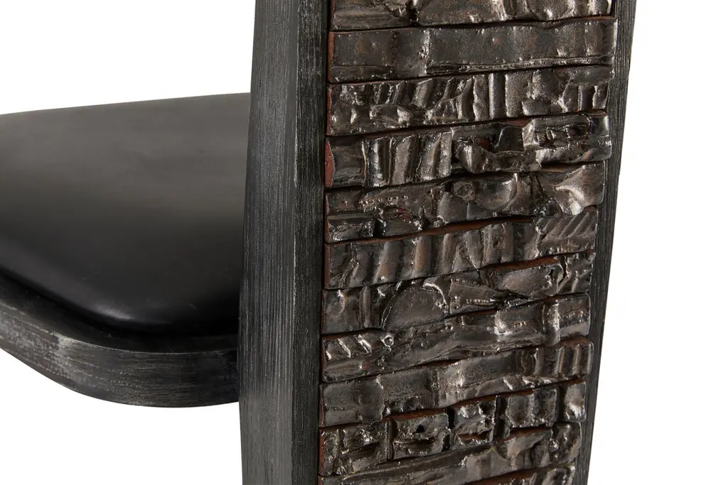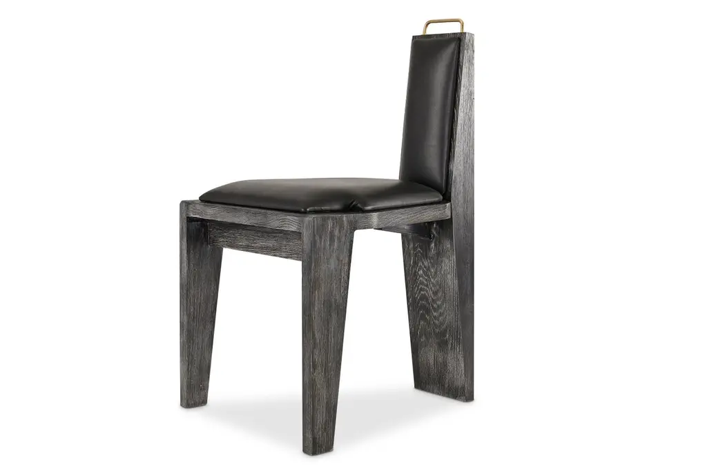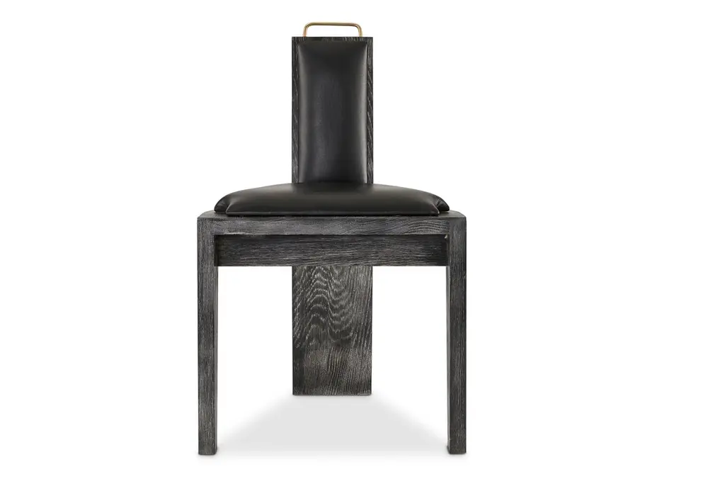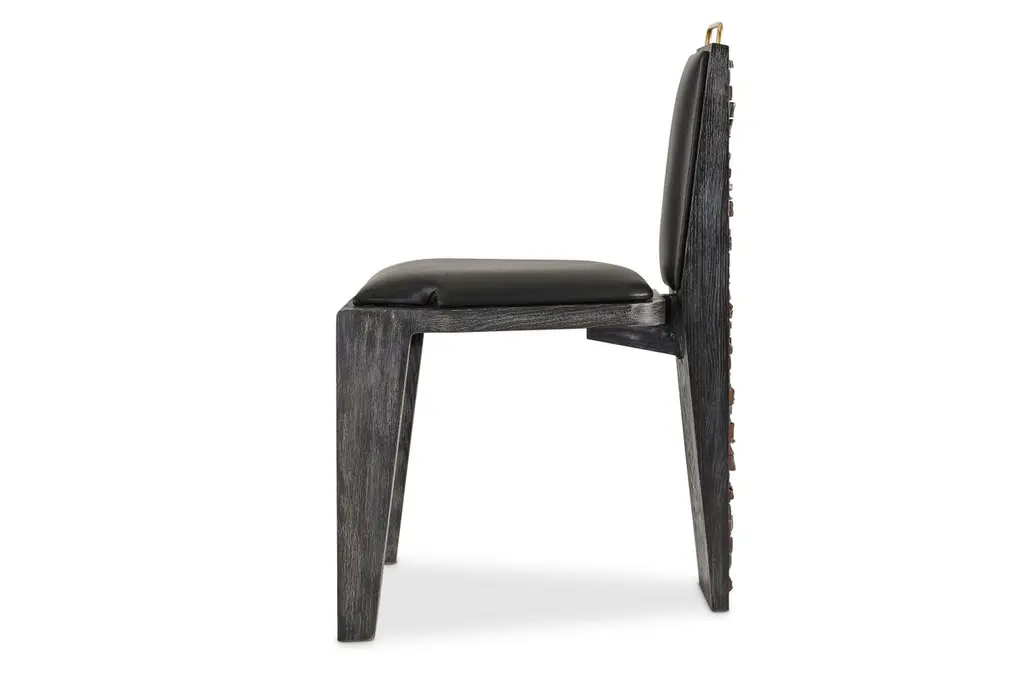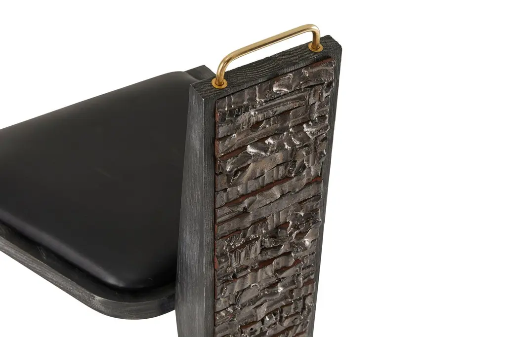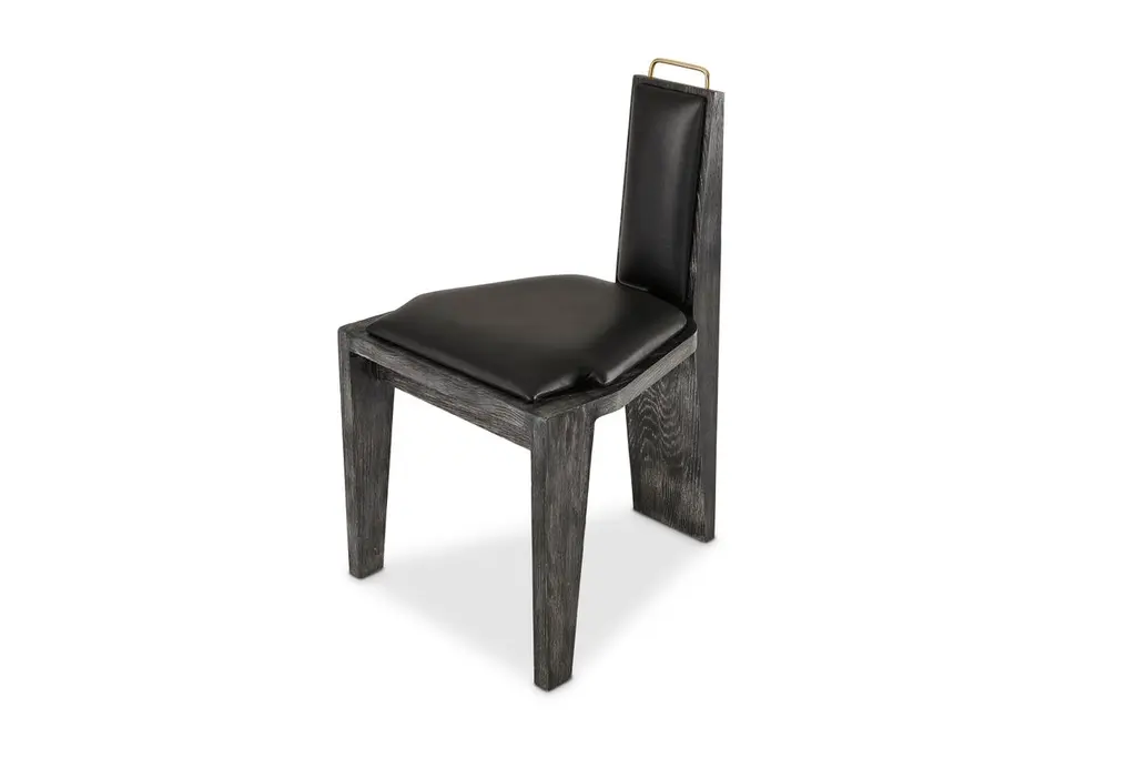 Olifant black dining chair by Egg DesignsDimensions: 50 L x 53 D x 84 HMaterials: Ceramic, brass handle, black cerused oak, leather upholsteryFounded by South Africans and life partners, Greg and Roche Dry - Egg is a unique perspective in contemporary furniture inspired with a soul that’s deeply rooted in the African continent.We believe Egg has a distinctive African design dialect.We dream that our products will not only be judged by their function and form, but by the beauty of their eternal narrative.In everything we create we must answer the question, “Is it Egg enough?”Egg, is a spirited blend of heritage, passion, meaning and African soul. It stands the test of time. It’s curiosities that make you smile. It’s love and truth that can be seen from afar and equally found in the minutest details. That’s why every piece we craft comes from Africa and carries within it a part of the African soul. We’re a melting pot of tribal craft, African heritage and modern luxurious expression.“If it’s not Egg enough, it’s not worth doing!”We have widened the prism of contemporary African design in Modern Antiques, high-end Furniture, lighting and custom interiors inspired by an African provenance for a modern, international customer.