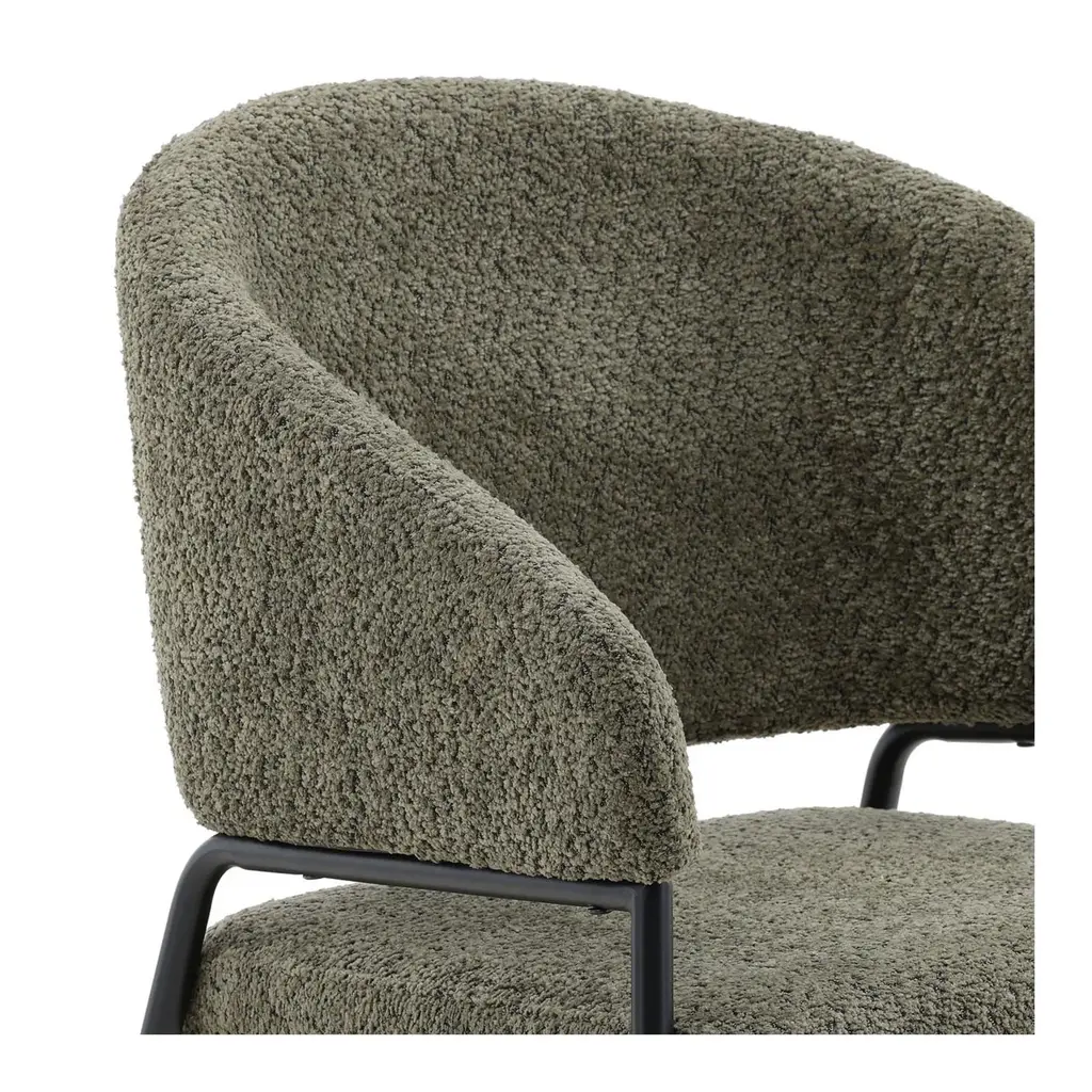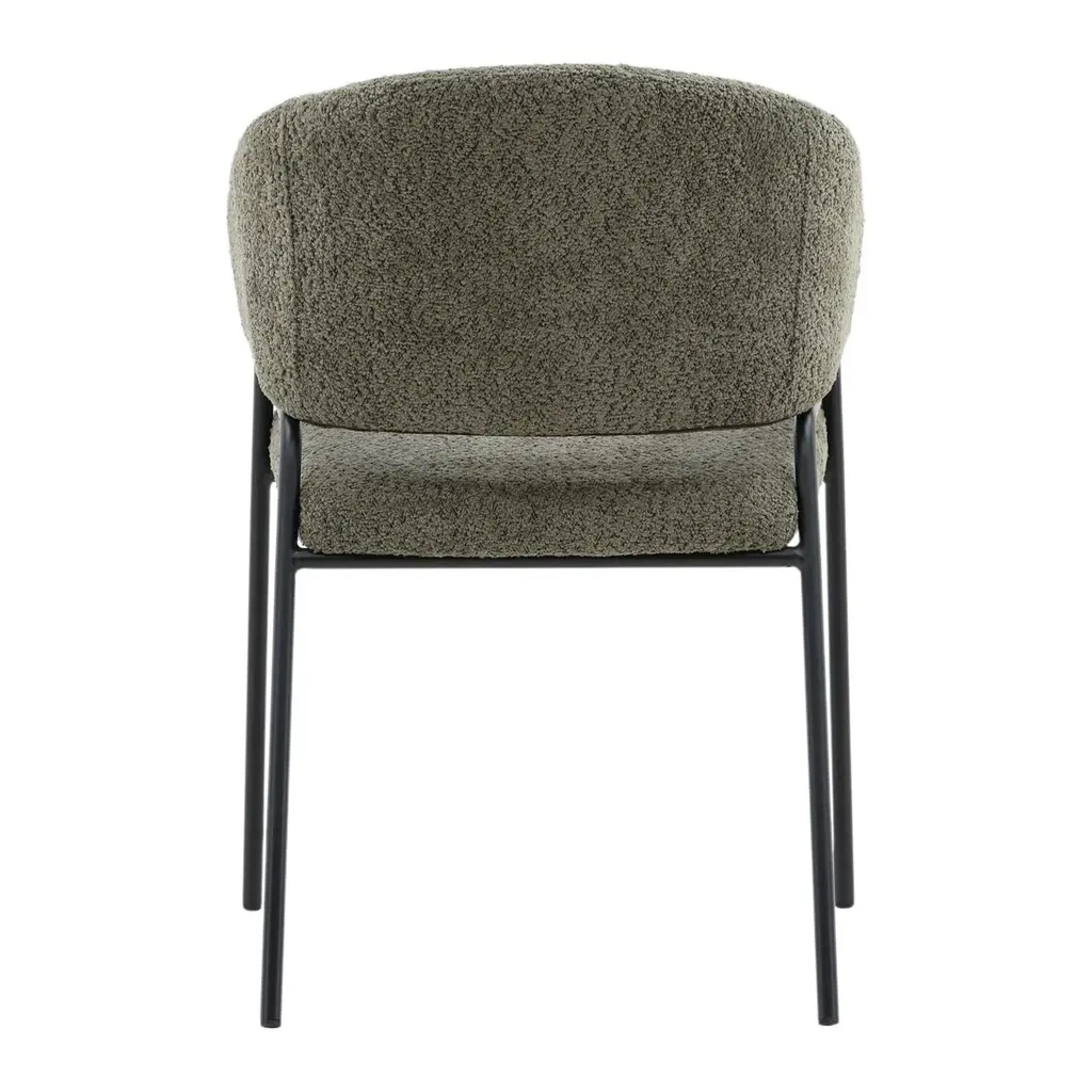 Soft olive boucle upholstered dining chair with black iron frame. Scoop back design into sloped arms for comfort and sleek style. Weighs approx. 16 lbs.