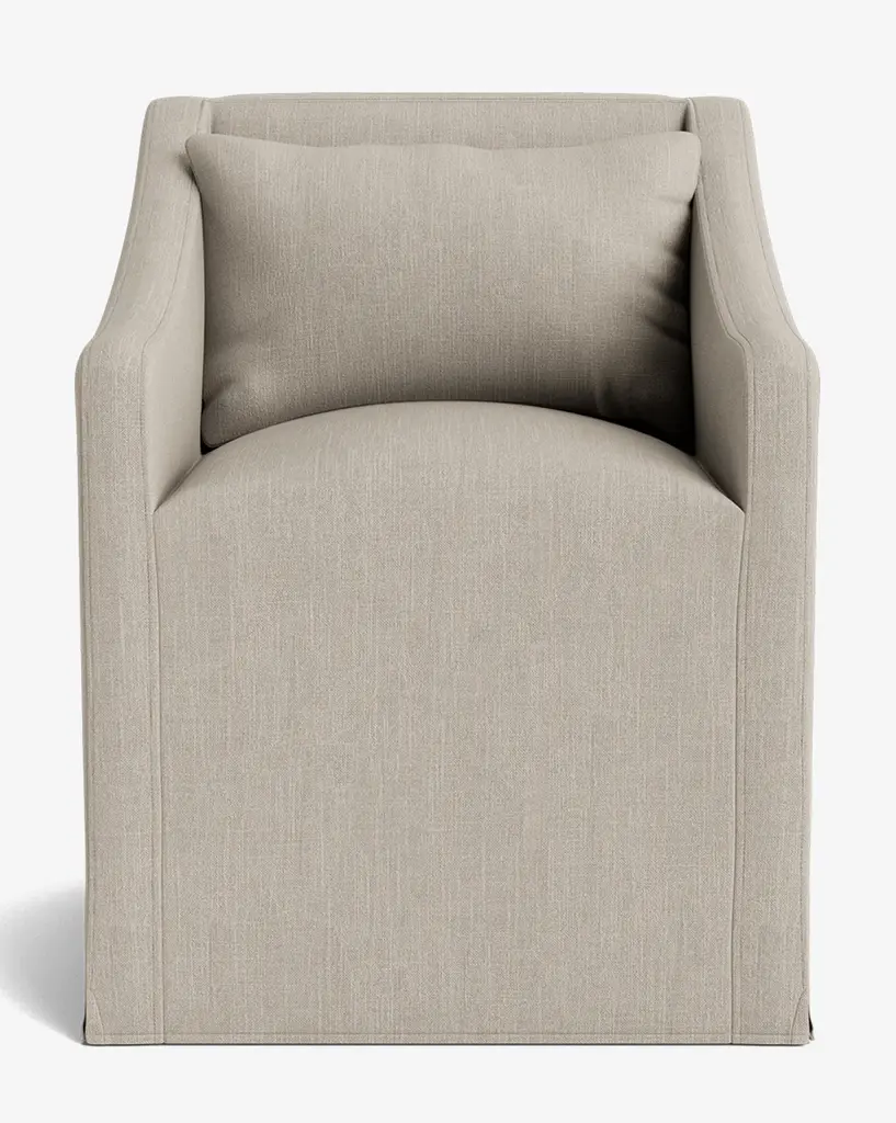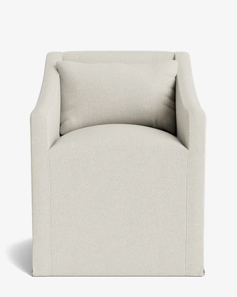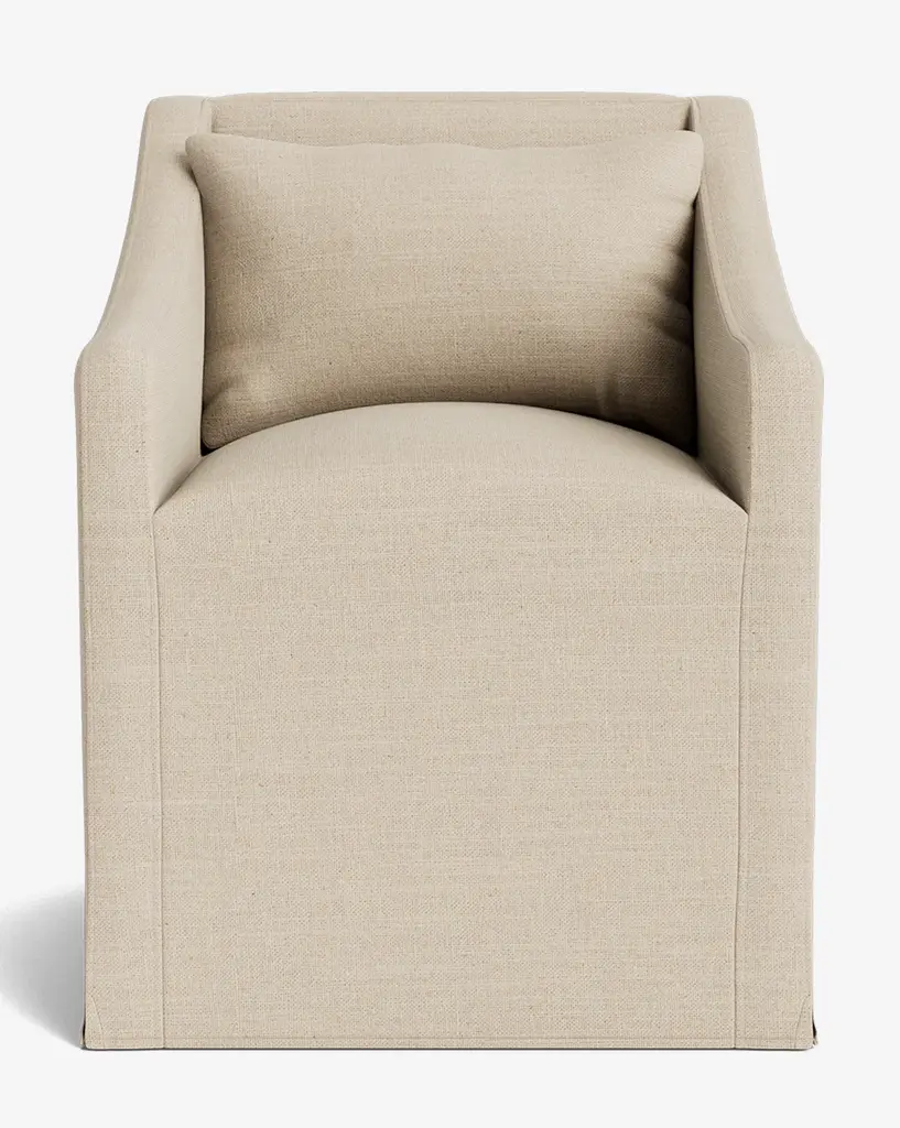 Classic and subtly dramatic, the Olivier Slipcover Dining Arm Chair is upholstered in your choice of beautiful high-quality fabric. Its back fluidly extends into its sloped armrests, creating an elongated look and elegant feel. With a cushion filled with a feather and down blend, this dining chair provides both comfort and elevated style.