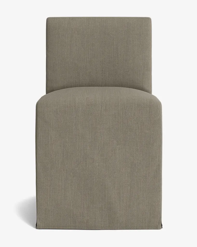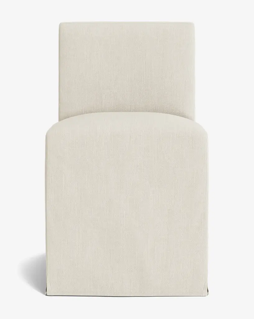 Classic and subtly dramatic, the Olivier Slipcover Dining Chair is upholstered in your choice of beautiful high-quality fabric. Its simple construction creates an elongated look and elegant feel. With cushions filled with a feather and down blend, this dining chair provides both comfort and elevated style.