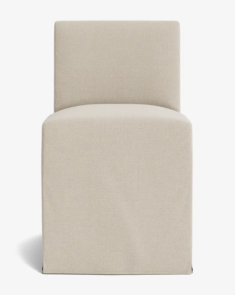Classic and subtly dramatic, the Olivier Slipcover Dining Chair is upholstered in your choice of beautiful high-quality fabric. Its simple construction creates an elongated look and elegant feel. With cushions filled with a feather and down blend, this dining chair provides both comfort and elevated style.