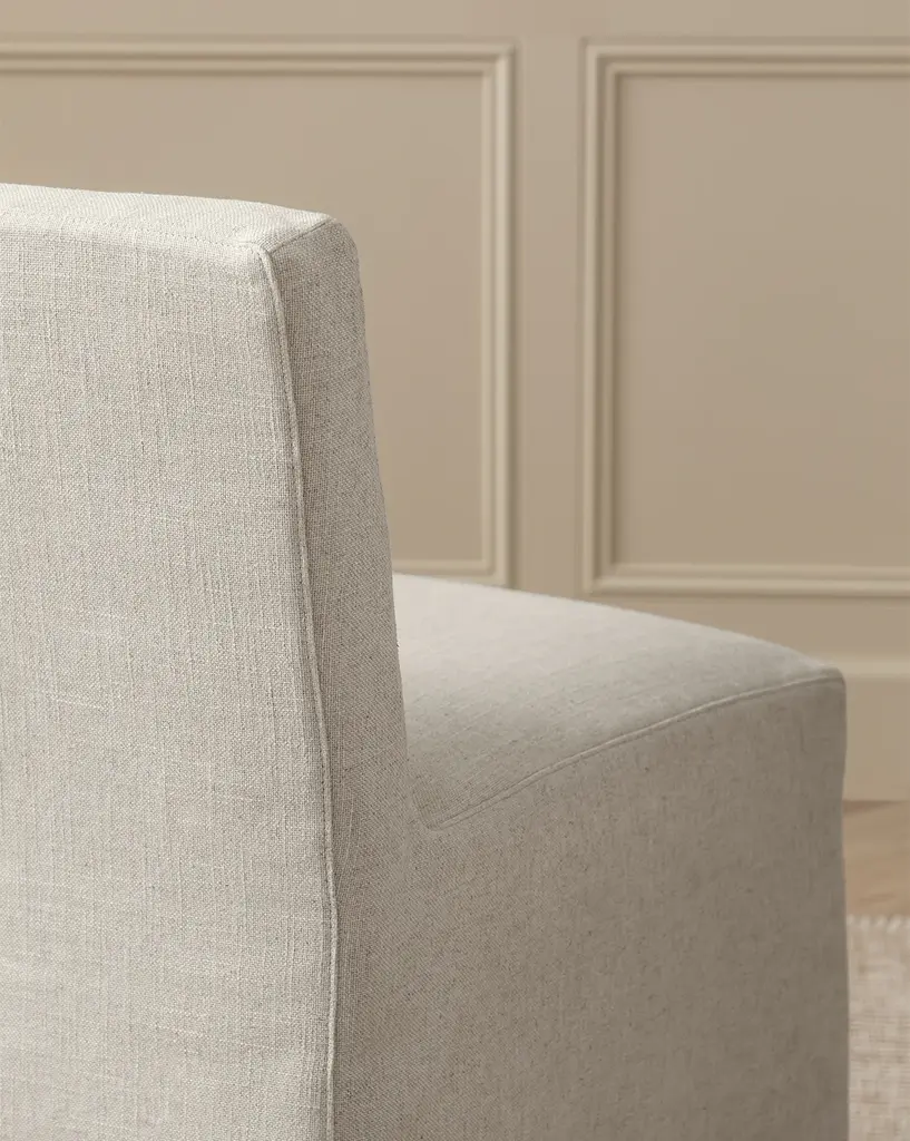 Classic and subtly dramatic, the Olivier Slipcover Dining Chair is upholstered in your choice of beautiful high-quality fabric. Its simple construction creates an elongated look and elegant feel. With cushions filled with a feather and down blend, this dining chair provides both comfort and elevated style.