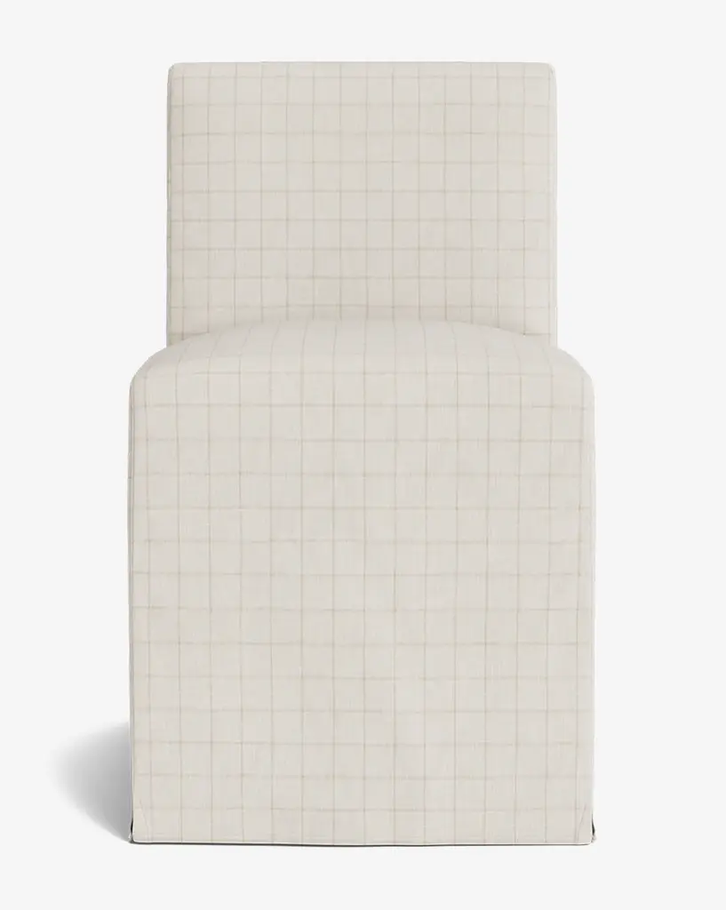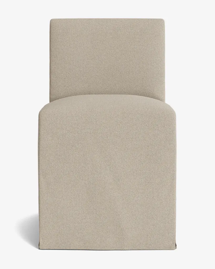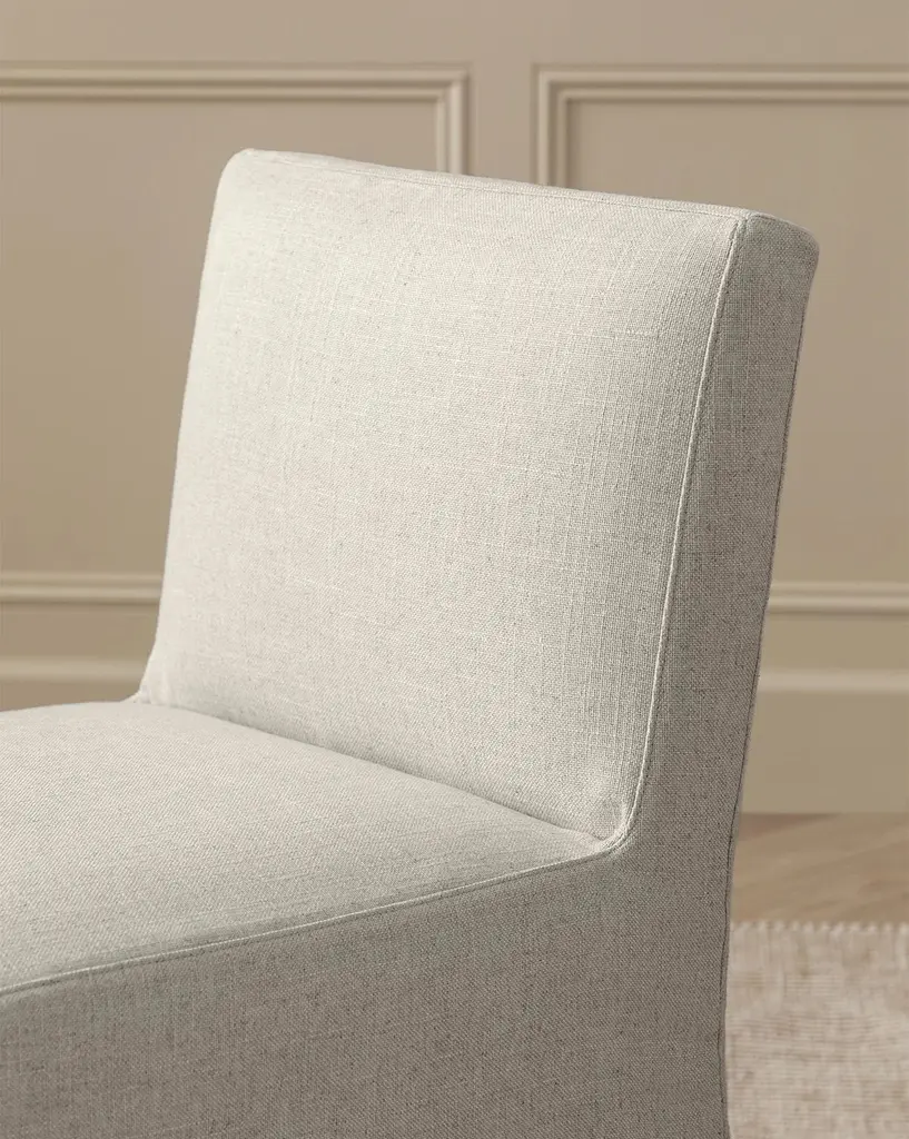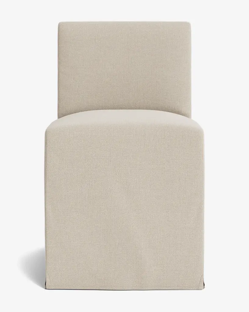 Classic and subtly dramatic, the Olivier Slipcover Dining Chair is upholstered in your choice of beautiful high-quality fabric. Its simple construction creates an elongated look and elegant feel. With cushions filled with a feather and down blend, this dining chair provides both comfort and elevated style.