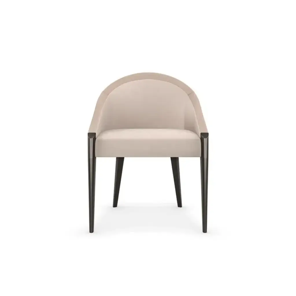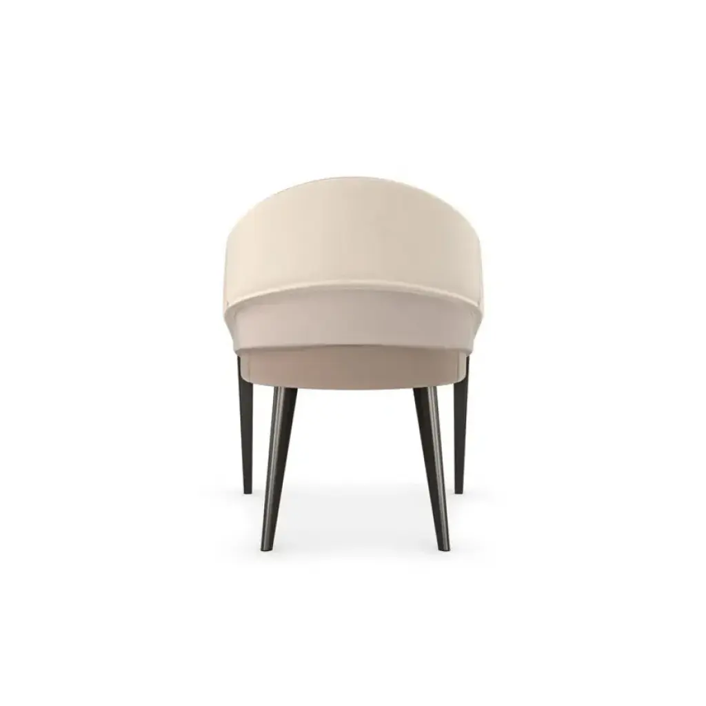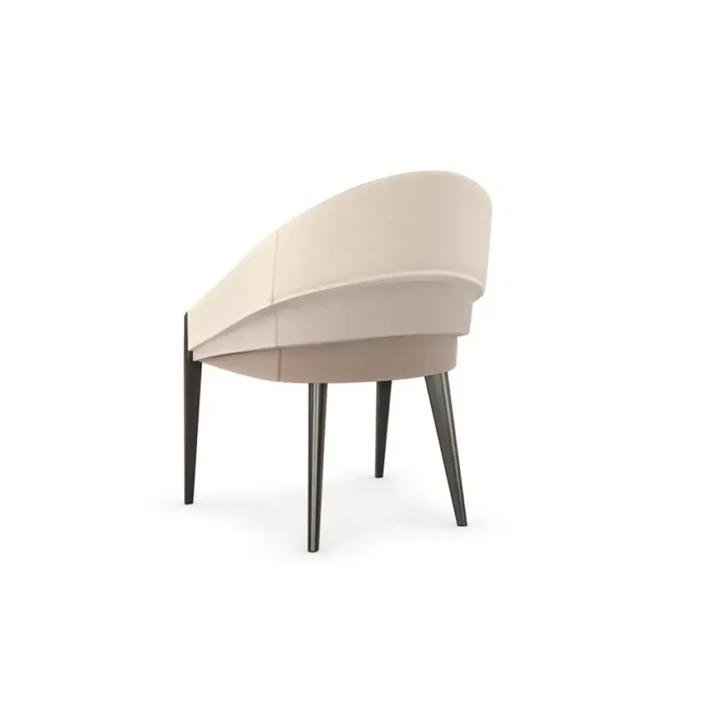 Creating a stepped ombre effect, a fan-fold of plush velvet in varying tones wraps the back of this uniquely designed chair. Enveloping and elegant, it introduces a soft, feminine form to living and dining interiors. Tall, tapered legs add drama and rich contrast in a high-gloss, Chocolate Truffle finish. A standout on its own; even more dramatic in pairs. Encircle four or more around a dining table for an unforgettable presentation.