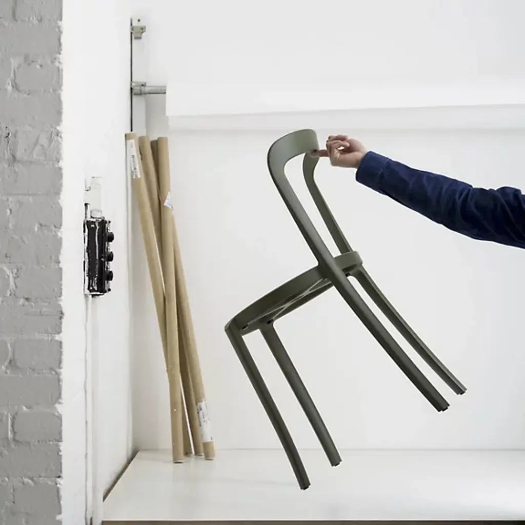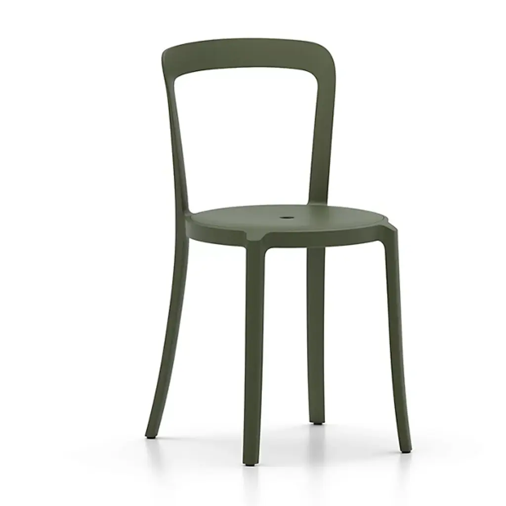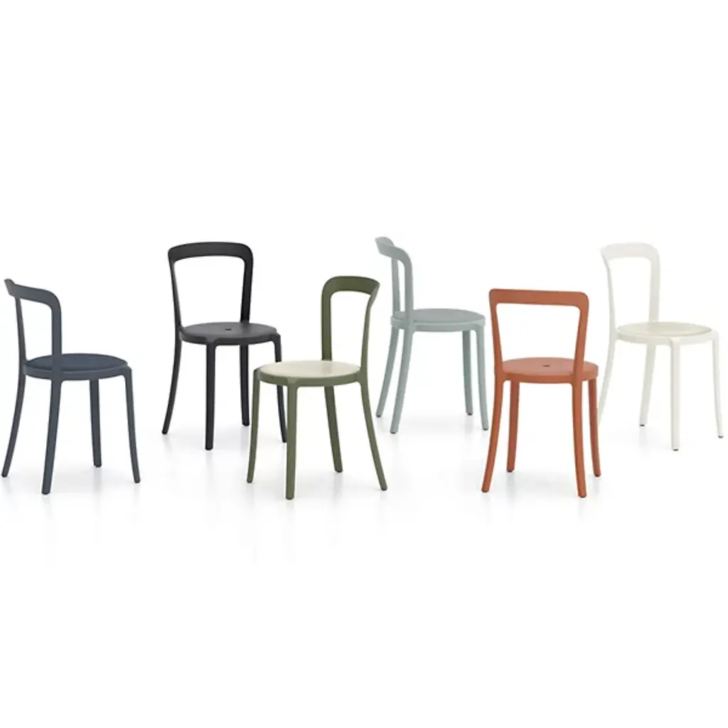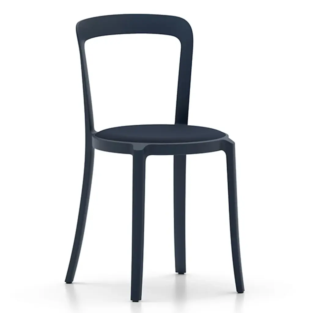 The On & On Stacking Chair, Upholstered by Emeco is a design from Barber & Osgerby that was intended as the next generation of a simple and timeless cafe chair that combines longevity, design, and durability together. Using recycled materials for the body of this simple chair, this piece uses as little material as possible for a lightweight build, and the recycled PET can be recycled again – used on and on. The round seat is handsomely upholstered, and a collection of these chairs can be neatly stacked in a circular arrangement when not in use, making them a practical choice for any space needing plenty of seating.