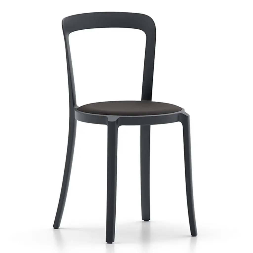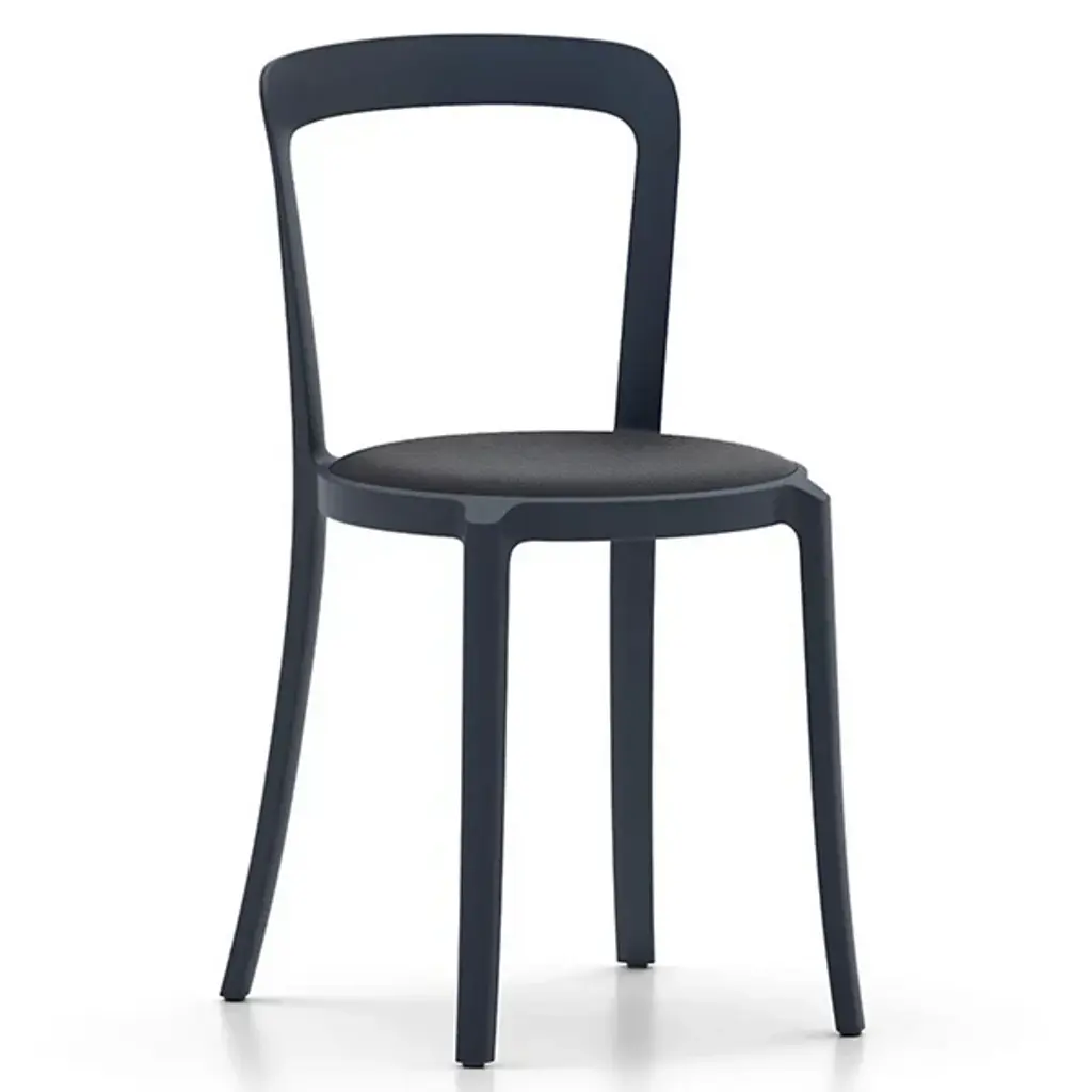 The On & On Stacking Chair, Upholstered by Emeco is a design from Barber & Osgerby that was intended as the next generation of a simple and timeless cafe chair that combines longevity, design, and durability together. Using recycled materials for the body of this simple chair, this piece uses as little material as possible for a lightweight build, and the recycled PET can be recycled again – used on and on. The round seat is handsomely upholstered, and a collection of these chairs can be neatly stacked in a circular arrangement when not in use, making them a practical choice for any space needing plenty of seating.