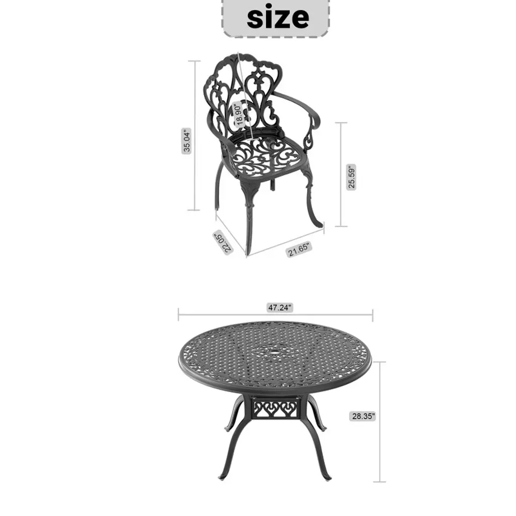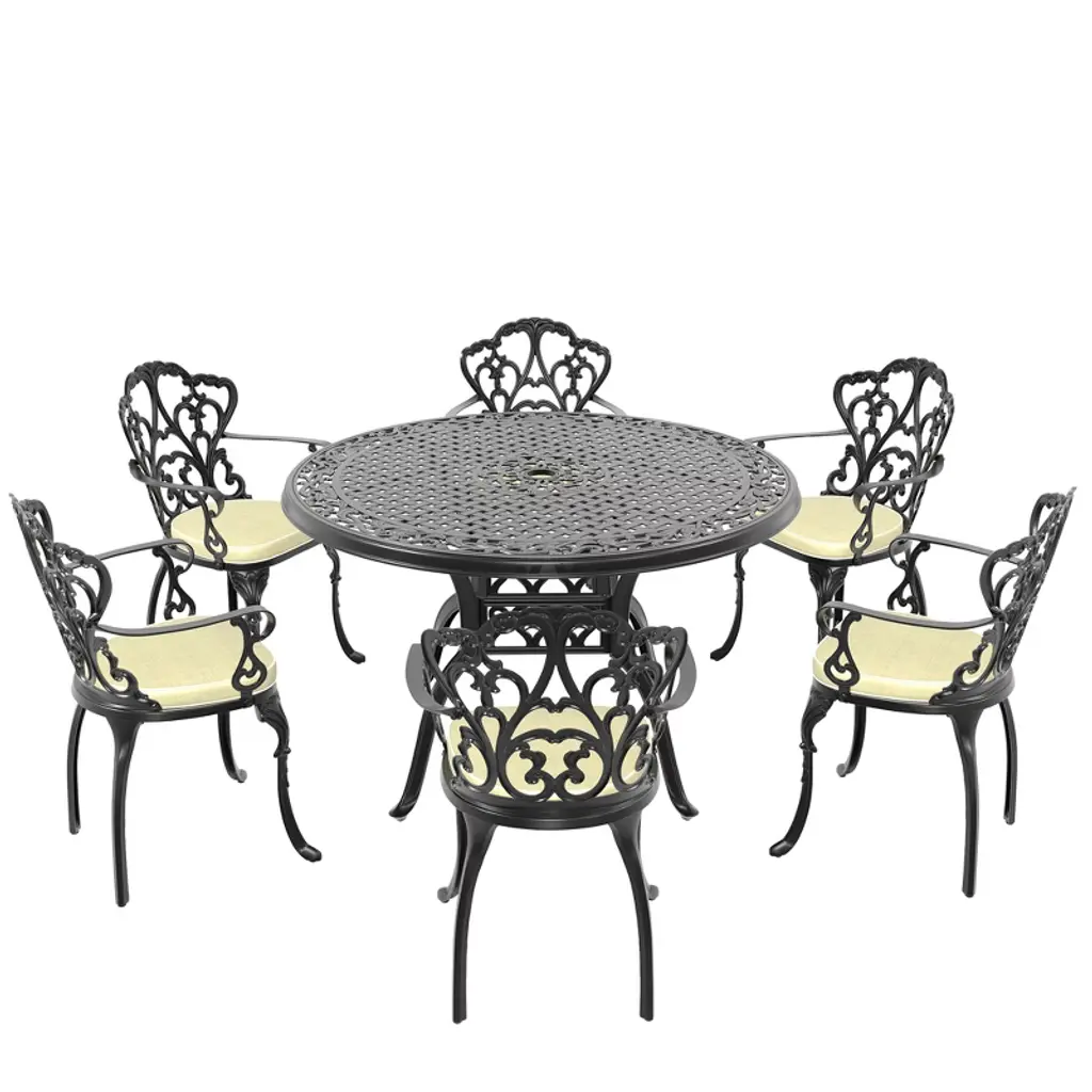 Transform your outdoor space with this 7-Piece Set of Cast Aluminum Patio Furniture with Cushions, designed to bring elegance, comfort, and durability to your garden, patio, or balcony. Crafted using a traditional casting process, this set showcases exquisite carvings and beautiful patterns, such as petals and rectangles, that create a stunning visual appeal. Made from 100% high-quality aluminum, this patio furniture set is built to last. The material is naturally corrosion-resistant and lightweight, allowing it to endure the elements while maintaining its aesthetic appeal. The furniture is coated with a high-temperature-resistant polyester powder finish that offers excellent protection against UV rays and extreme weather conditions. For maximum comfort, the set includes chairs with ergonomic backrests and wide, thick armrests. The design is tailored to fit the natural curves of the human body, ensuring hours of comfortable relaxation. Whether hosting guests or enjoying a quiet moment, this set is ideal for long, leisurely meals or relaxing outdoors. The stackable design of both the table and chairs allows for easy storage and space optimization. This feature makes the furniture set ideal for small or crowded spaces, as you can quickly store it away when not in use, without sacrificing convenience. Perfect for any outdoor setting, the 7-Piece Set of Cast Aluminum Patio Furniture combines timeless design, comfort, and durability, making it an excellent choice for creating an inviting outdoor atmosphere for dining, relaxation, and entertainment.