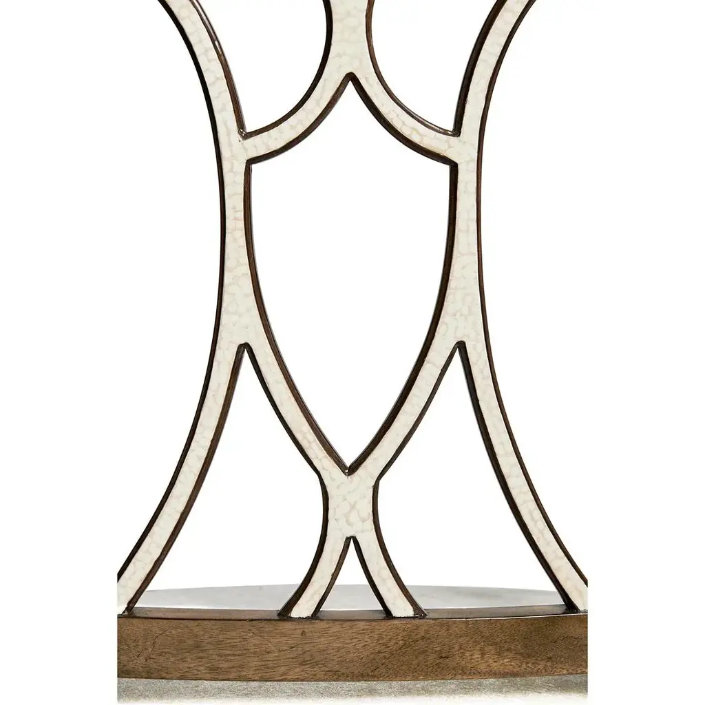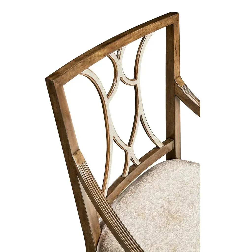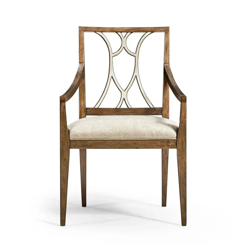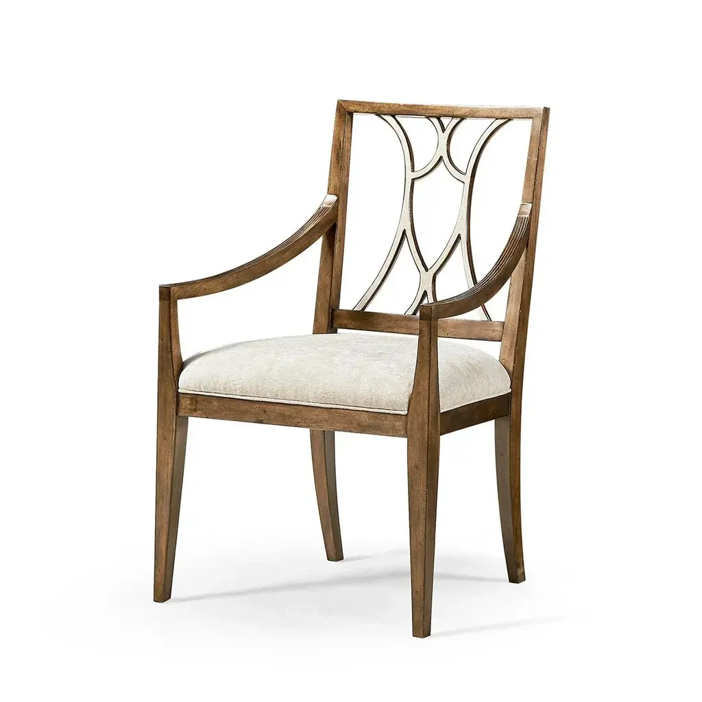 Crafted from rich mahogany, this chair features a classic silhouette that gracefully blends with any decor style. The chair's standout feature is its exquisite white eggshell inlay on both the inside and outside back, showcasing exceptional craftsmanship and adding a regal touch to your space. With sloping arms with a classic reeded detail. The seat is upholstered in a neutral performance fabric that not only enhances comfort but also complements the chair's luxurious mahogany finish, providing a perfect backdrop for your personal style. Designed for both durability and aesthetic appeal, this chair is an ideal choice for those who value sophistication and comfort in their dining furnishings. Dimensions: 23.5" W x 23.68" D x 37" H Seat - 19.5" H Arm - 25.5" H