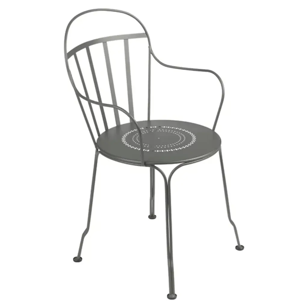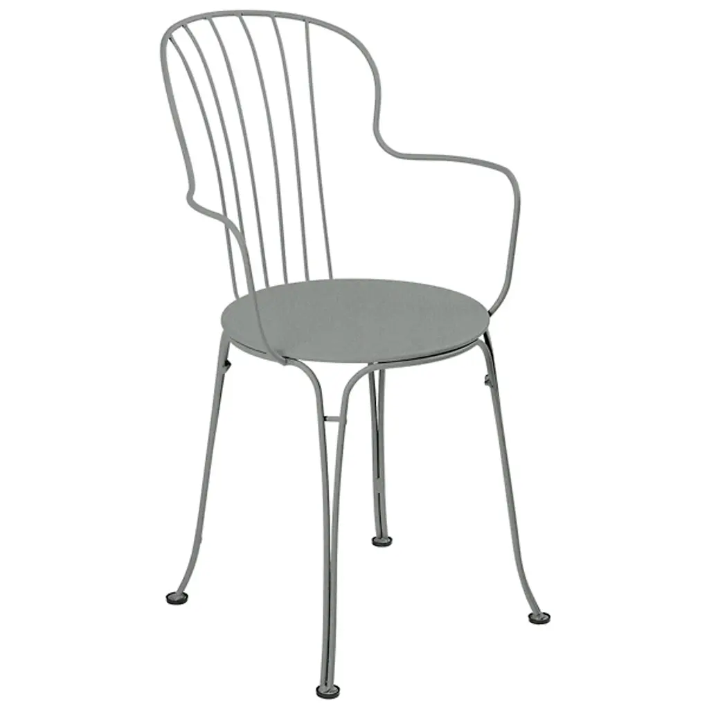 Undeniably refined outdoor seating. The Opera+ Armchair, Set of 2 by Fermob uses a minimum of materials to achieve maximum comfort and a truly elegant decorative effect around any dining table. A single continuous length of steel rod is carefully bent to create the arms and outline of the backrest, while more curves of steel rod form the rest of the backrest and legs. In-between, a round of steel sheet provides a smooth and comfortable seat.