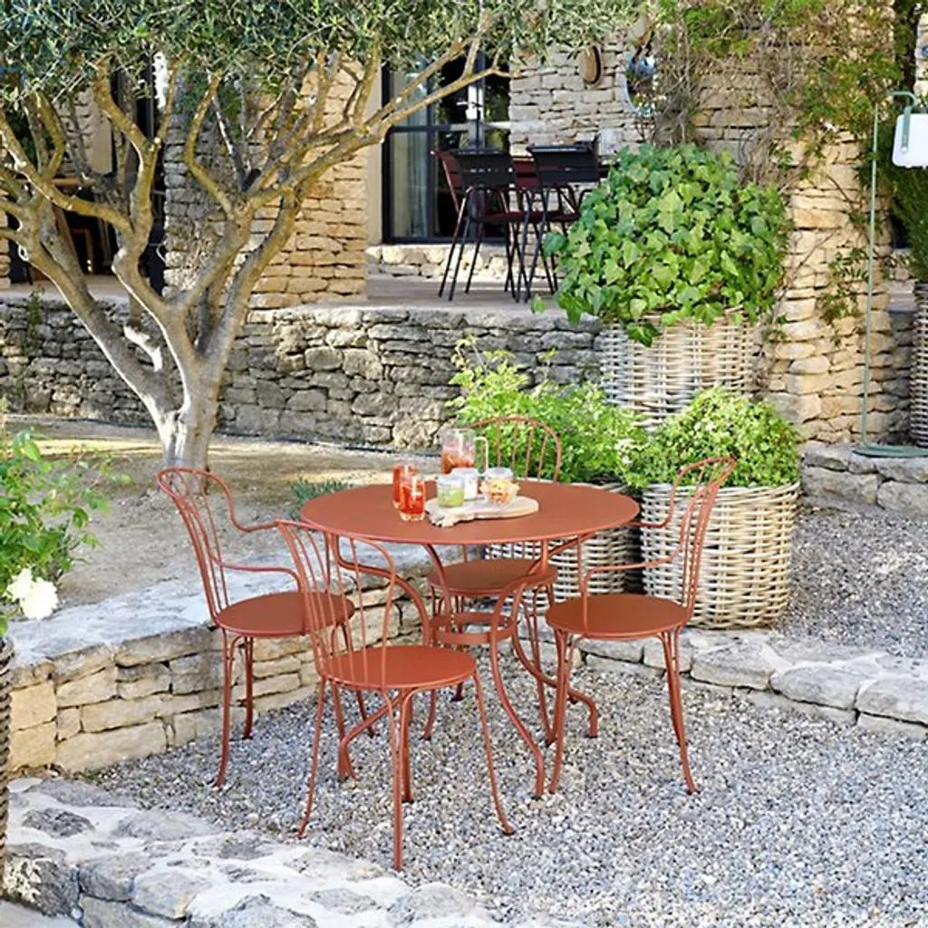 Undeniably refined outdoor seating. The Opera+ Armchair, Set of 2 by Fermob uses a minimum of materials to achieve maximum comfort and a truly elegant decorative effect around any dining table. A single continuous length of steel rod is carefully bent to create the arms and outline of the backrest, while more curves of steel rod form the rest of the backrest and legs. In-between, a round of steel sheet provides a smooth and comfortable seat.