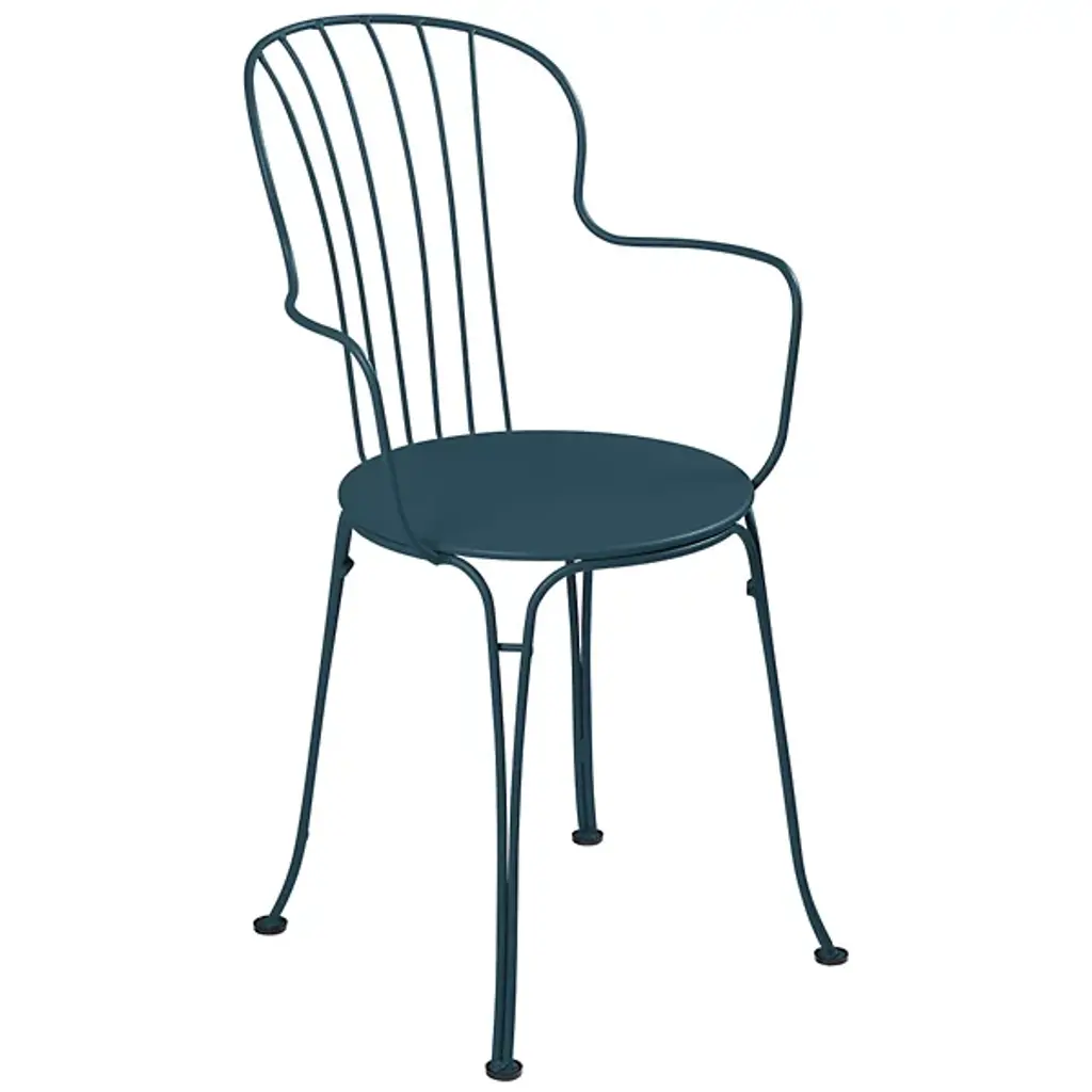 Undeniably refined outdoor seating. The Opera+ Armchair, Set of 2 by Fermob uses a minimum of materials to achieve maximum comfort and a truly elegant decorative effect around any dining table. A single continuous length of steel rod is carefully bent to create the arms and outline of the backrest, while more curves of steel rod form the rest of the backrest and legs. In-between, a round of steel sheet provides a smooth and comfortable seat.