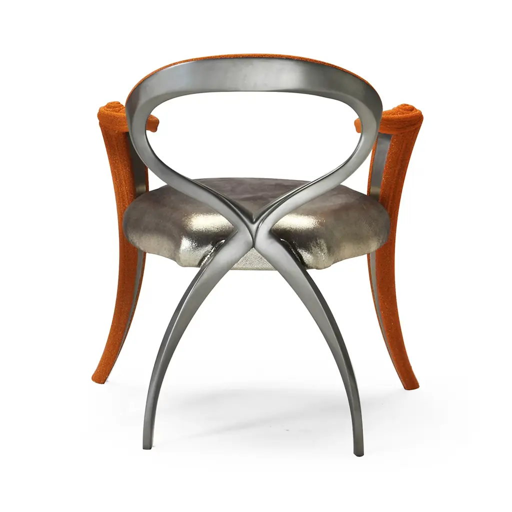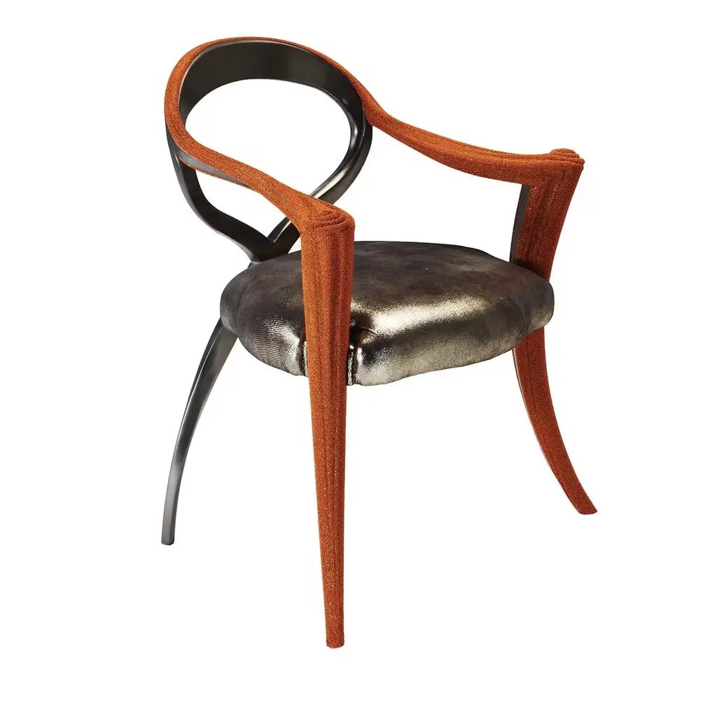 Sure to make a statement in a contemporary study behind a desk or eclectic entrance as accent piece, this chair will be a striking addition around the Opus Futura Glass Table, accompanied by identical ones for a pop of color in the dining room. The piece combines the textured Red Caviar finish of the carved wood front legs and armrests with the smooth Real Steel finish of backrest and back legs - containing more than 95% metal. The silver leather upholstery complements the metal color and adds a unique accent to the piece. Designed by Carlo Rampazzi.