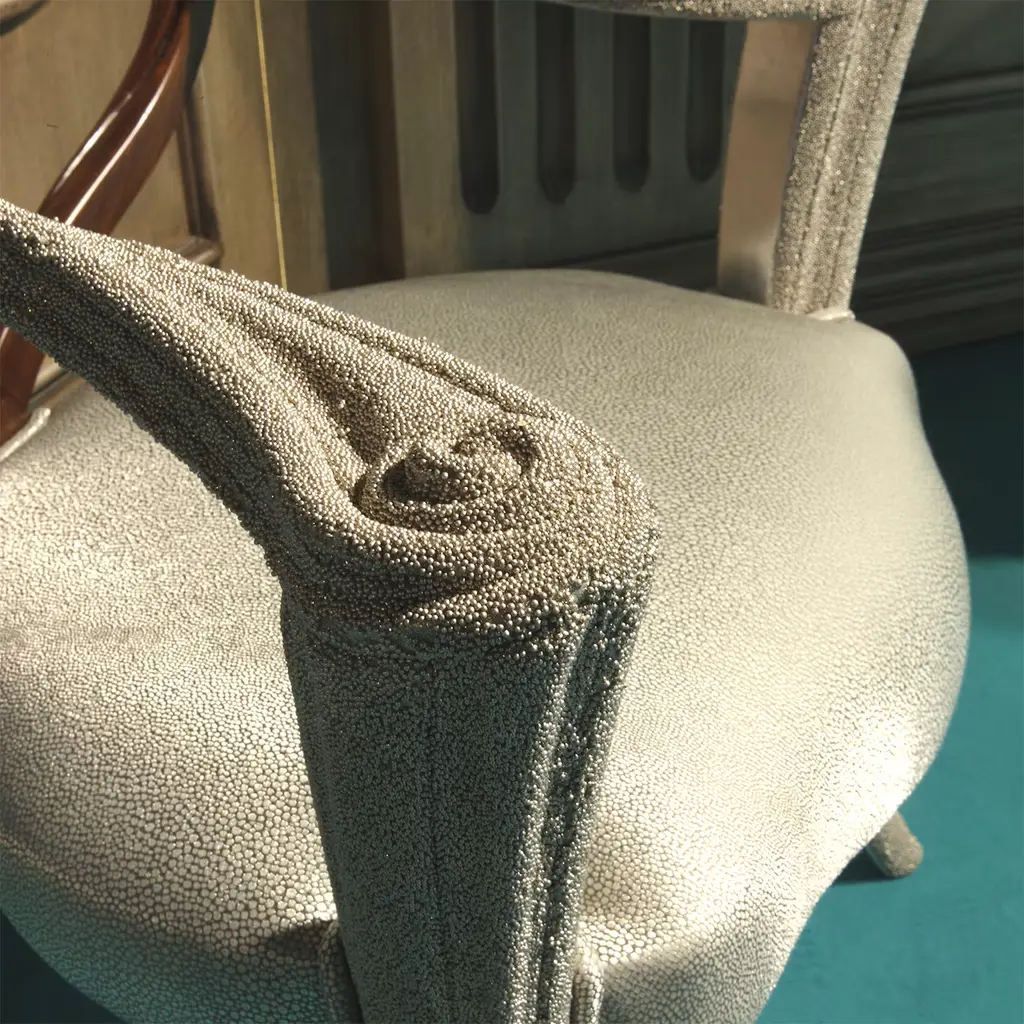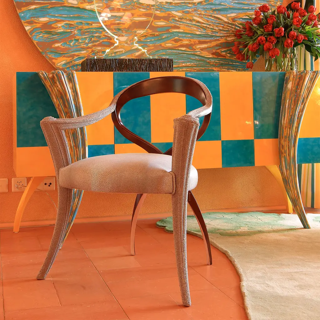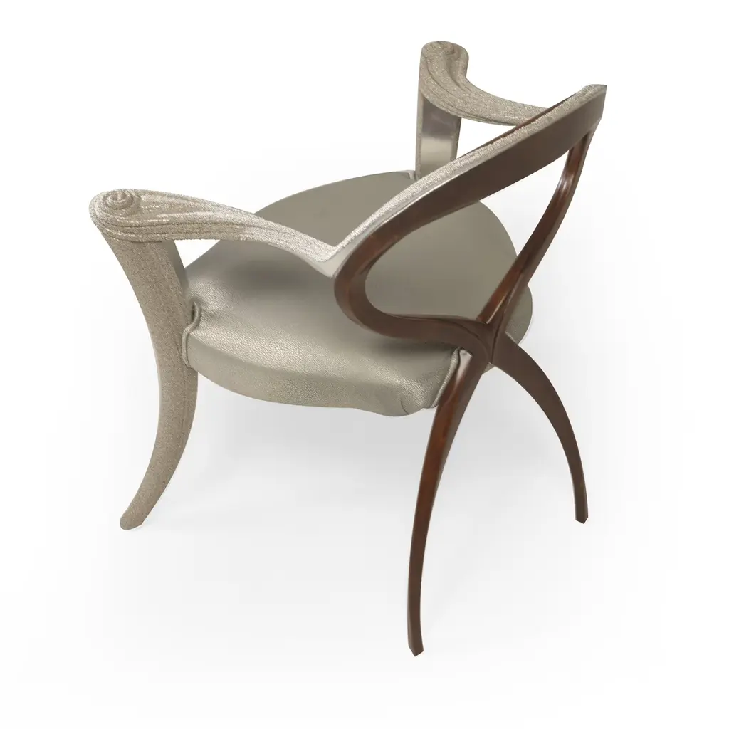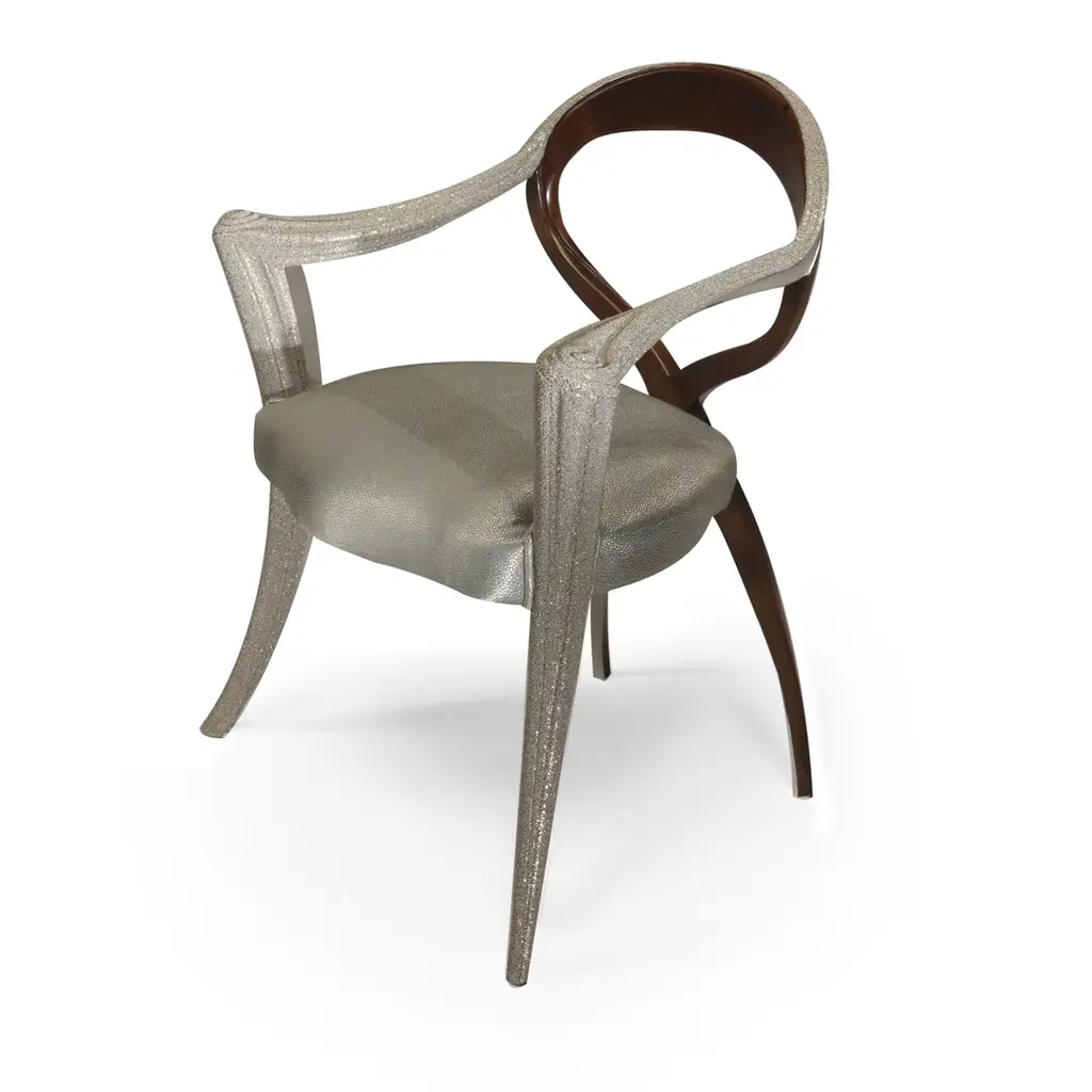 Part of the Opus Futura collection of superb and eclectic seating options, this chair will be a striking addition to a contemporary dining room, entryway or study. Its dynamic silhouette combines front legs and armrests in carved wood with White Caviar finish and a textured quality that contrasts with the smooth back legs and open backrest in dark walnut finish. The seat is padded and upholstered with the unique Dragon fabric in silver. Designed by Carlo Rampazzi.