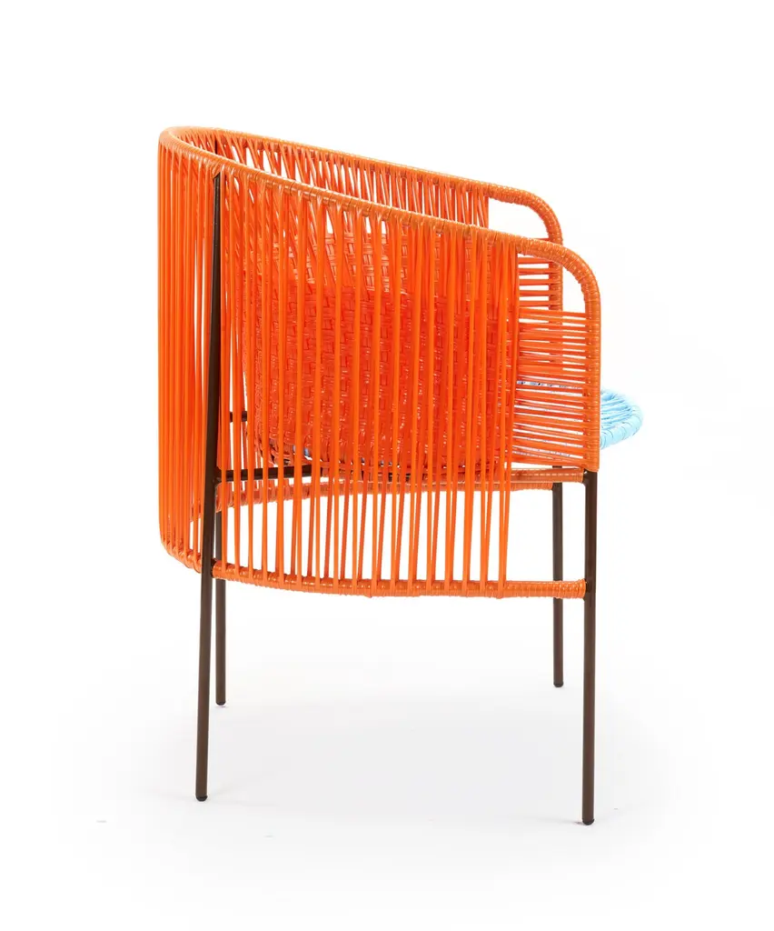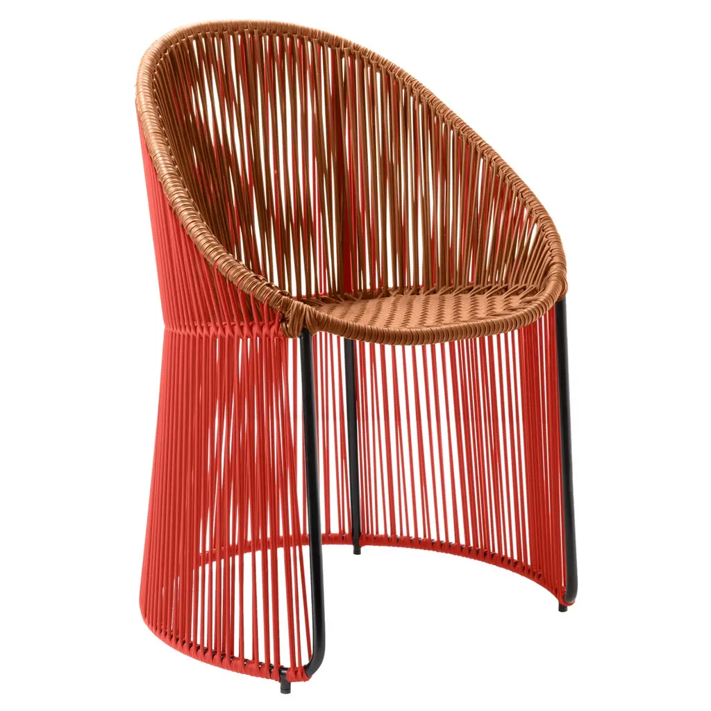 Orange mint caribe dining chair by Sebastian HerknerMaterials: Galvanized and powder-coated tubular steel. PVC strings are made from recycled plastic.Technique: Made from recycled plastic and weaved by local craftspeople in Colombia. Dimensions: W 55.3 x D 56 x H 75 cm Also available colors: Blue/ mint/ black, mint/ green/ black, orange/ rose/ curry, green/ rose/ curry. The charming caribe dining chair is a colorful design for seating arrangements inside and outdoors. It’s part of the Caribe collection, designed by Sebastian Herkner for Ames. The German designer visited Colombia together with Ames founder Ana Maria Calderon-Kayser and translated the vibrancy and spirit of the country’s people and traditions into joyful, modern furniture pieces defined by clean lines, strong colors, and the hand-woven webbing.Each chair is made in Santa Marta, a city on the Caribbean coast of Colombia, by local craftspeople. They weave the PVC strings, which are made from recycled plastic, around the steel frame. The weaving technique the artesanos and artesanas use are called Momposino, a traditional method known for intricate patterns. Just the preparation of all the materials takes ten days, while the production of each chair takes three days.German designer Sebastian Herkner is a long-term collaborator of Ames and has visited Colombia multiple times to experience the country’s cities, nature and people first hand. He also visited many of the ateliers that Ames has partnered with to learn about the unique traditional crafts of Colombia's regions. A sought-after contemporary designer and recipient of many industry awards, he has worked with many international design brands, creating intriguing pieces that showcase his intuition for interesting material, color, and texture combinations.