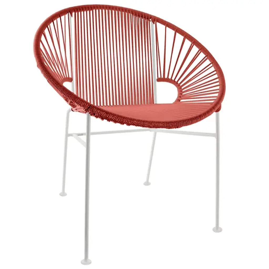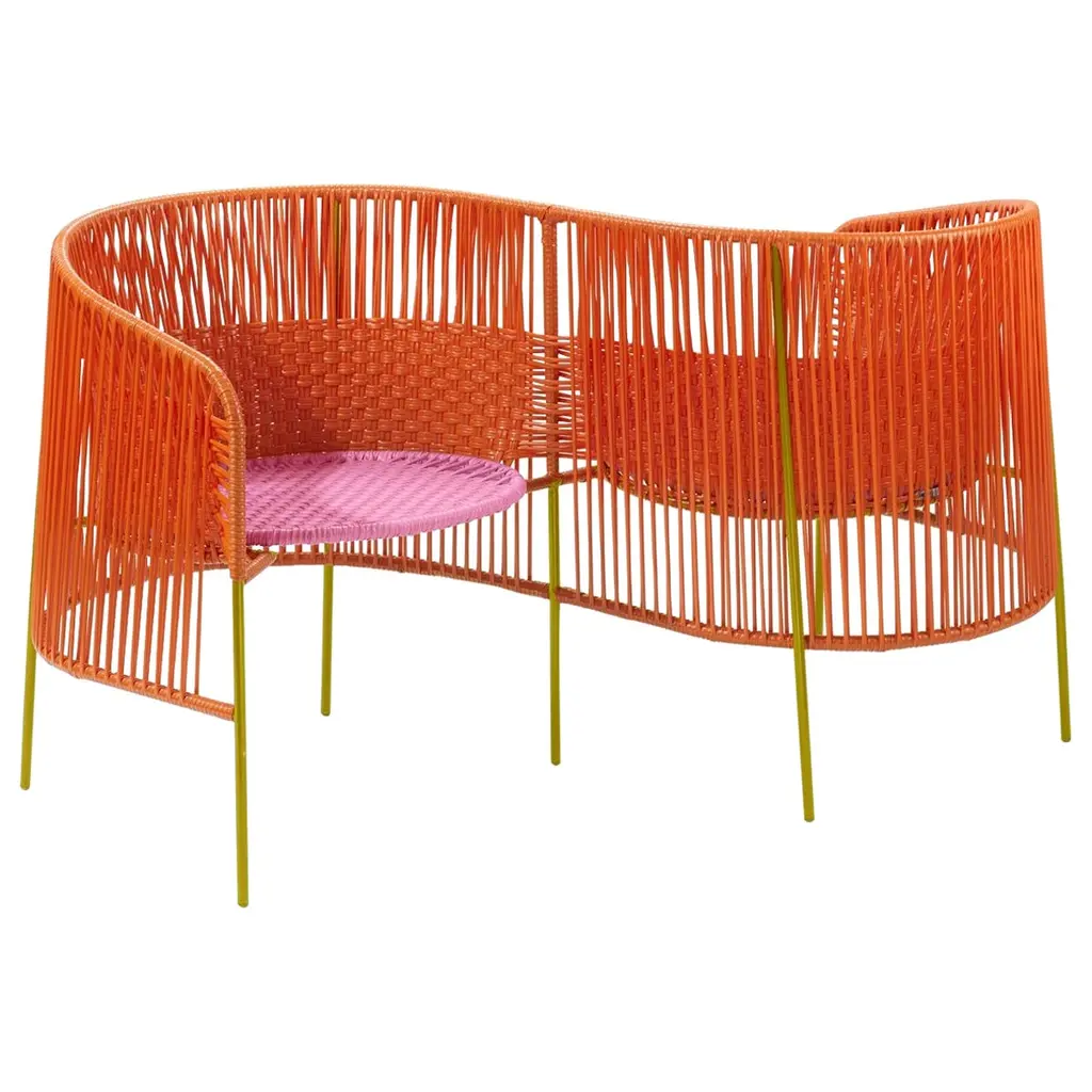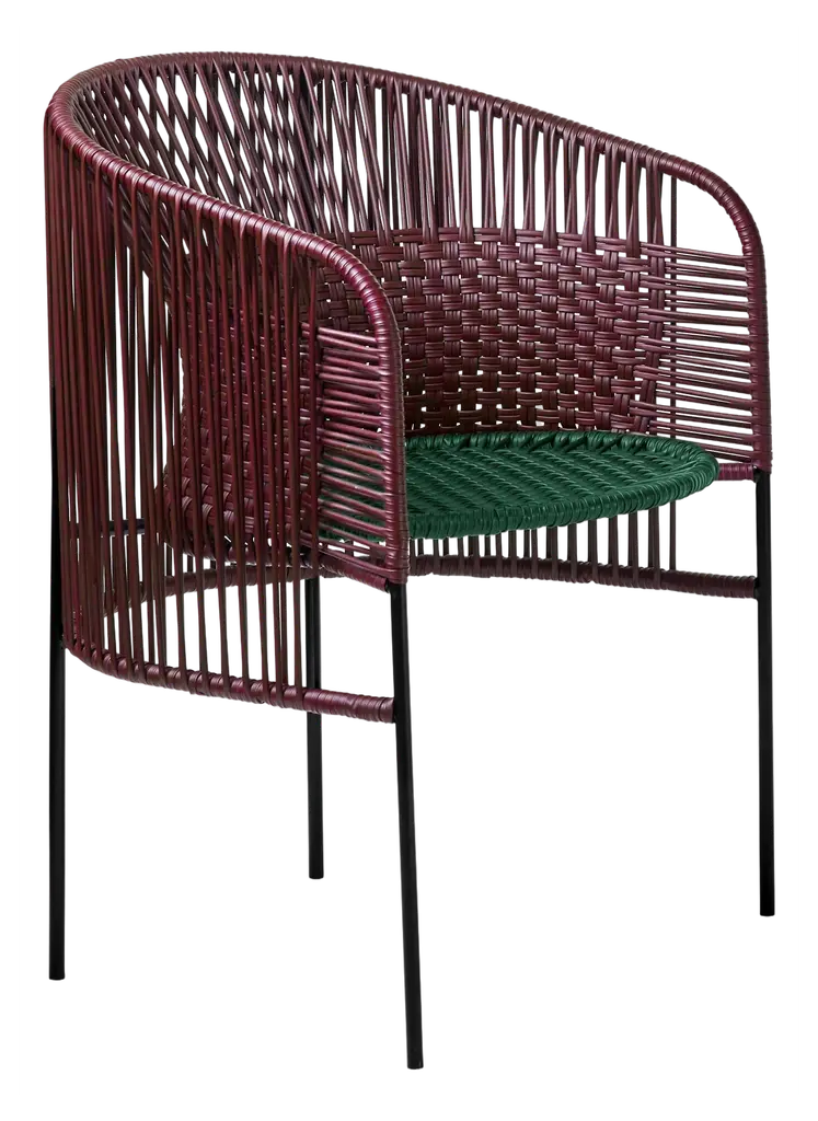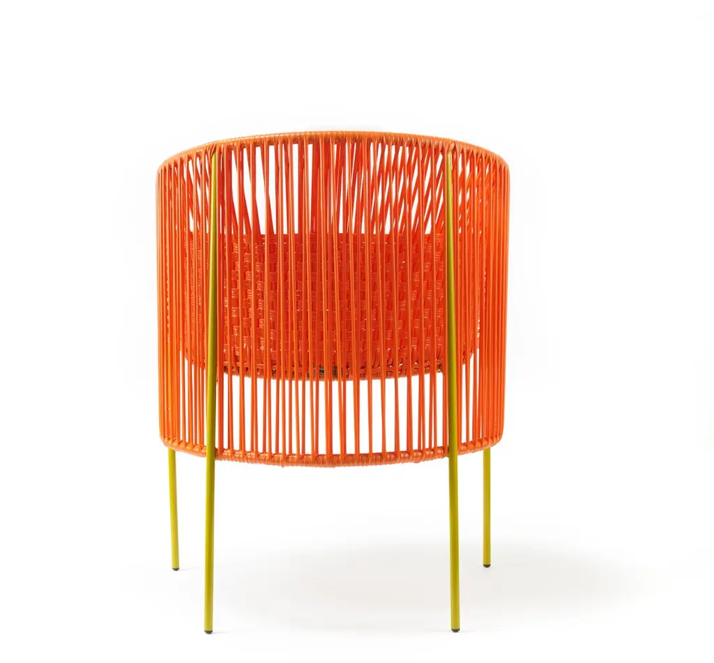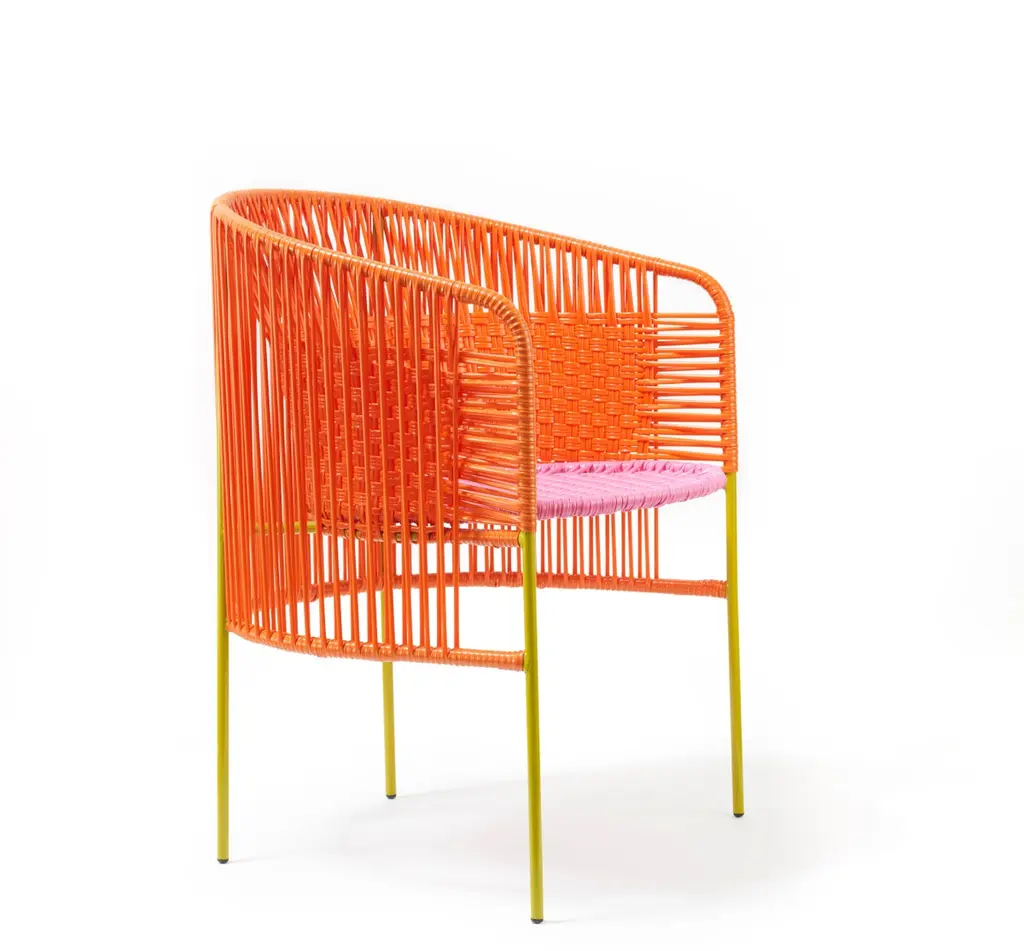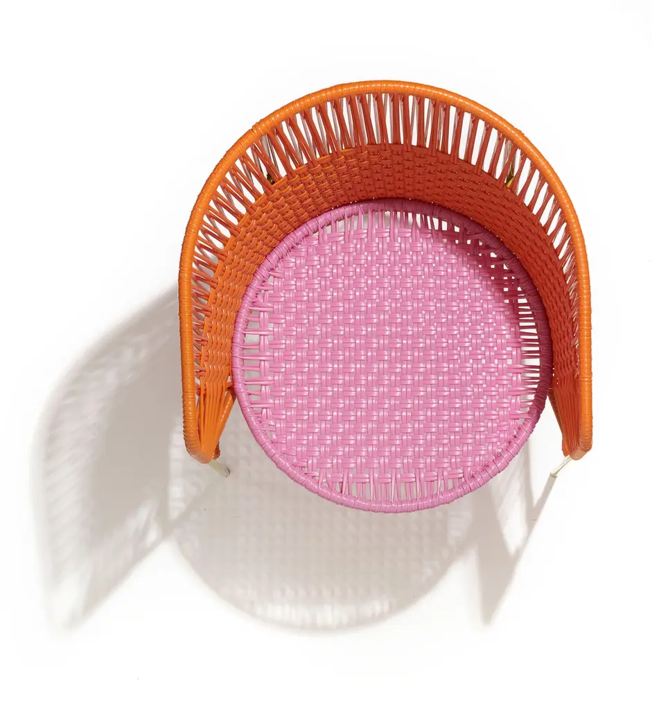 Orange rose caribe dining chair by Sebastian HerknerMaterials: Galvanized and powder-coated tubular steel. PVC strings are made from recycled plastic.Technique: Made from recycled plastic and weaved by local craftspeople in Colombia. Dimensions: W 55.3 x D 56 x H 75 cm Also available colors: blue/ mint/ black, mint/ green/ black, orange/ rose/ curry, green/ rose/ curry.The charming Caribe dining chair is a colorful design for seating arrangements inside and outdoors. It’s part of the Caribe collection, designed by Sebastian Herkner for Ames. The German designer visited Colombia together with Ames founder Ana Maria Calderon-Kayser and translated the vibrancy and spirit of the country’s people and traditions into joyful, modern furniture pieces defined by clean lines, strong colors, and the hand-woven webbing.Each chair is made in Santa Marta, a city on the Caribbean coast of Colombia, by local craftspeople. They weave the PVC strings, which are made from recycled plastic, around the steel frame. The weaving technique the artesanos and artesanas use are called Momposino, a traditional method known for intricate patterns. Just the preparation of all the materials takes ten days, while the production of each chair takes three days.German designer Sebastian Herkner is a long-term collaborator of Ames and has visited Colombia multiple times to experience the country’s cities, nature and people first hand. He also visited many of the ateliers that Ames has partnered with to learn about the unique traditional crafts of Colombia's regions. A sought-after contemporary designer and recipient of many industry awards, he has worked with many international design brands, creating intriguing pieces that showcase his intuition for interesting material, color, and texture combinations.