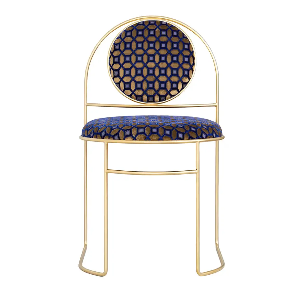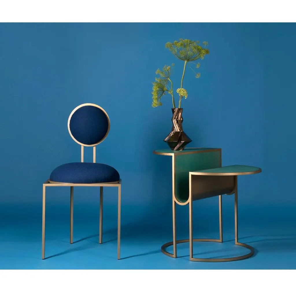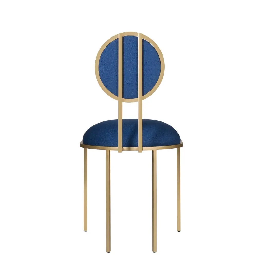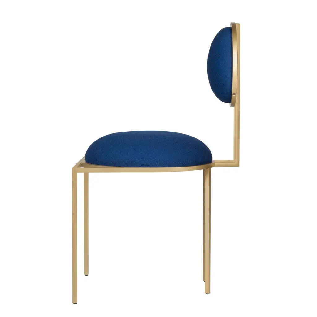 Orbit Dining Chair In Blue Wool Fabric, Brushed Brass, By Lara Bohinc