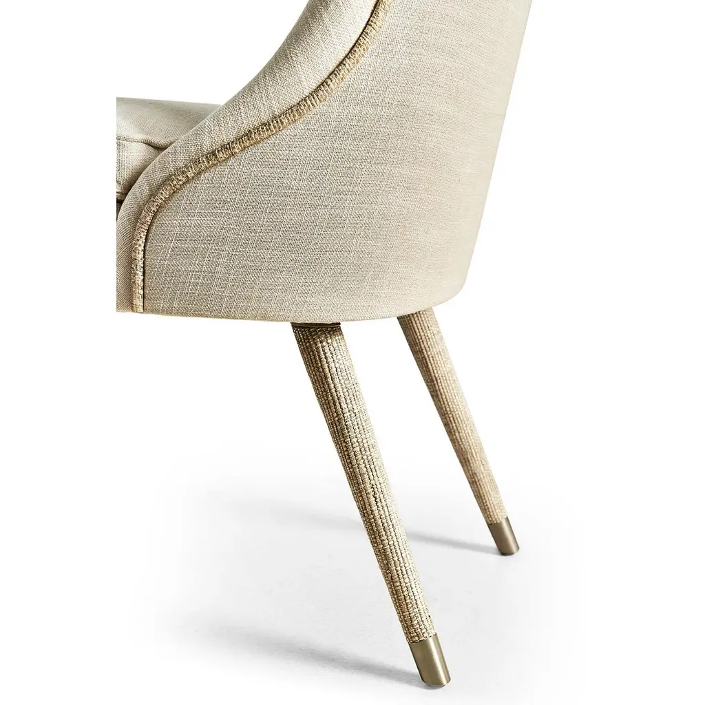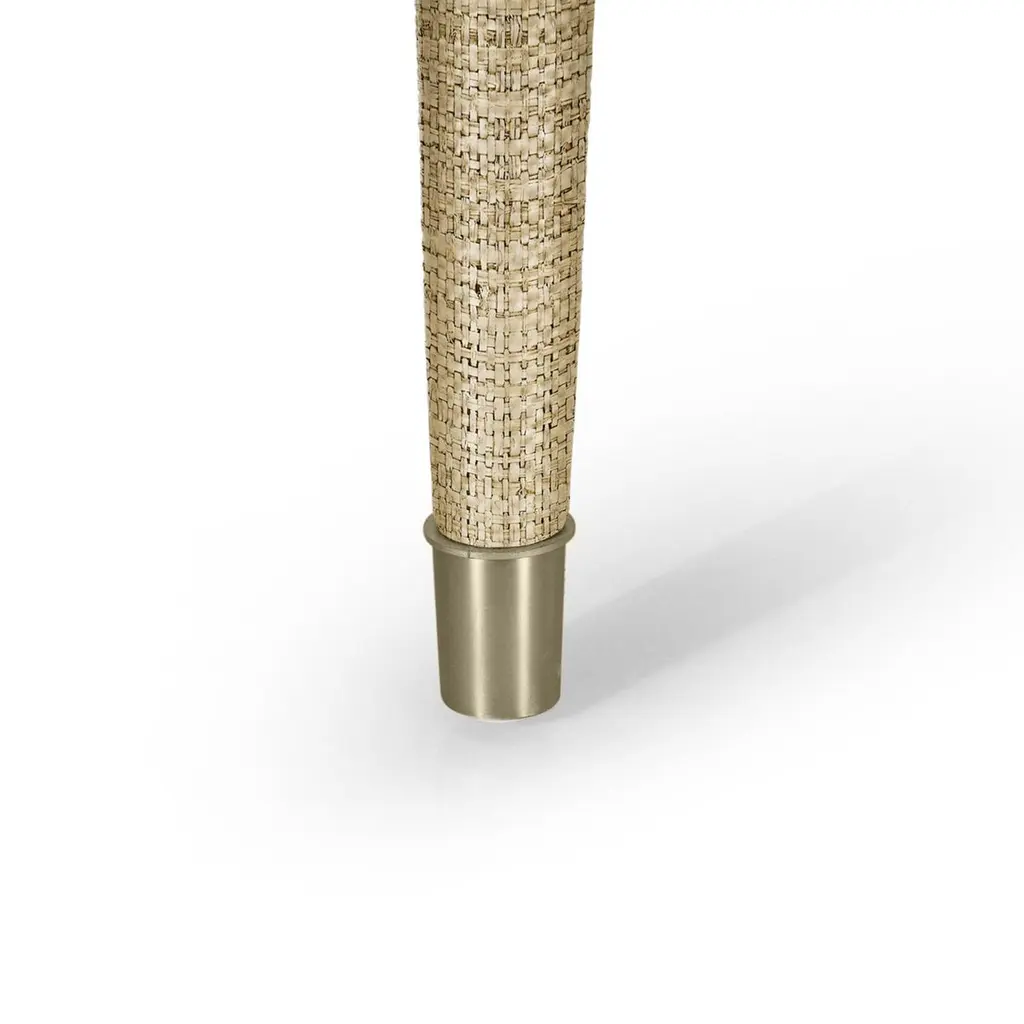 Its performance linen upholstery with a grasscloth welt blends texture and durability, while a contoured back and plush cushion ensure comfort.Solid hardwood legs wrapped in grasscloth highlight artisanal craftsmanship, complemented by satin brass ferrules. A perfect fit for modern tropical or contemporary interiors, this chair balances timeless style with practical elegance.Dimensions: 18.875" W x 25.25" D x 35.25" HSeat Height: 20.50"