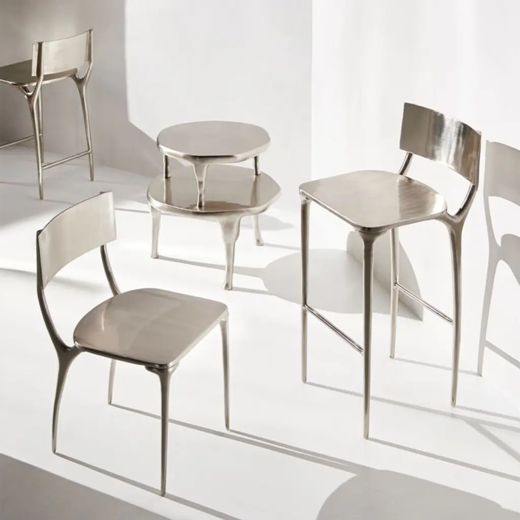Cast aluminum dining chair is bathed in an elegant silver finish as part of our collection with Chicago-based fashion designer Azeeza. Marrying modern design with a polished finish, Azeeza brings timeless sophistication to the outdoors. "Simple colors require a statement design to stand out," Azeeza explains. "The idea is to keep your environment from being dull by infusing it with life in a melodic way." CB2 exclusive.