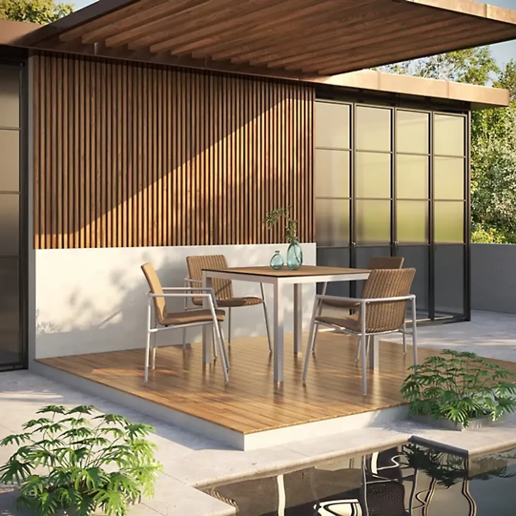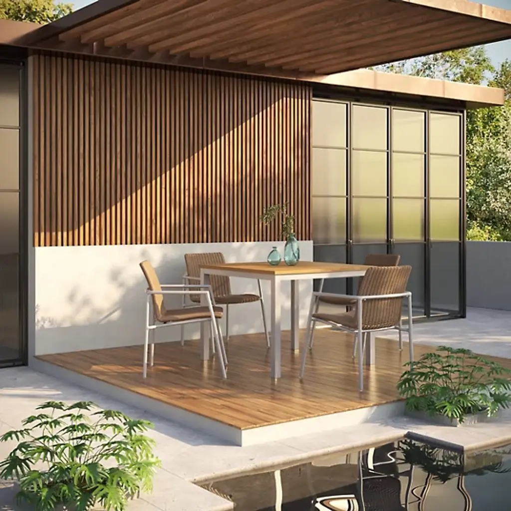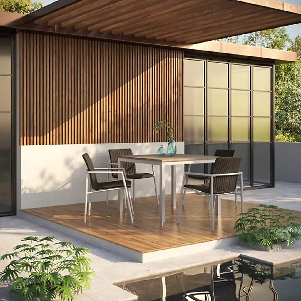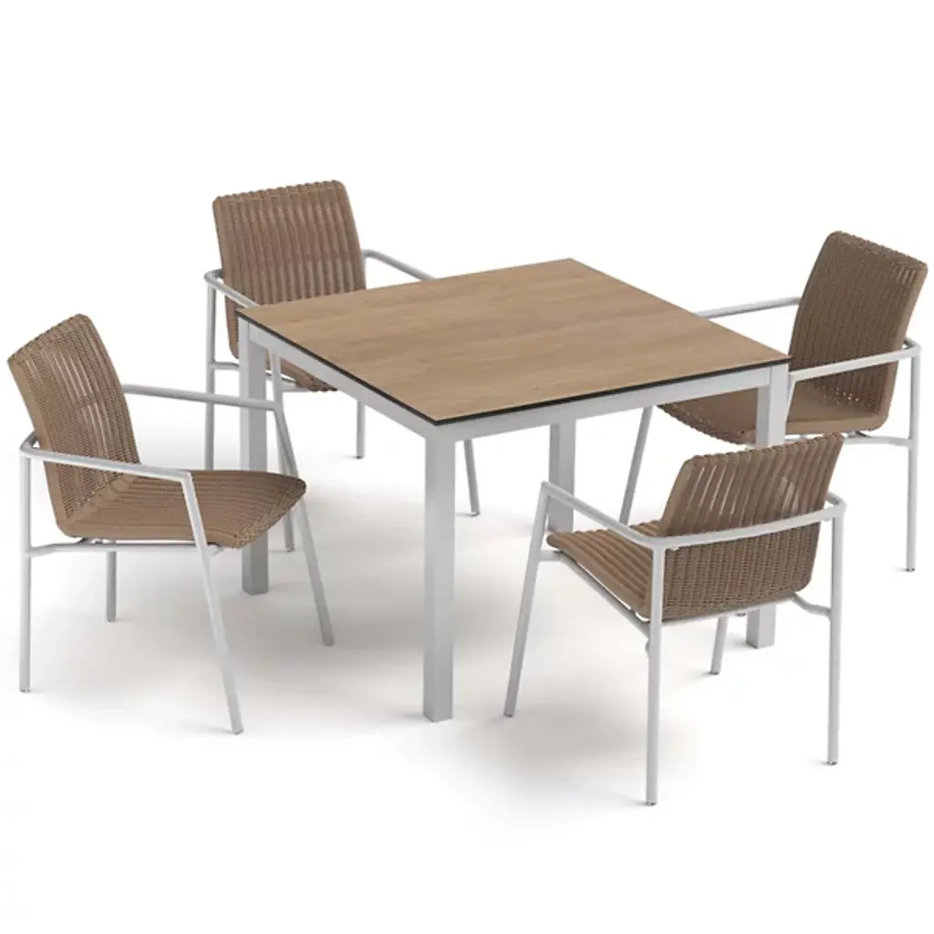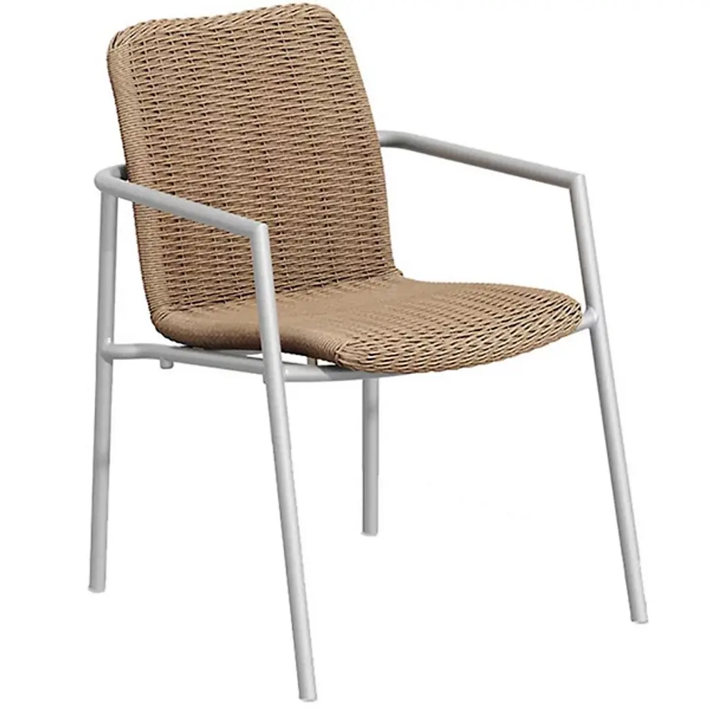 A sleek, modern and weather-resistant take on classic wicker. The seat and back of the Orso Outdoor Armchair - Set of 4 by Oxford Garden are made using a specialty synthetic wicker made of touch, moisture resistant polyethylene resin. The rustic texture of the seat is balanced by the clean, minimalist lines of the tubular aluminum frame. The aluminum has a powder coated finish that helps make it even more durable for year-round use around an outdoor dining table.