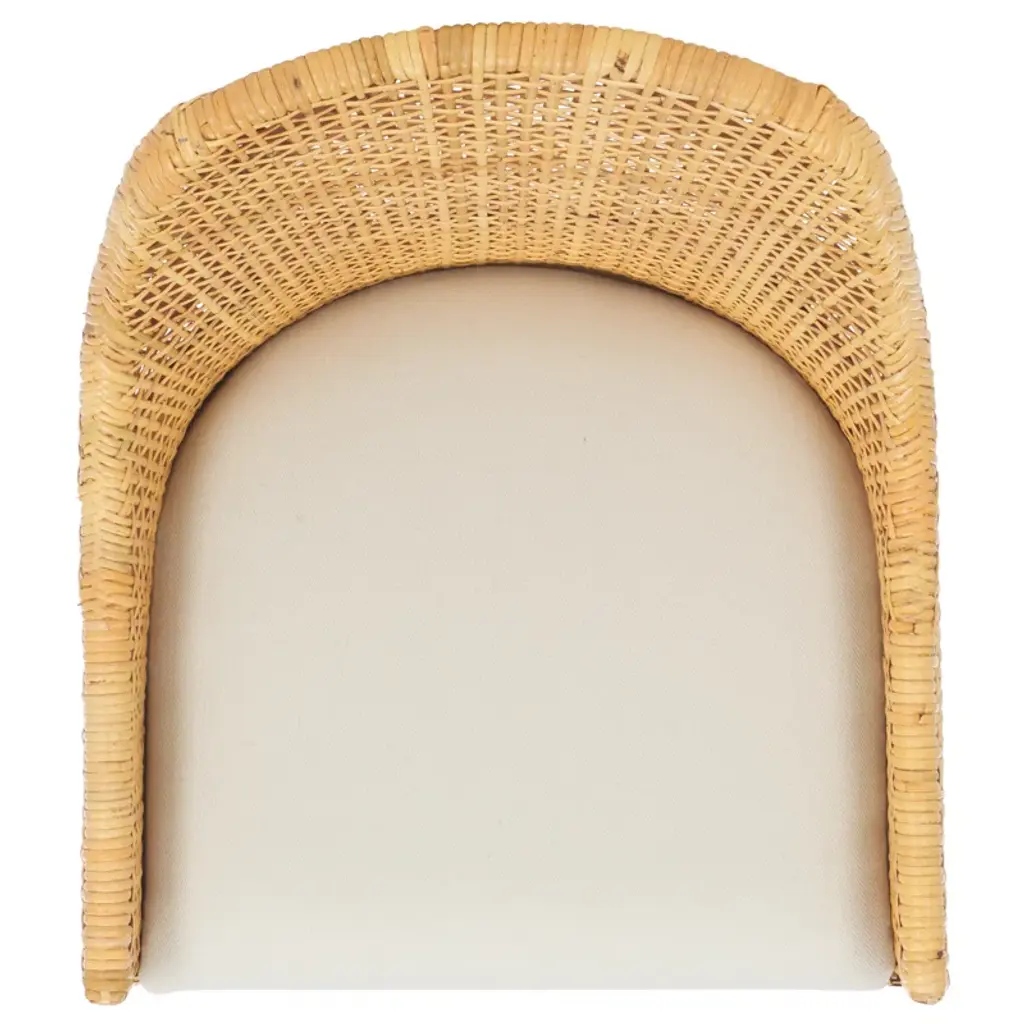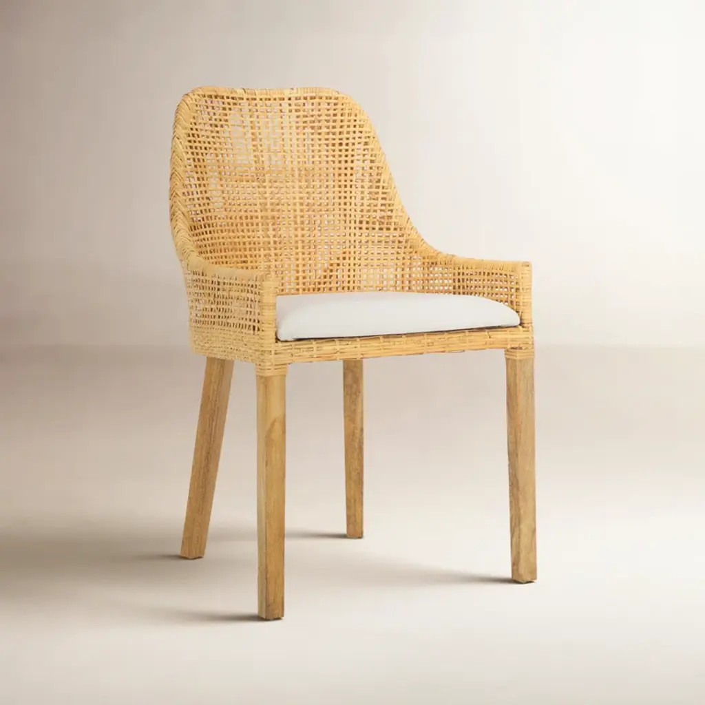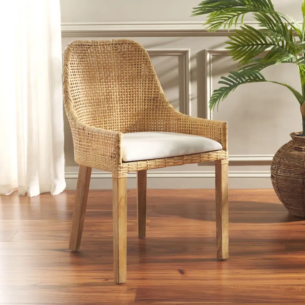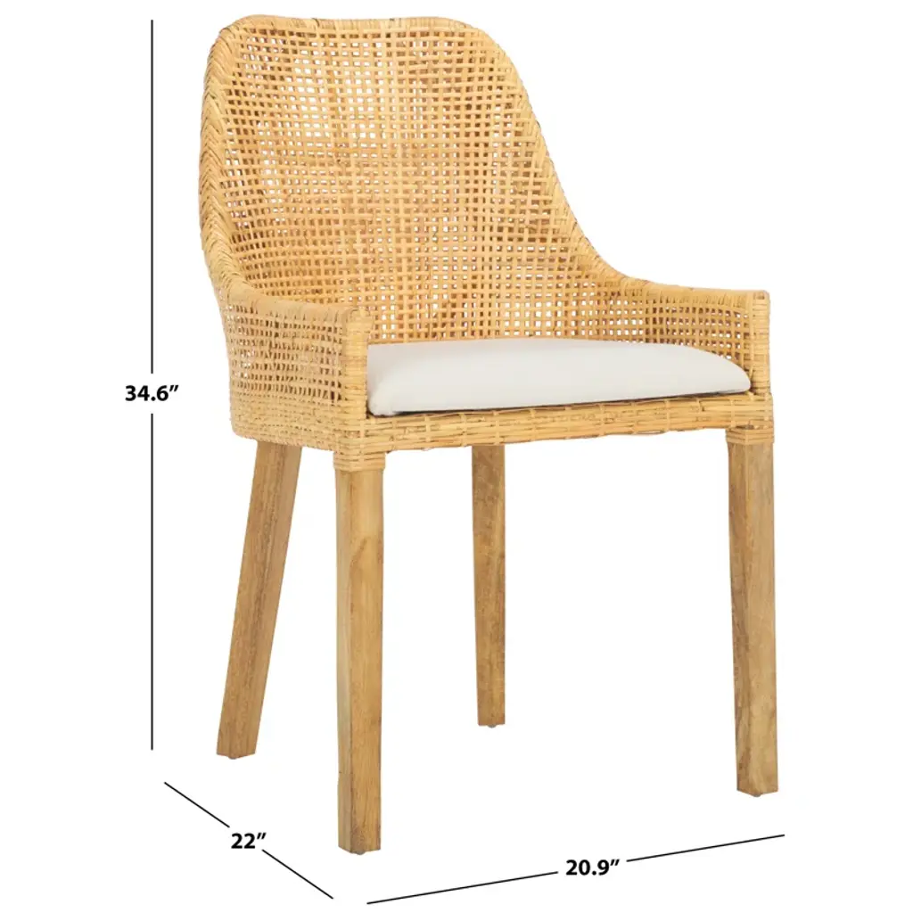 Give a fresh and inviting update to your space with our charming Ortega dining chair. Our modern chair is updated with the beauty of natural materials to liven up your home. Its refined barrel back is woven with rattan to attain a texturally rich and inviting appeal. Sleek mango wood legs complete the airy and modern profile of our chair. It features a hugging back and white padded cushion to lend plenty of comfort. Offering rich textures and warm neutrals, our modern dining chair remains the perfect complement to your casual dining spaces and laid-back lounges.