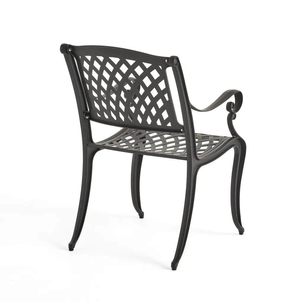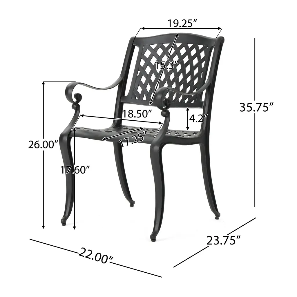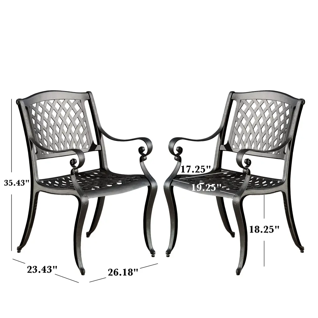 Product FeaturesDining in elegance has never been easier with the help of our delightful chair set.These dining chairs will bring luxury and convenience to your outdoor space.Made from cast aluminum, these durable, high-quality chairs feature a mesh-style backrest and seat rest.With a gorgeous neutral finish, this set will match any outdoor furniture that also provides sturdy, weather-resistant frames. Whether you are using these in your backyard, patio, or deck space, you'll enjoy these chairs for years to come.