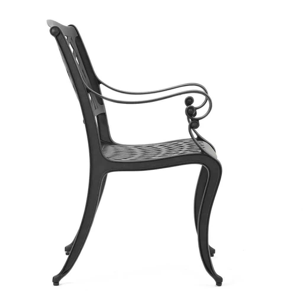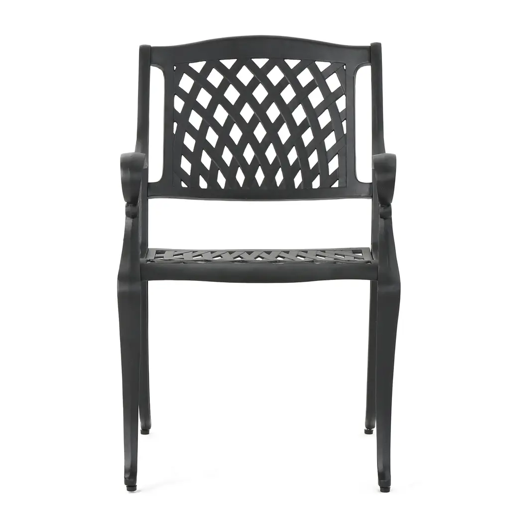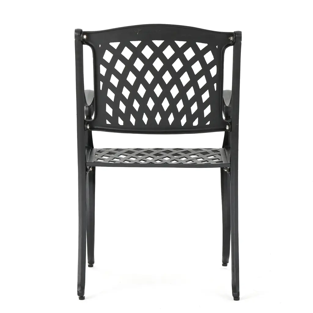 Product FeaturesDining in elegance has never been easier with the help of our delightful chair set.These dining chairs will bring luxury and convenience to your outdoor space.Made from cast aluminum, these durable, high-quality chairs feature a mesh-style backrest and seat rest.With a gorgeous neutral finish, this set will match any outdoor furniture that also provides sturdy, weather-resistant frames. Whether you are using these in your backyard, patio, or deck space, you'll enjoy these chairs for years to come.
