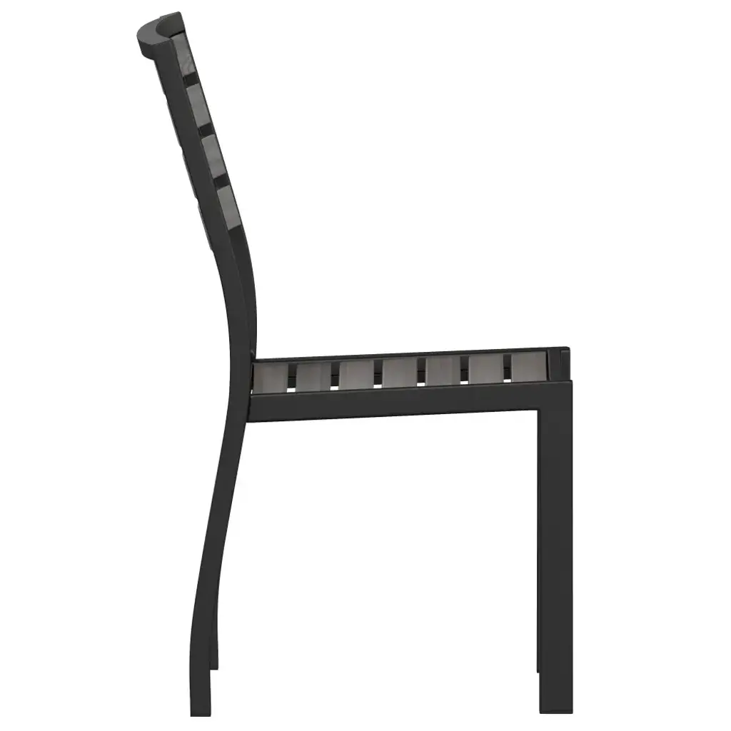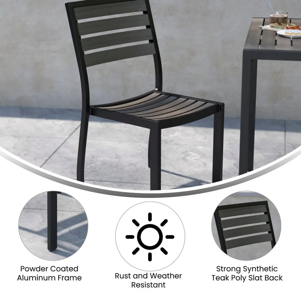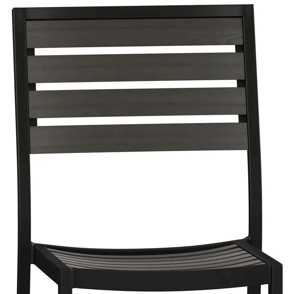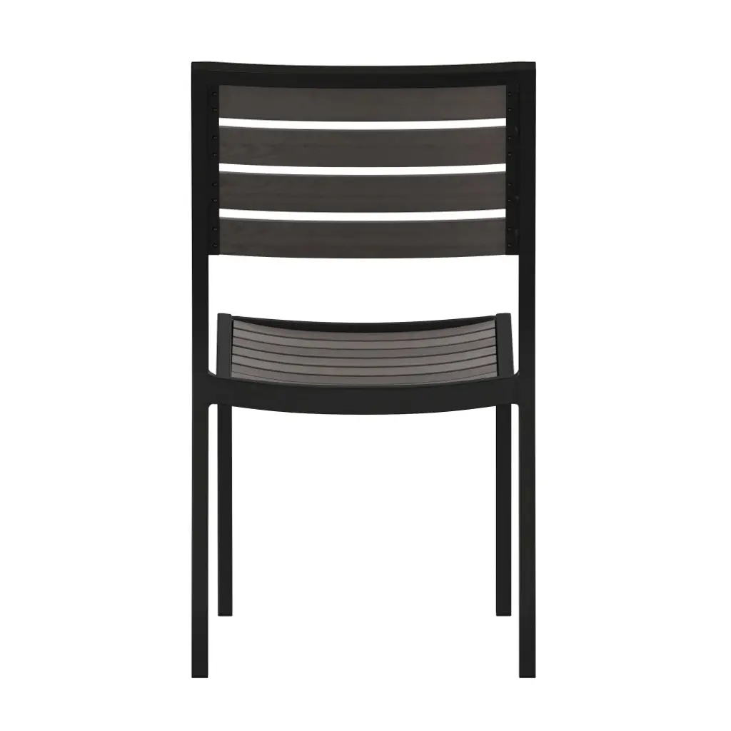 Create the perfect space for relaxing evenings and great conversations with this faux teak outdoor patio chair. This comfy patio chair boasts a slatted poly back and seat and lightweight aluminum frame capable of holding up to 300 lbs. weight capacity to accommodate most visitors. This patio dining chair is weather and rust resistant so you won't need to move it or put it away when the seasons change and is stackable up to 8 high. Best of all, this chair comes fully assembled so you can start enjoying it as soon as you receive it. Create a sophisticated look for your outdoor space with this slatted patio chair that pairs nicely with our outdoor table with faux teak poly slats. Fixed plastic floor glides will allow ease of movement and spills clean up easily with a water based cleaner making this chair very low maintenance. Reduce stress and make the most of your evenings and weekends with this patio dining chair that is sure to become your go-to seat.Outdoor Patio Dining ChairStrong synthetic teak slatted back and seatEasily cleaned with a water based cleanerWeather and rust resistant for durability300 lb. Seating Capacity accommodates most usersLightweight Black Powder Coated Aluminum Frame with Protective Floor GlidesBack Size: 18.75"W x 18"H; Seat Size: 16"W x 18"D x 17"HChair Ships Fully Assembled and Ready to UseComplete the look with our outdoor patio bistro dining table with faux teak poly slats