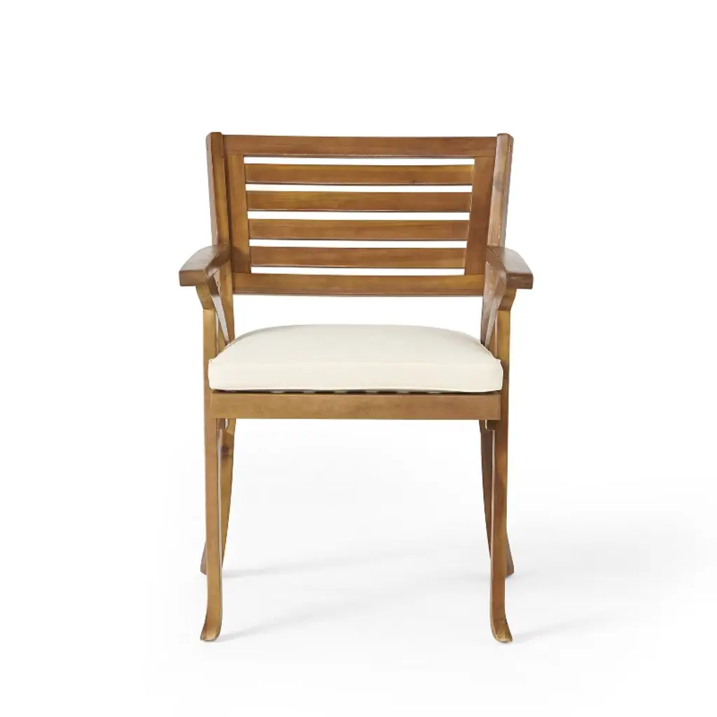 This chairs are designed with curved backrest, which will add more comfort to your body after long-time sitting. Includes :(2) Arm chairs Frame Color: Teak Finish Cushion Color: Cream Arm Height: 26.25 inches Cushion Thickness: 2.00 inches Weight Capacity: 400 lbs The open slat paneling perfectly complements its playfully curved frames, giving this set a wonderfully refreshing feel to your decor. Acacia wood is perfect as a solid, heavy frame that resists wear and tear. Water-resistant covers are added to our cushions for maximum protection. Easily unzip them for washing or replacement if desired.