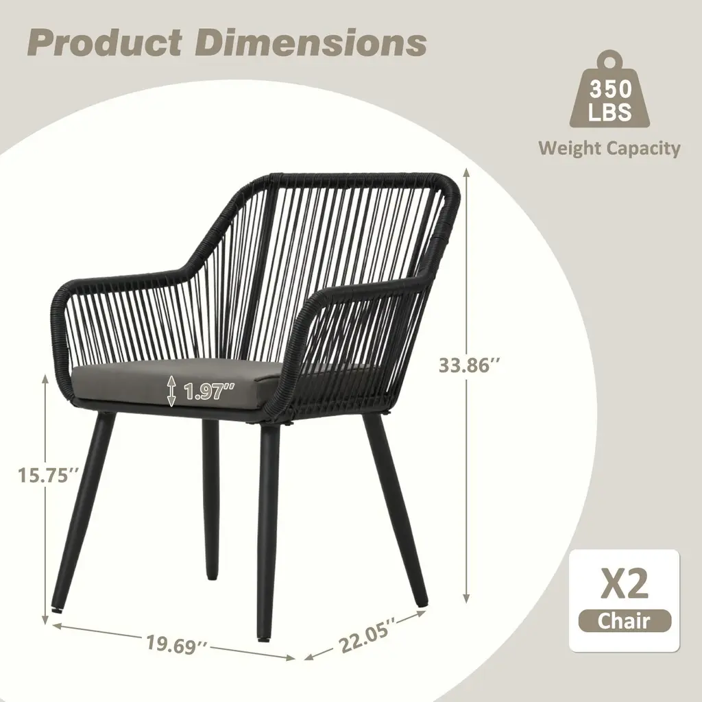 Stylish & Comfortable Outdoor Seating These EROMMY outdoor patio dining chairs are designed for both relaxation and style, featuring ergonomic armrests and a curved backrest that provide excellent lumbar support. The included removable cushions enhance comfort, making them perfect for long hours of backyard dining or enjoying the sunshine on your porch. Durable Wicker Construction for All-Weather Use Made from tightly-woven weather-resistant wicker rattan, these balcony chairs are built to withstand sun, rain, and humidity. Ideal for outdoor use in small patios, balconies, or poolside areas, they combine a lightweight design with exceptional durability for year-round comfort. Removable & Easy-to-Clean Cushions Each outdoor dining chair comes with soft seat cushions filled with flat cotton and covered in durable polyester fabric. The zipper design allows for quick removal and easy cleaning, helping you maintain a fresh and comfortable outdoor seating experience with minimal effort. Ergonomic Design with Supportive Features The high backrest and angled ergonomic armrests ensure optimal seating posture and relieve back and shoulder pressure. Whether you're reading, chatting, or dining, these small patio chairs offer a cozy retreat with thoughtful, comfort-focused design details. Multi-Scene Versatility for Outdoor & Indoor Spaces Perfectly suited for use with outdoor dining tables or fire pits, these wicker rattan chairs enhance various spaces such as gardens, lawns, or apartment balconies. They also work as a stylish indoor seating option, blending functionality and charm for any home decor style.