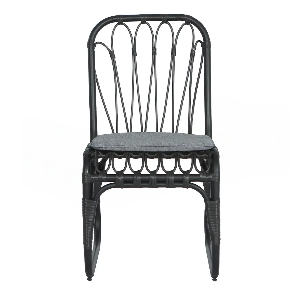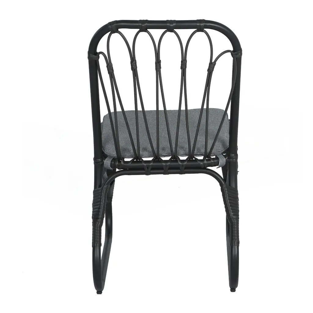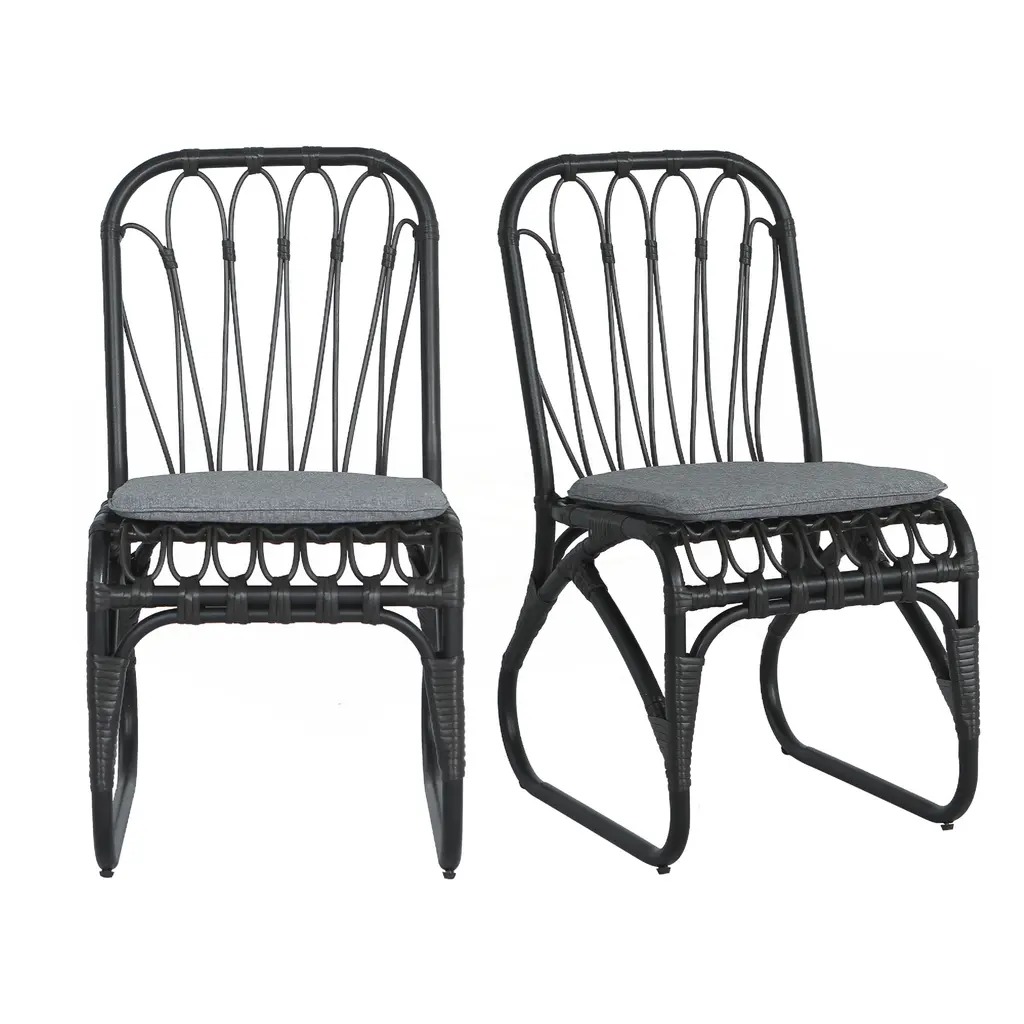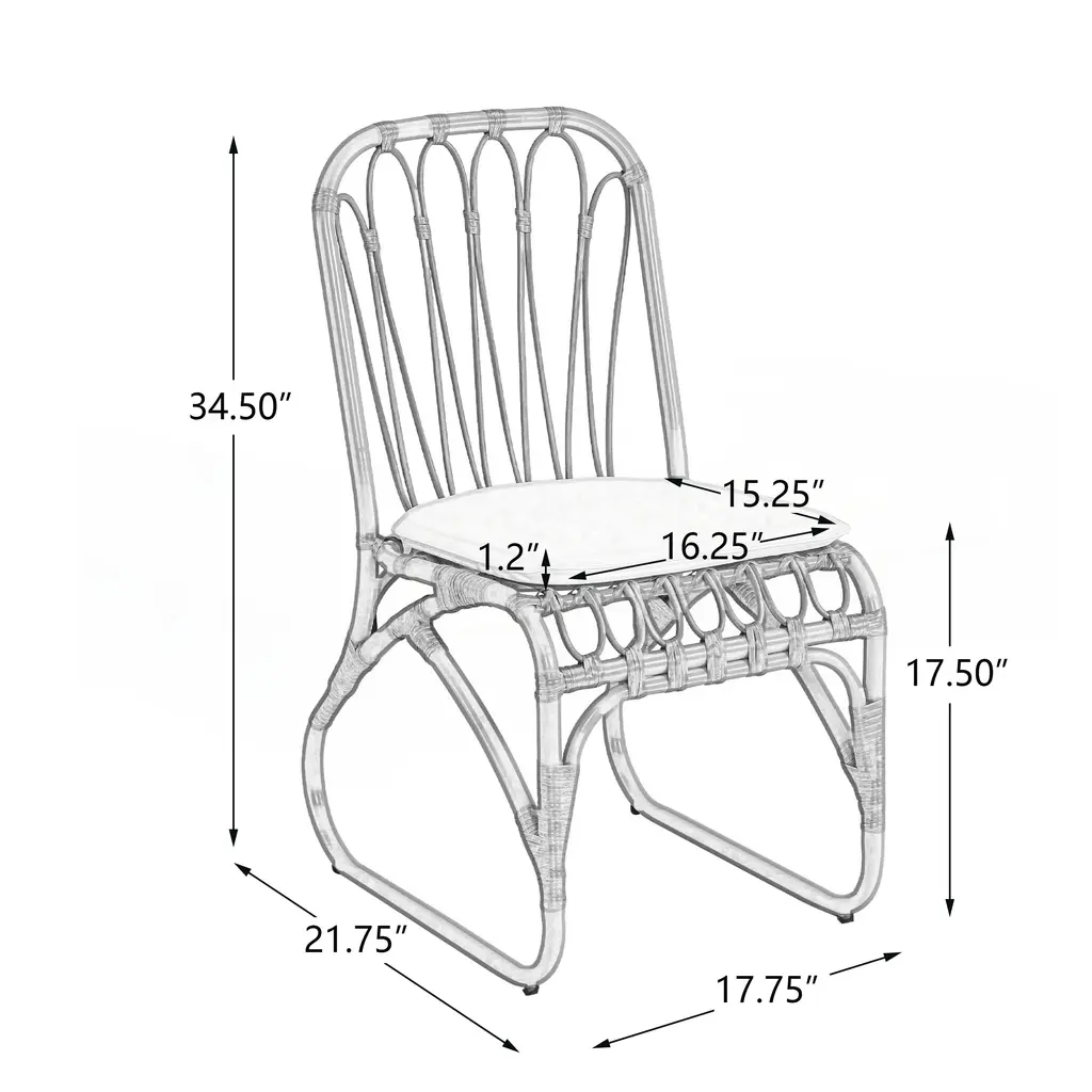 Premium Outdoor Rattan Chair - Elegant & DurableKey Features 1. Handcrafted Durability Reinforced iron frame with rust-resistant coating (400 lb capacity) Handwoven PE rattan withstands UV rays and -4°F to 122°F temperatures Adjustable foot pads (±0.8") for stability on uneven surfaces 2. Comfort & Convenience Component Specification Cushions 1.2" thick with zippered, machine-washable polyester covers Design Petal-shaped backrest for ergonomic support Maintenance Wipe-down frame + removable cushions for easy cleaning 3. Ready-to-Use Design Fully assembled - no tools required Dual-color option (black frame + grey/white rattan) Ultralight 10.47 lbs - easy to reposition Specifications Dimensions: 17.75"W × 21.75"D × 34.50"H Seat Height: 17.5" (standard dining chair height) Best For: Compact balconies, bistro sets, poolside Style Tip: Pair with marble-top side tables for modern contrast. (Note: PE rattan develops a subtle sheen with use) Care Instructions Monthly dust rattan with soft brush Store cushions indoors during heavy rain Avoid petroleum-based cleaners Set Includes 2 chairs + 2 cushions User manual