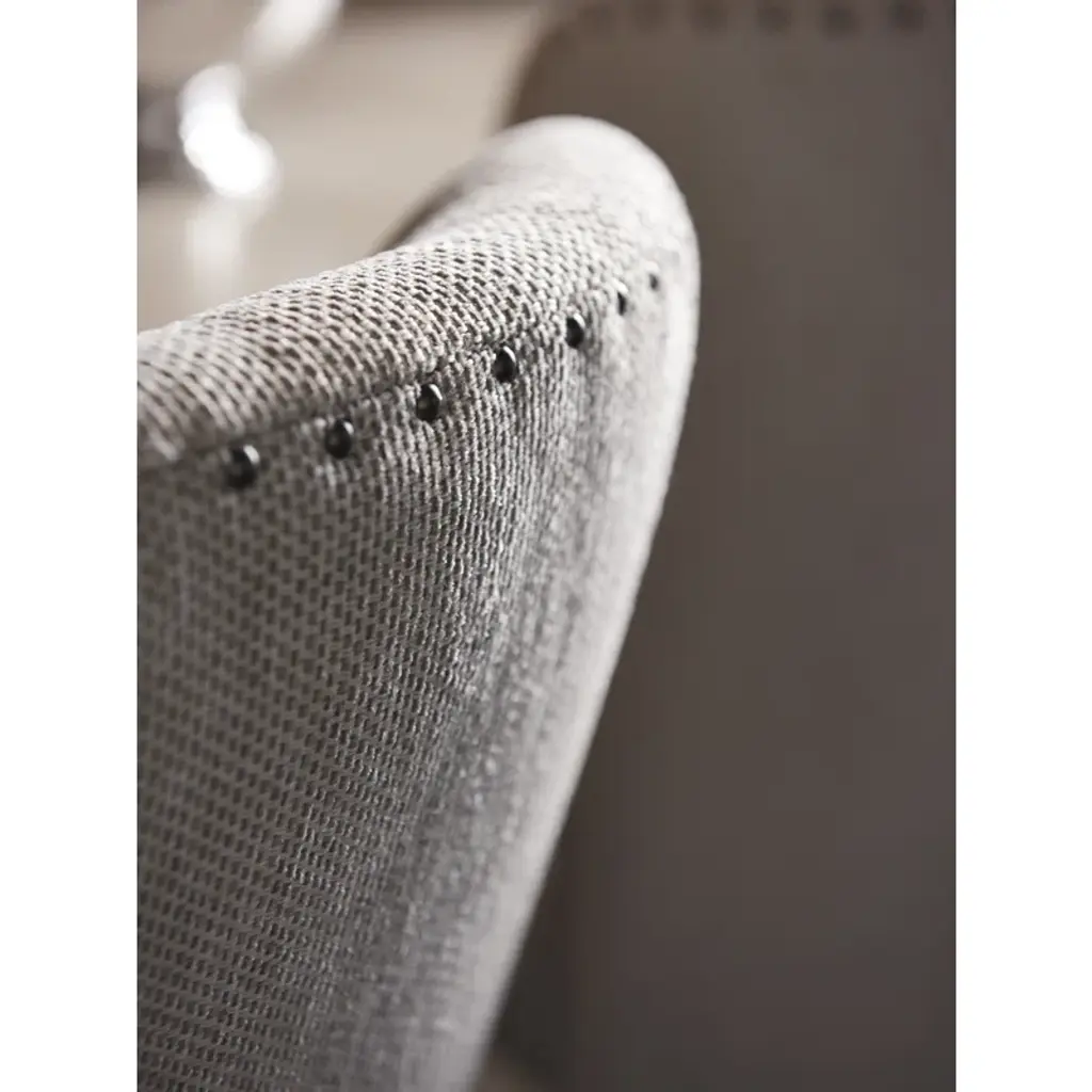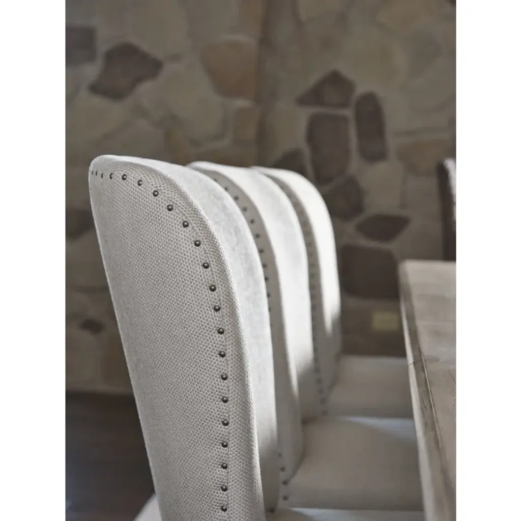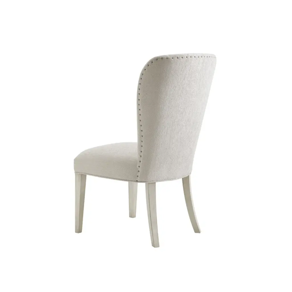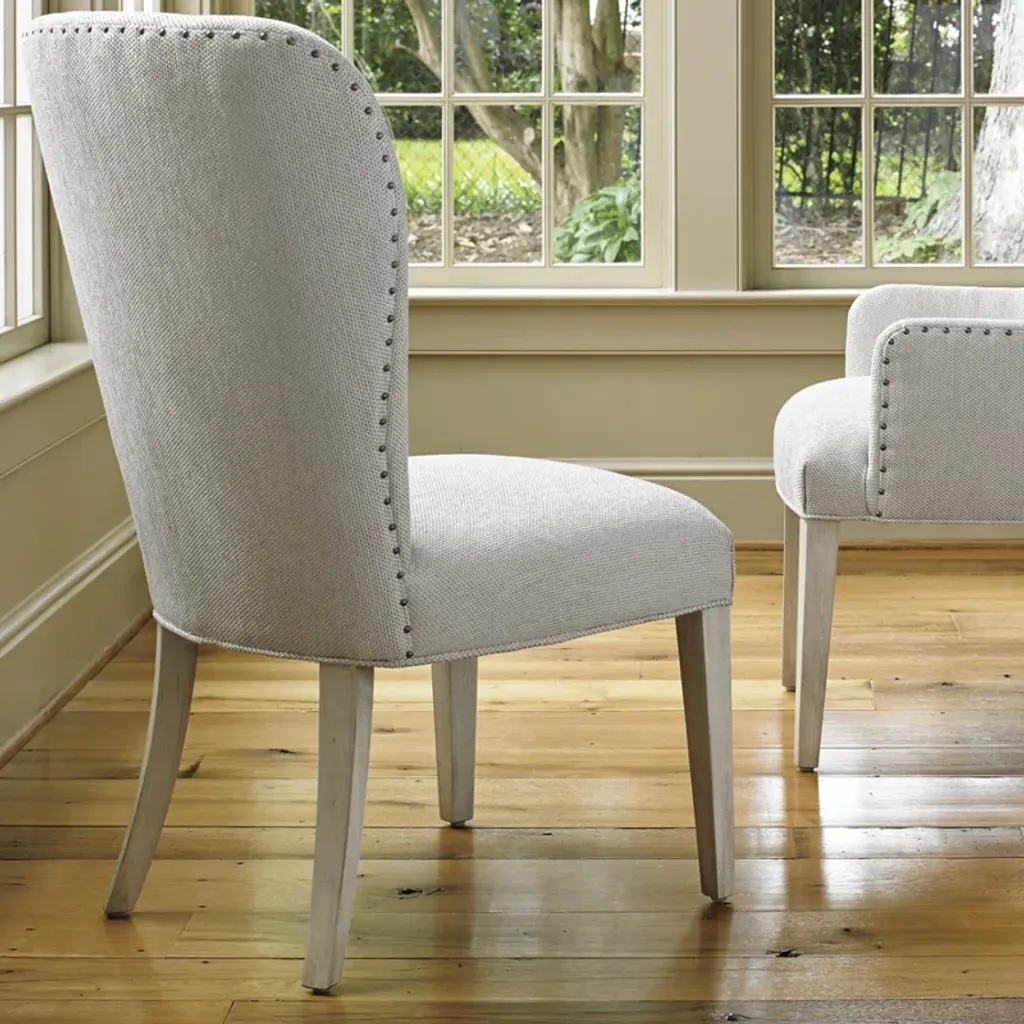 Apply any Lexington upholstery fabric or your custom fabric to create a chair that reflects your style. The tapered legs and a gently curved back are highlighted by decorative nailhead trim and finished in a gently distressed light oyster shell finish.