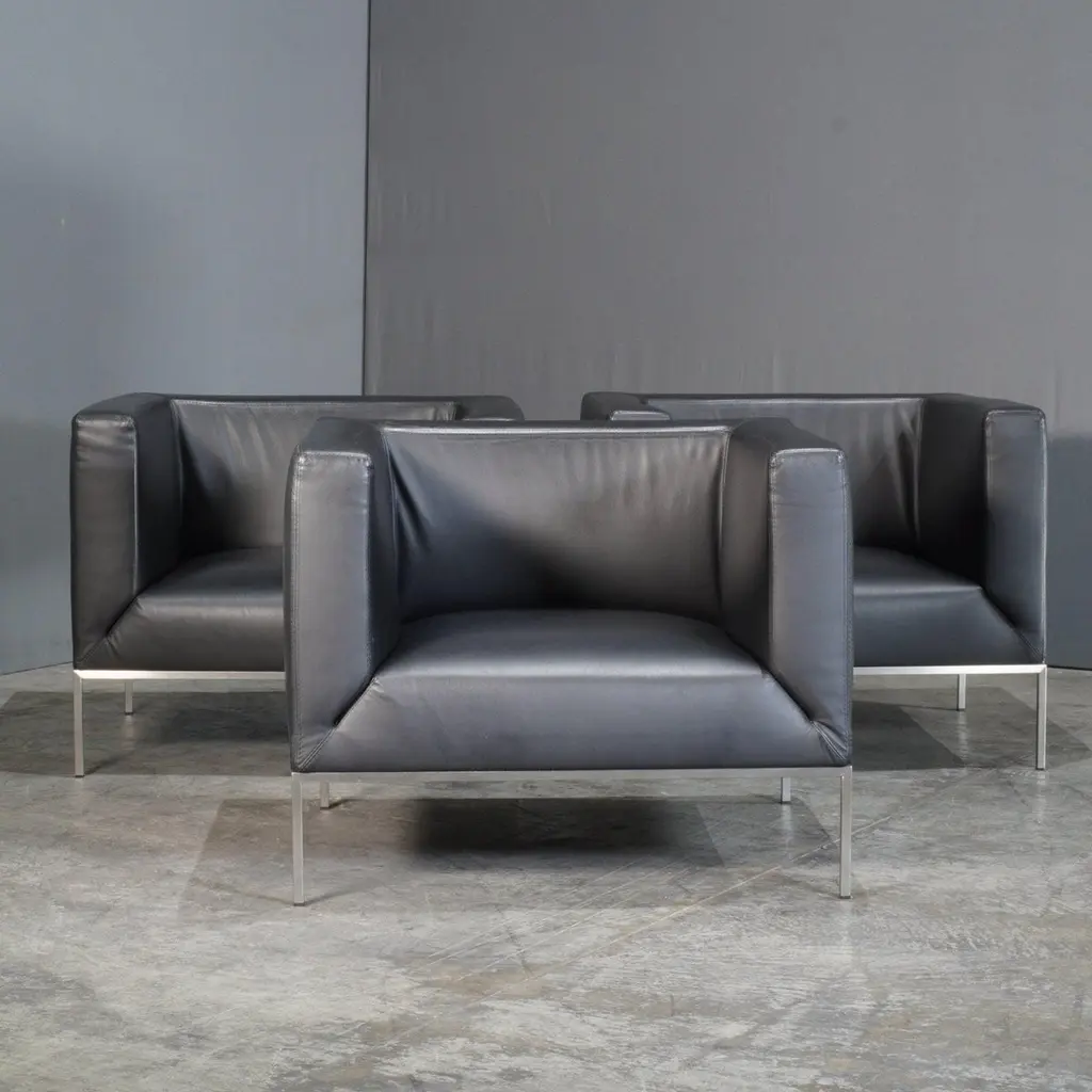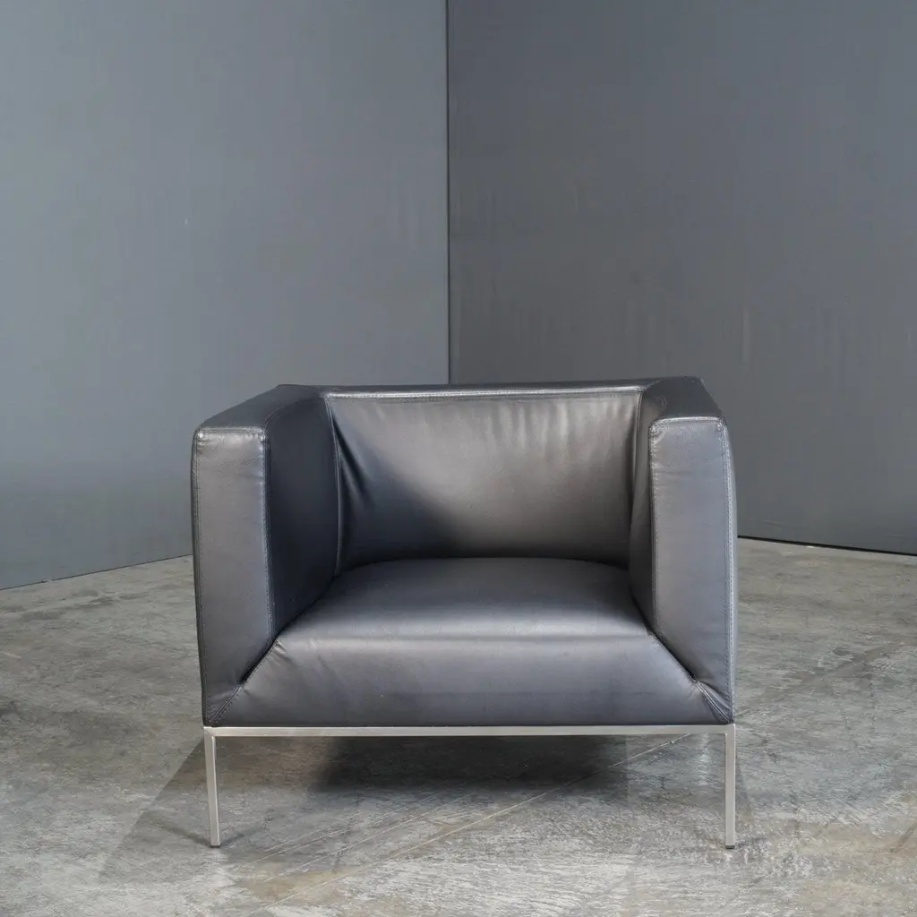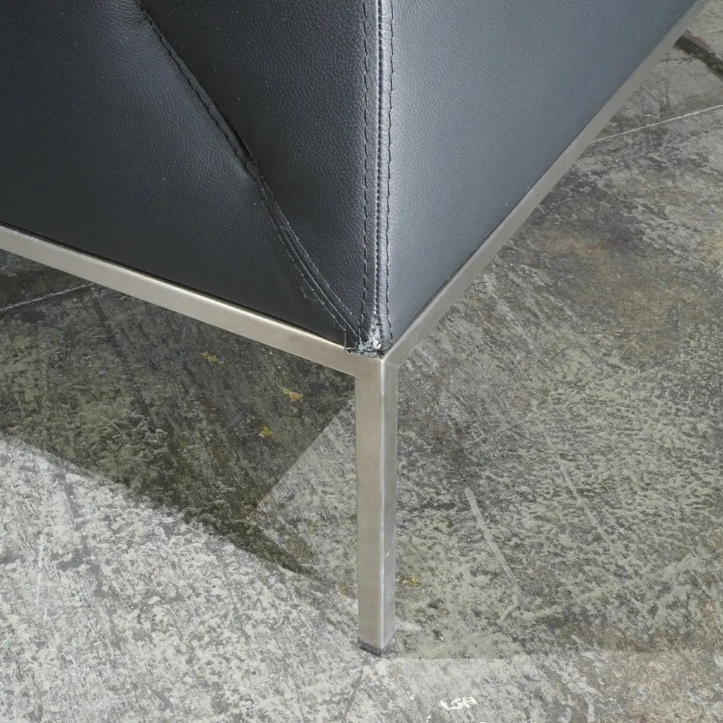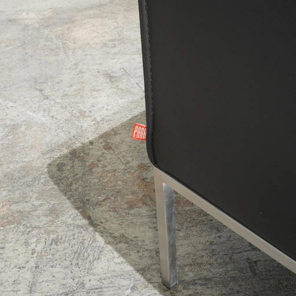 The Paari Design Black Leather Armchair offers a sleek and minimalistic look, designed for modern interiors. Its angular silhouette is complemented by plush, deep cushioning, providing exceptional comfort. Upholstered in premium black leather, the chair features clean lines, supported by polished stainless-steel legs, giving it a floating effect. The structured design provides both aesthetic appeal and functionality, making it a versatile piece suitable for both residential and commercial spaces. With its refined, contemporary form, this armchair exudes sophistication and elegance, an ideal statement piece for any luxury setting, enhancing the ambience of a modern or minimalist interior.