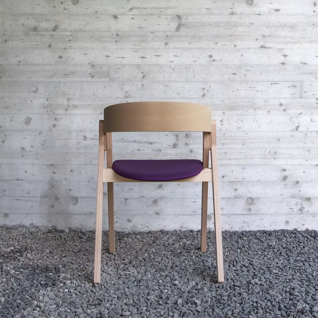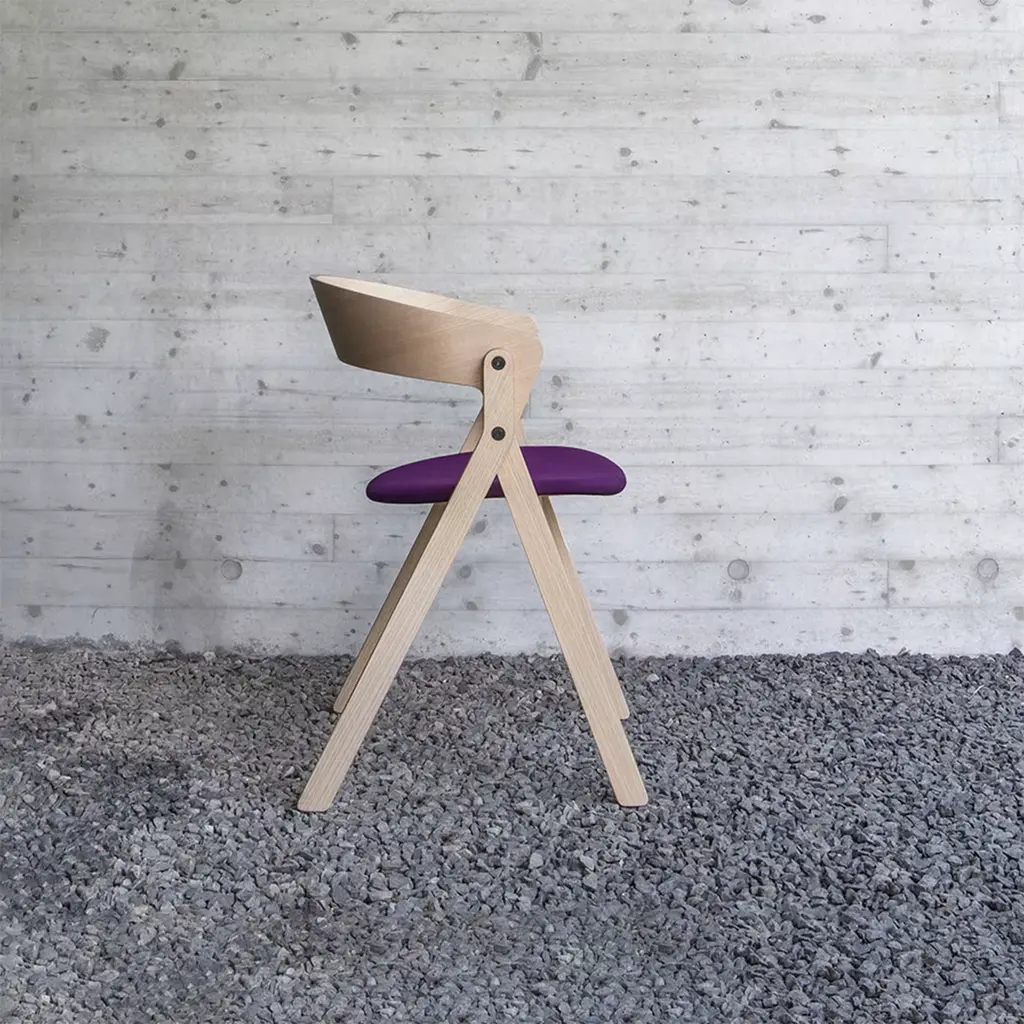 A striking contrast between the rich violet Topia fabric seat and the natural ash frame defines this exquisite chair. Meticulously crafted, this design features an innovative A-shaped profile, seamlessly integrating the backrest with the leg structure. Made from formaldehyde-free veneered plywood, it balances unique geometry with sustainable materials. Complete with four bolts for easy disassembly and part replacement, it offers both enduring elegance and practicality.