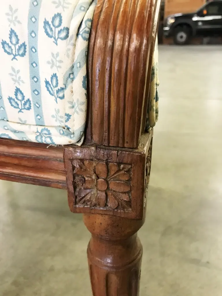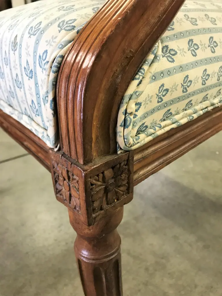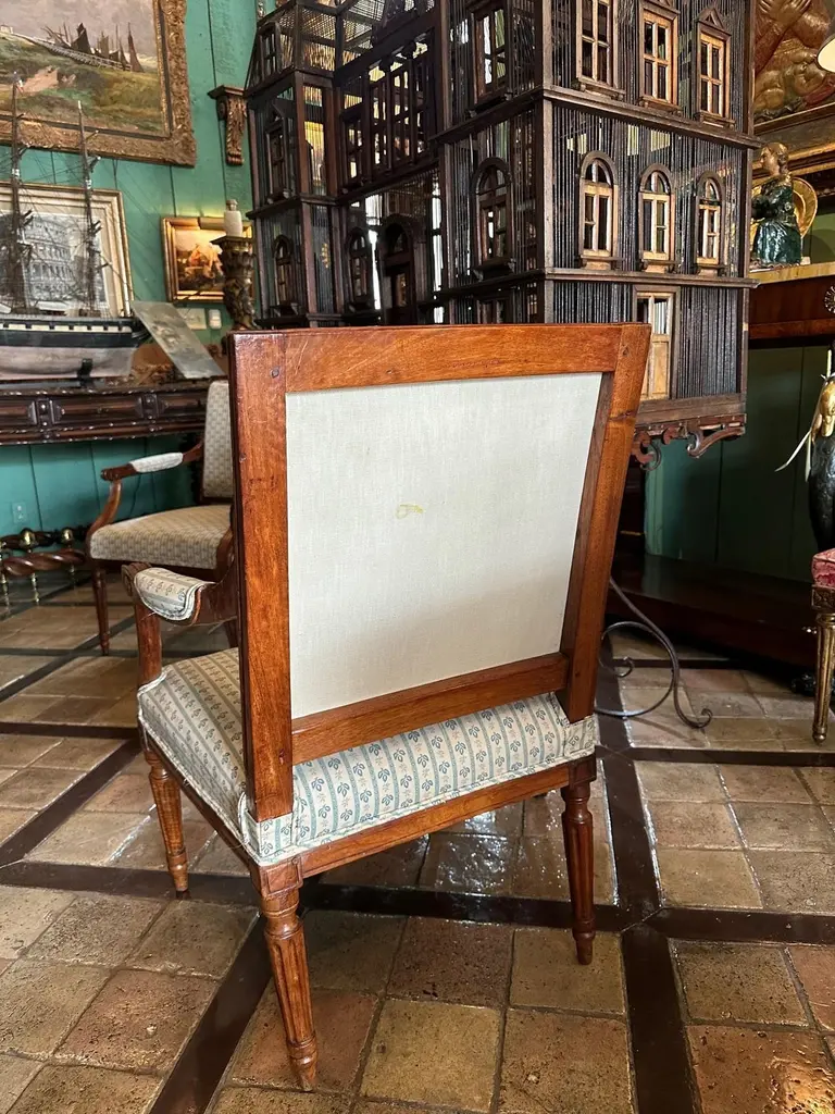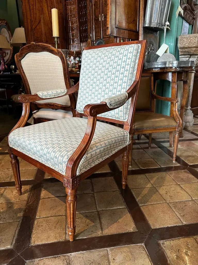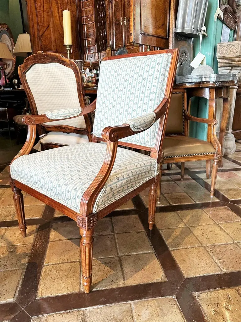 Pair Antique Armchairs Louis XVI Fauteuils in Walnut Dining Entrance Side chairs. Two chairs out of a (Set of Six total) important 18th century Louis XVI of the Period French Chairs. Carved beautifully in Walnut and a fantastic patina. Upholstered in light cream and blue fabric. Each chair is raised by fine and uniquely shaped circular fluted legs below carved block rosettes.At the frieze is a most decorative carved pattern simple lines which extends around the sides and the back. They could be used as side chairs in different parts of the house. Bedroom chairs, as vanity chairs, hallway chairs, in a dining room, corner chairs, side chair. Typical campagne Normandie Chateau furniture. Antique Dealer Los Angeles, West Hollywood Melrose Ave, La Cienega Blvd. High end dining room chairs with beautiful carving all around. They are of the Period of the 18th Century, the attention to details is outstanding. Could make a great gift for a house warming. The perfect accent to add a touch of history and love to your home.