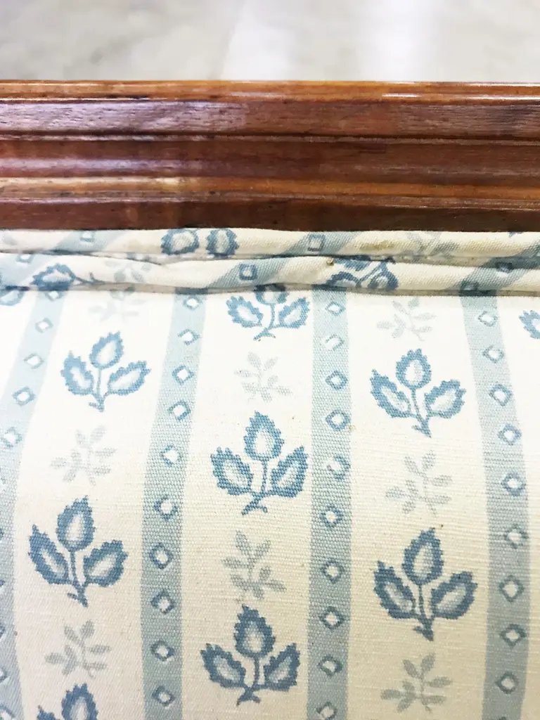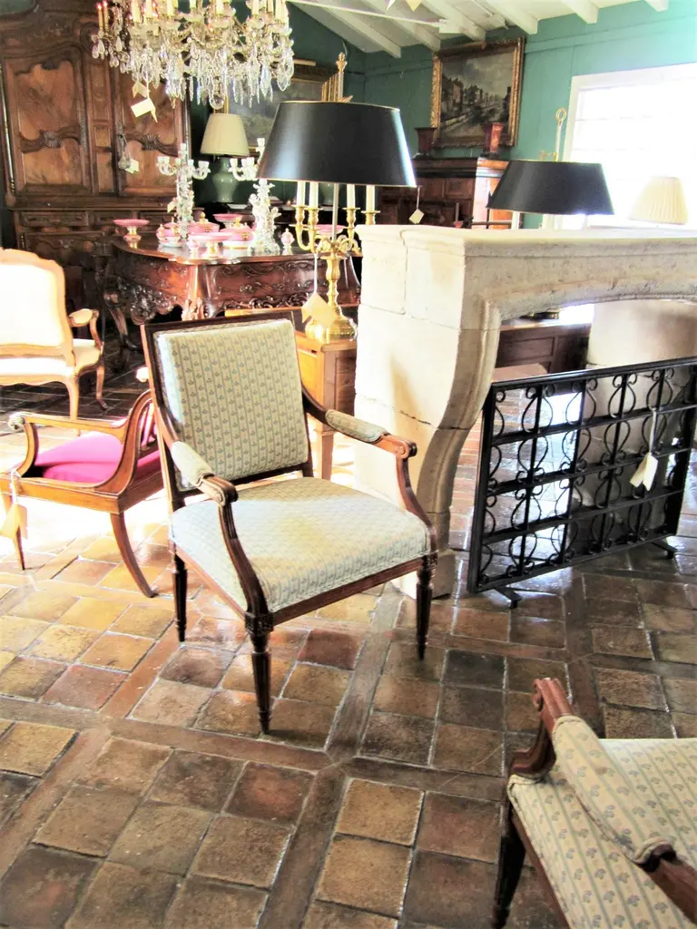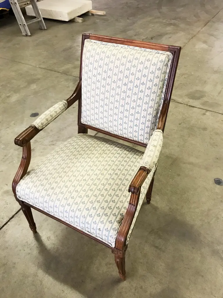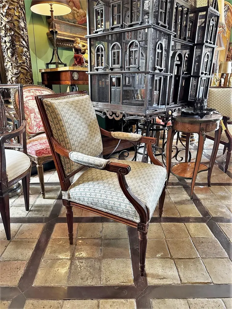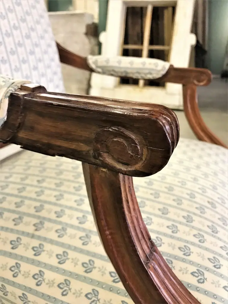 Pair Antique Armchairs Louis XVI Fauteuils in Walnut Dining Entrance Side chairs. Two chairs out of a (Set of Six total) important 18th century Louis XVI of the Period French Chairs. Carved beautifully in Walnut and a fantastic patina. Upholstered in light cream and blue fabric. Each chair is raised by fine and uniquely shaped circular fluted legs below carved block rosettes.At the frieze is a most decorative carved pattern simple lines which extends around the sides and the back. They could be used as side chairs in different parts of the house. Bedroom chairs, as vanity chairs, hallway chairs, in a dining room, corner chairs, side chair. Typical campagne Normandie Chateau furniture. Antique Dealer Los Angeles, West Hollywood Melrose Ave, La Cienega Blvd. High end dining room chairs with beautiful carving all around. They are of the Period of the 18th Century, the attention to details is outstanding. Could make a great gift for a house warming. The perfect accent to add a touch of history and love to your home.