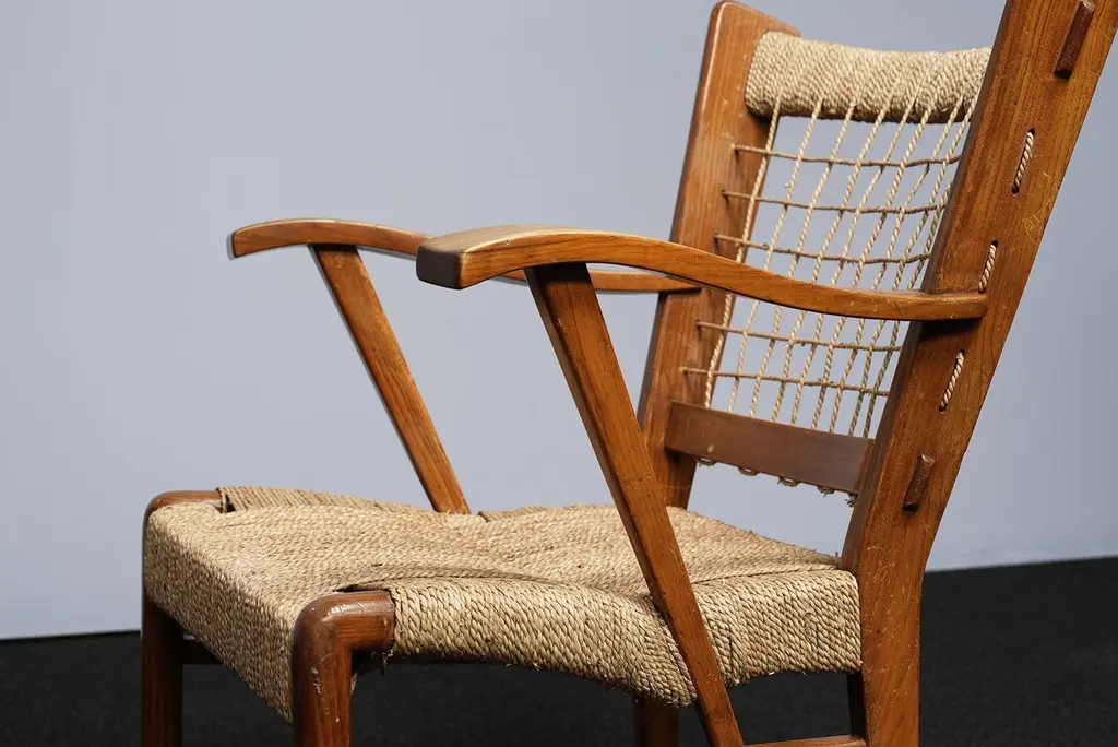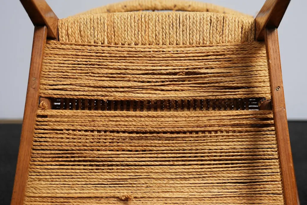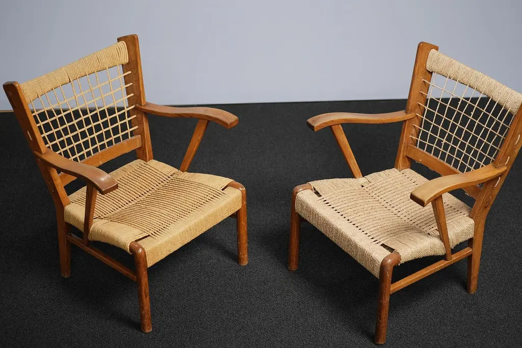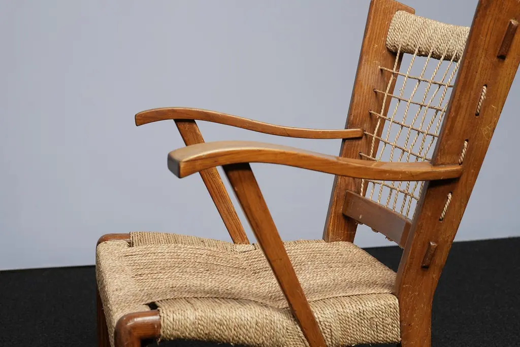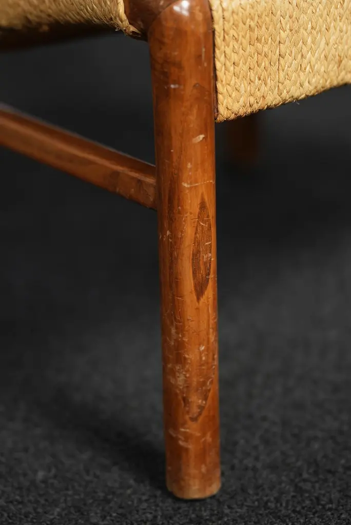 A fabulous and comfortable set of Guglielmo armchairs! Truly for the collector who enjoys these rare finds in furniture. They are being sold as a pair but one had the rush re-done at some point so they are not a perfect match in that respect but this is not a very noticeable detail. They also have not been re-finished so the surface of the wood has wear to them and should be carefully looked at. We have not refinished them because some collectors like them in this condition. We are open to refinishing them as well and one could choose their stain color with us in doing so. Considered one of Italy’s leading mid-century modernists, Guglielmo’s innovative furniture designs were praised around the world. Our featured armchairs by Italian designer Pecorini Guglielmo, who was recognized for his contributions to mid-century modern furniture design, display the designers distinctive style. Pecorini’s hallmark was to use a combination of materials such as wood, metal, fabric, twine, and rubber, showcasing a blend of functionality and aesthetic appeal.