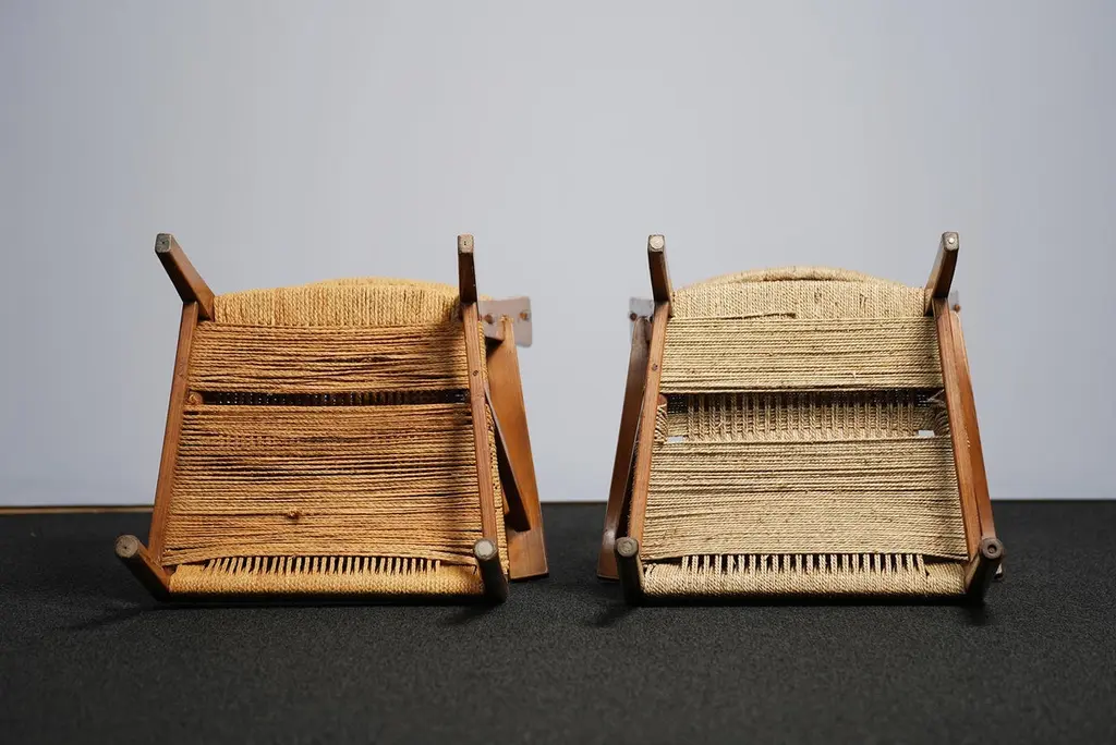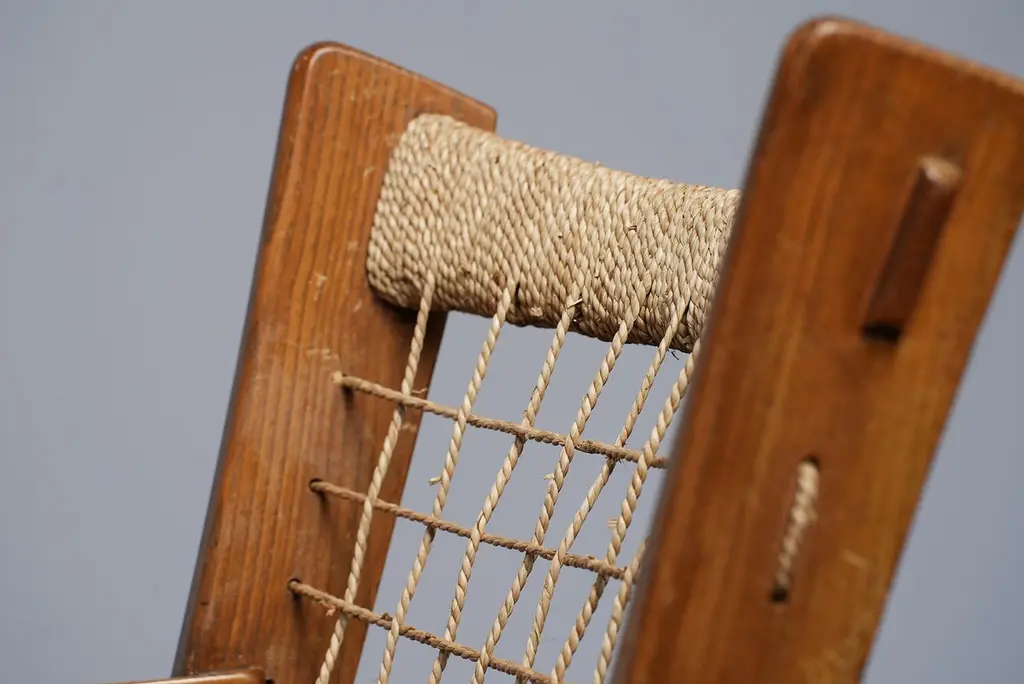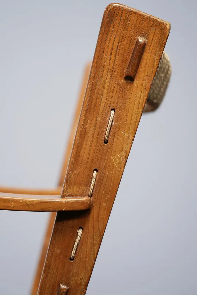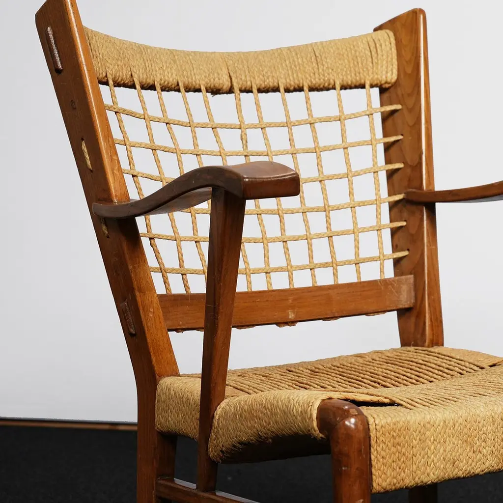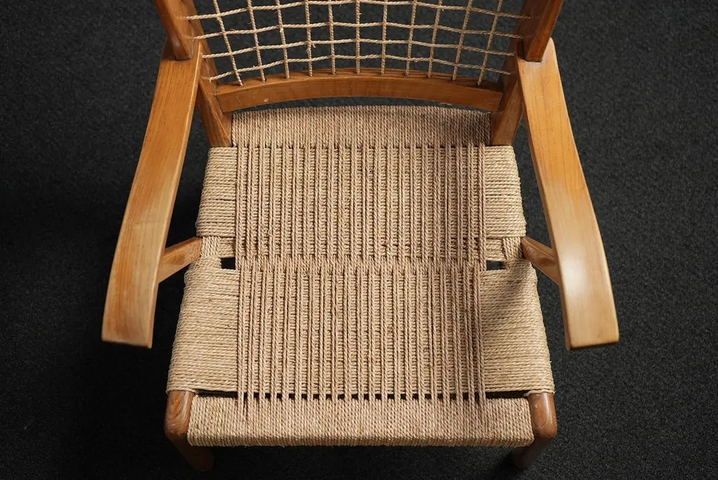 A fabulous and comfortable set of Guglielmo armchairs! Truly for the collector who enjoys these rare finds in furniture. They are being sold as a pair but one had the rush re-done at some point so they are not a perfect match in that respect but this is not a very noticeable detail. They also have not been re-finished so the surface of the wood has wear to them and should be carefully looked at. We have not refinished them because some collectors like them in this condition. We are open to refinishing them as well and one could choose their stain color with us in doing so. Considered one of Italy’s leading mid-century modernists, Guglielmo’s innovative furniture designs were praised around the world. Our featured armchairs by Italian designer Pecorini Guglielmo, who was recognized for his contributions to mid-century modern furniture design, display the designers distinctive style. Pecorini’s hallmark was to use a combination of materials such as wood, metal, fabric, twine, and rubber, showcasing a blend of functionality and aesthetic appeal.
