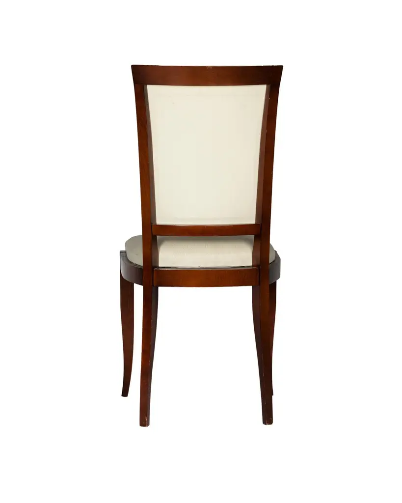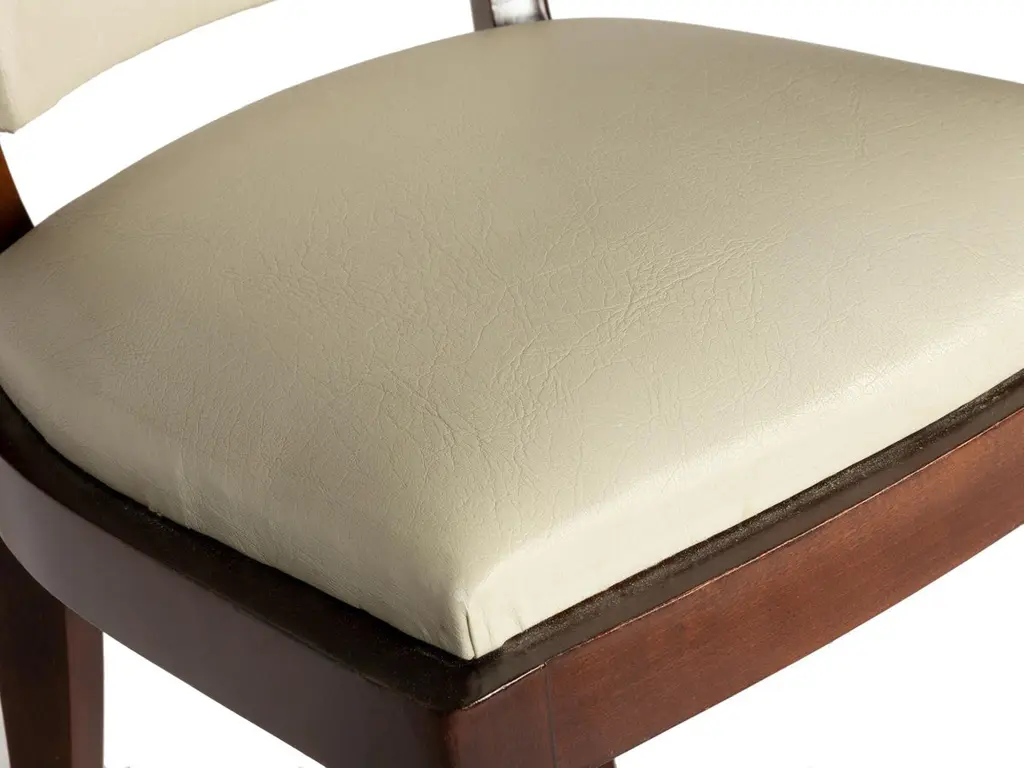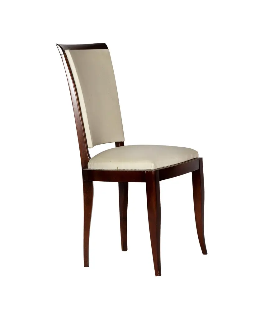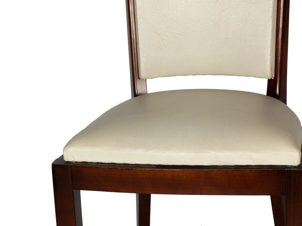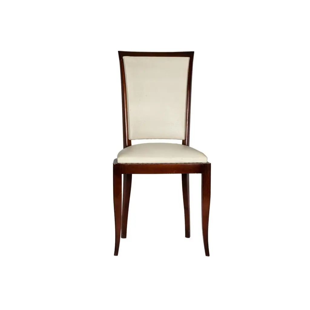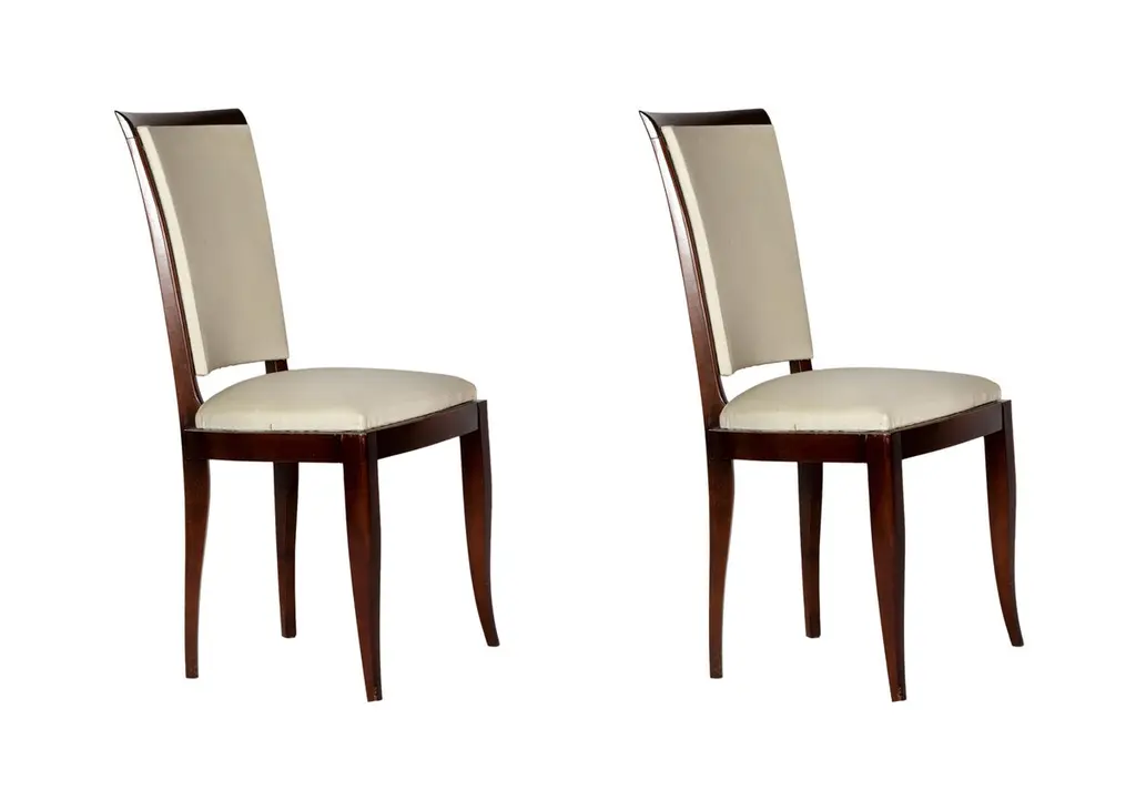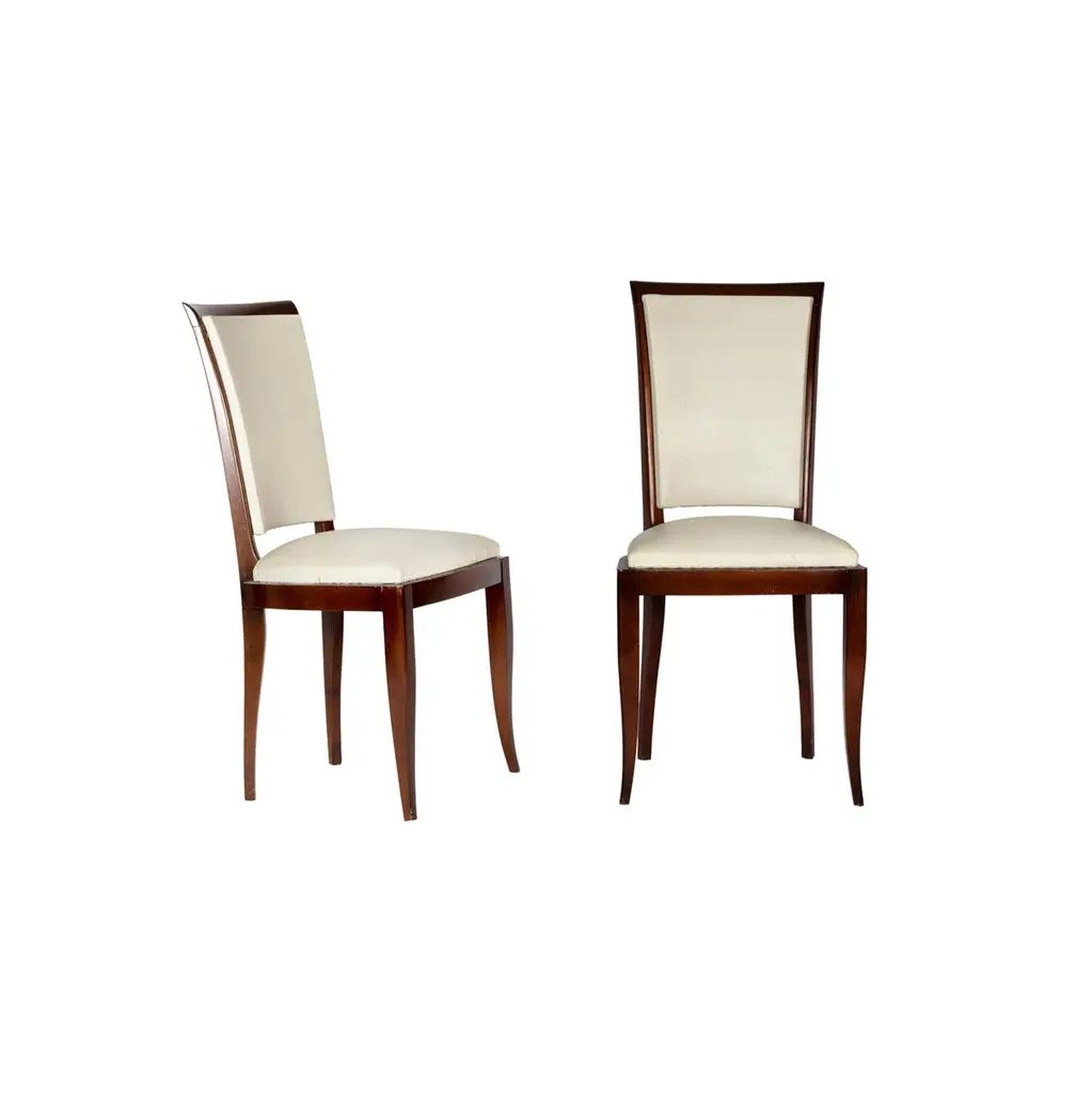 A very elegant pair of dining room chairs in white vinyl and polished wood finish. In excellent condition, recently revised by an expert ebanist.Take into account that the colors on the items may vary depending on the type of lighting and the type of screen from which you see the images.