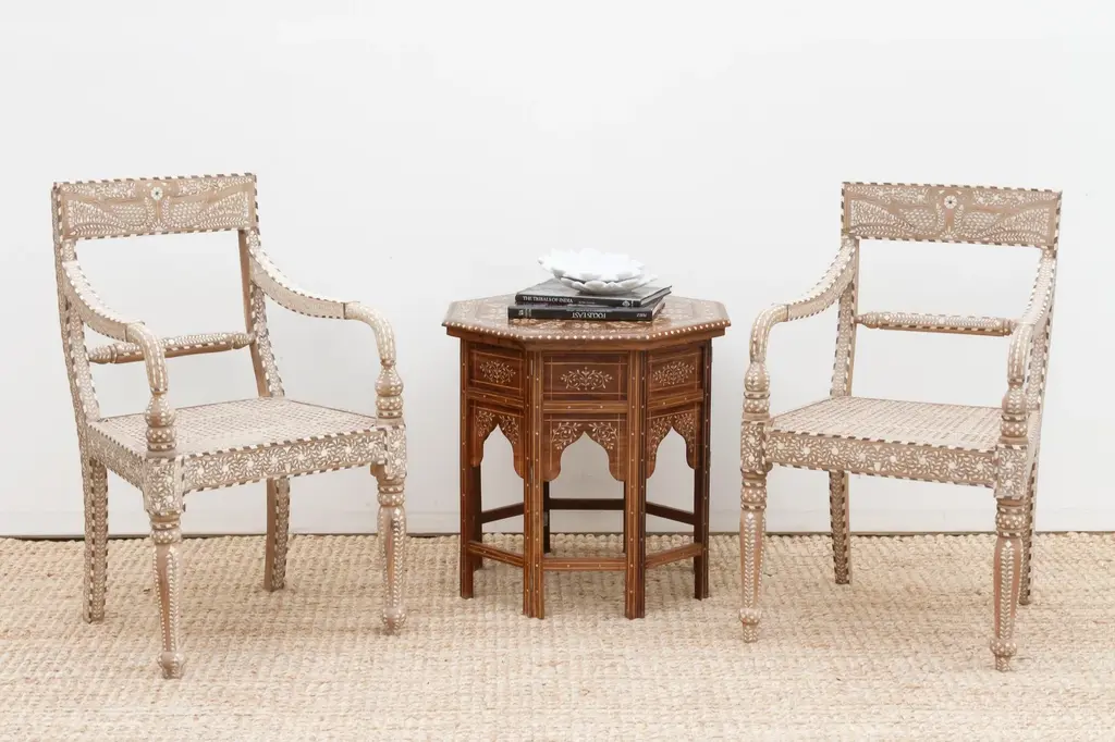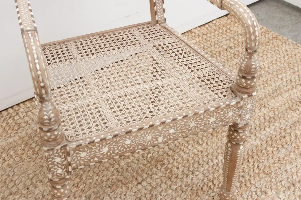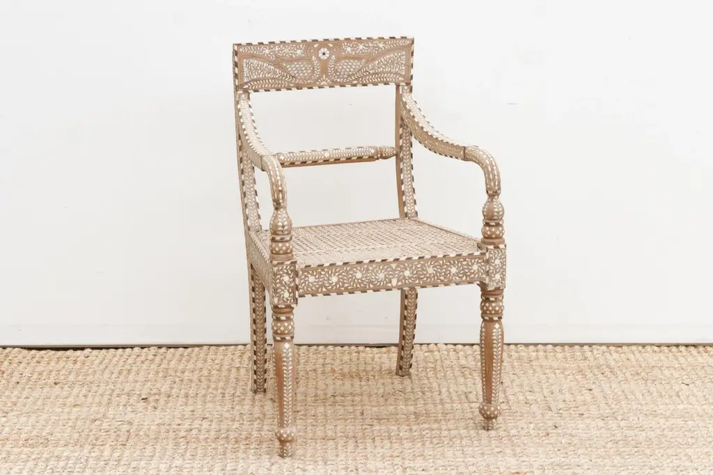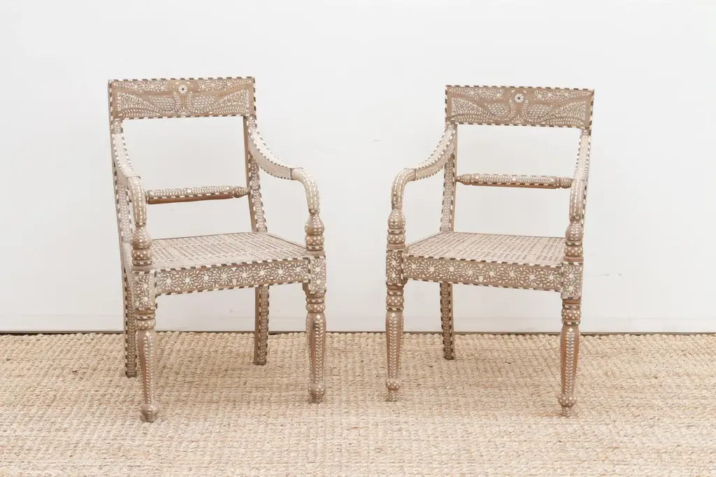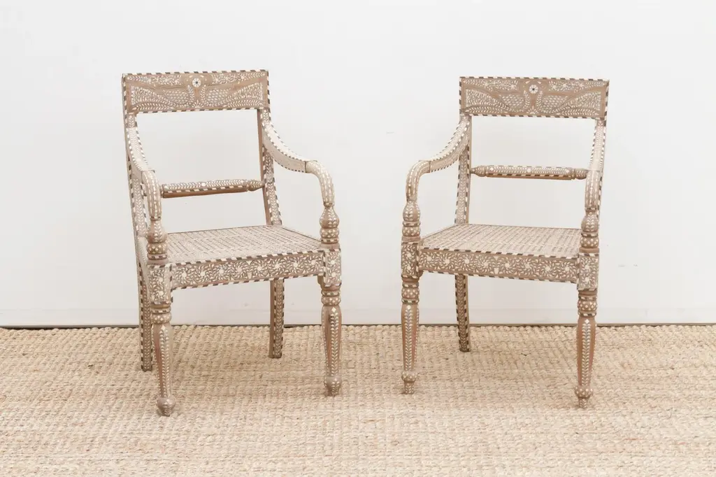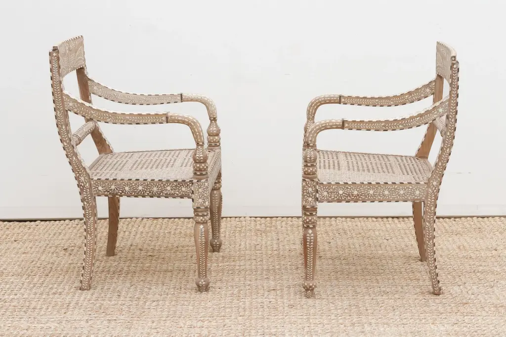 Enhance your living space with this elegant pair of Anglo Indian inlaid armchairs, each featuring a comfortable and breathable cane seat and back. The meticulously handcrafted frames are adorned with delicate inlay work, characteristic of the refined style favored during the British Colonial era in India. The sweeping, curved armrests and intricate inlay patterns that grace the backrests, arms, and turned legs speak to a tradition of skilled artistry. Not all inlay is created equal; these armchairs showcase the labor-intensive nature of this artisanal work, with each tiny fragment precisely cut and hammered into the carved wood. This elegant pair of chairs are perfect for creating a sophisticated seating arrangement adding them to your dining table or living room. **Please bear in mind that colors of products shown may vary slightly from their original color due to monitor display settings or photography studio.