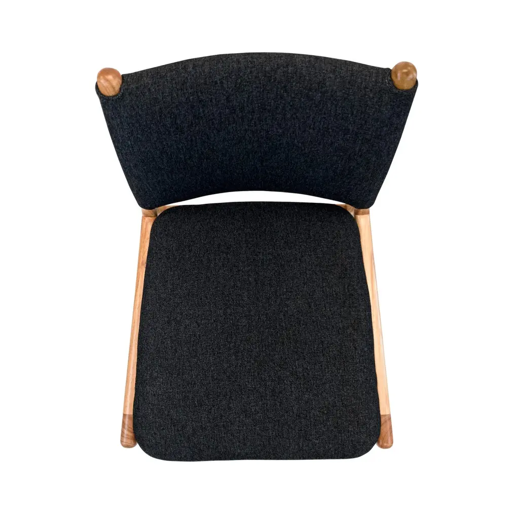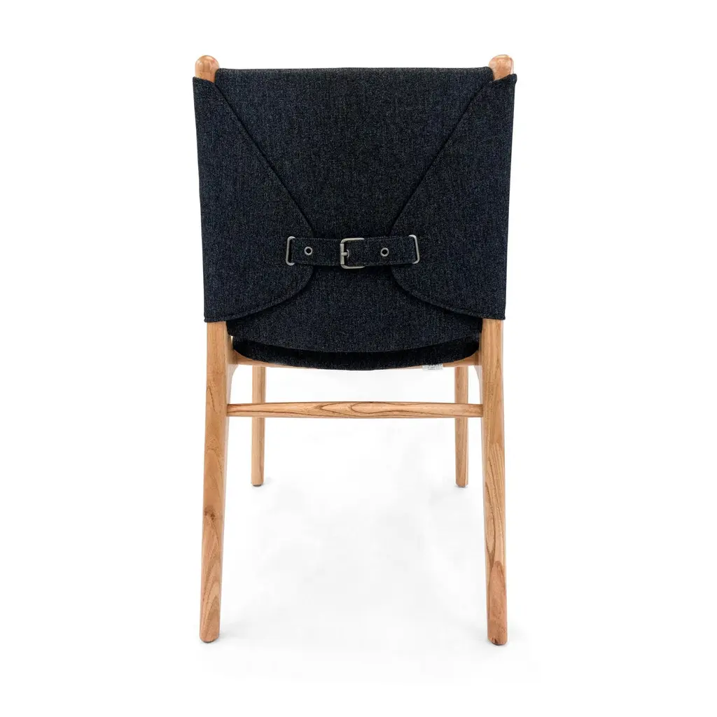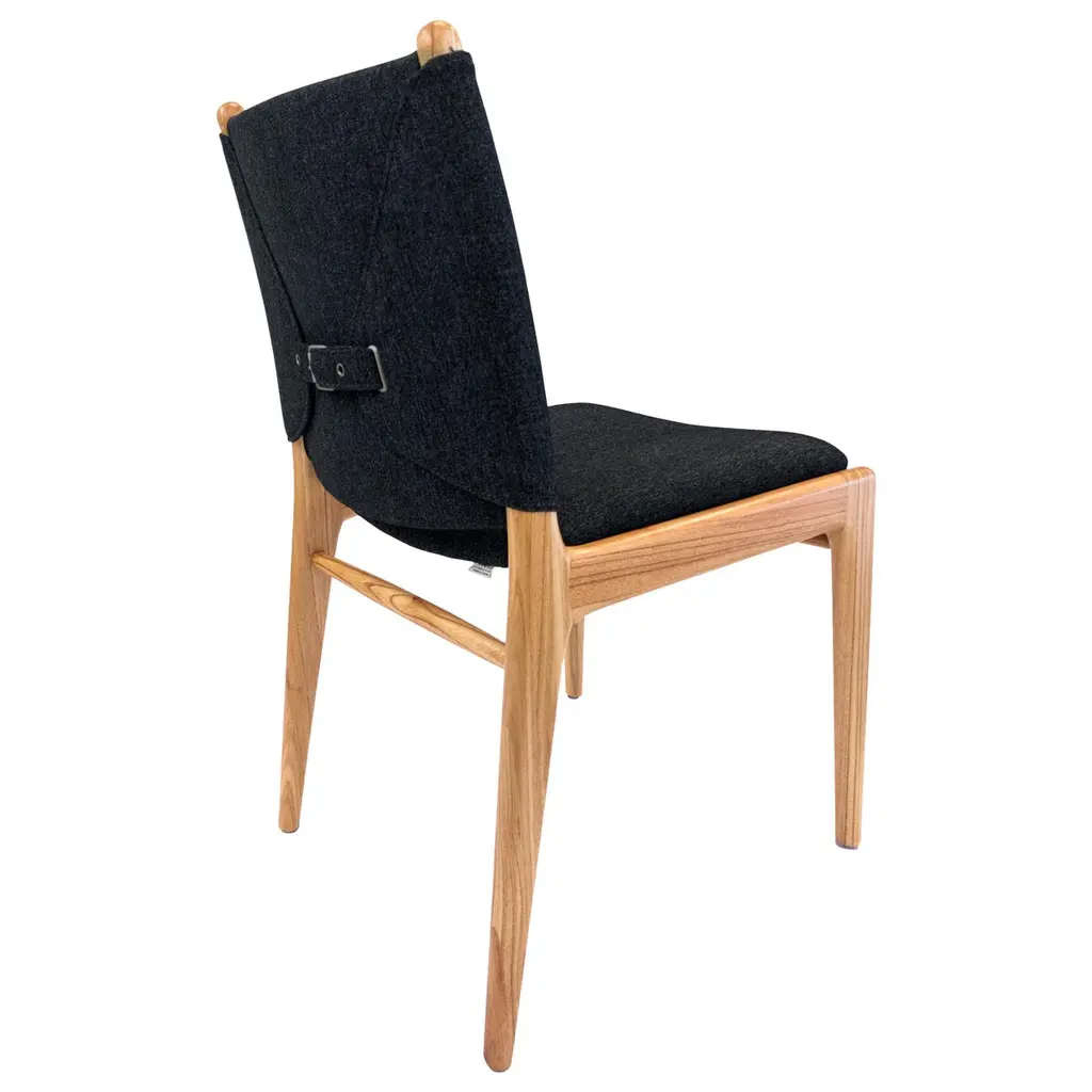 A set of two Cappio dining chairs in Chinaberry finish with black upholstery. This pair of Cappio dining chairs by Uultis Design balances sculptural form with everyday function, making them a refined addition to both residential and commercial spaces. Crafted in solid wood, the frame showcases soft curves and tapered legs that echo midcentury silhouettes, while the structured black upholstery lends a sleek, tailored presence. A unique belted backrest, inspired by a traditional buckle design, defines the rear view—subtle yet striking.Named after the Italian word for “tie,” the Cappio chair offers more than just good looks. It was designed to support long meals and gatherings with ease, offering generous seat cushioning and an ergonomically angled backrest. The black textile cover adds visual weight and contrast while remaining versatile enough to pair with a range of dining tables, including many from the Uultis collection.Arriving fully assembled, this set is made from long-lasting, environmentally conscious materials—part of Uultis’ commitment to quality design and responsible production.