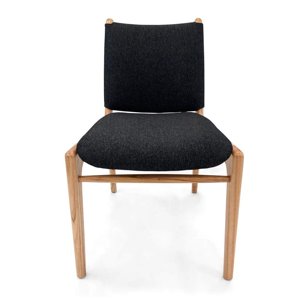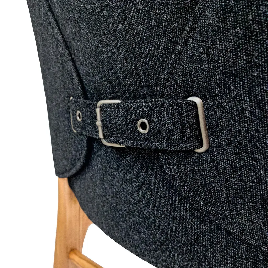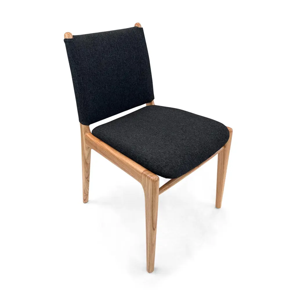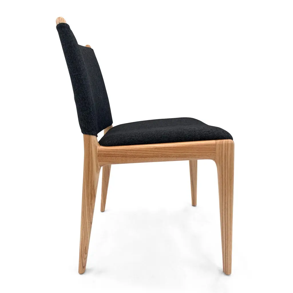 A set of two Cappio dining chairs in Chinaberry finish with black upholstery. This pair of Cappio dining chairs by Uultis Design balances sculptural form with everyday function, making them a refined addition to both residential and commercial spaces. Crafted in solid wood, the frame showcases soft curves and tapered legs that echo midcentury silhouettes, while the structured black upholstery lends a sleek, tailored presence. A unique belted backrest, inspired by a traditional buckle design, defines the rear view—subtle yet striking.Named after the Italian word for “tie,” the Cappio chair offers more than just good looks. It was designed to support long meals and gatherings with ease, offering generous seat cushioning and an ergonomically angled backrest. The black textile cover adds visual weight and contrast while remaining versatile enough to pair with a range of dining tables, including many from the Uultis collection.Arriving fully assembled, this set is made from long-lasting, environmentally conscious materials—part of Uultis’ commitment to quality design and responsible production.